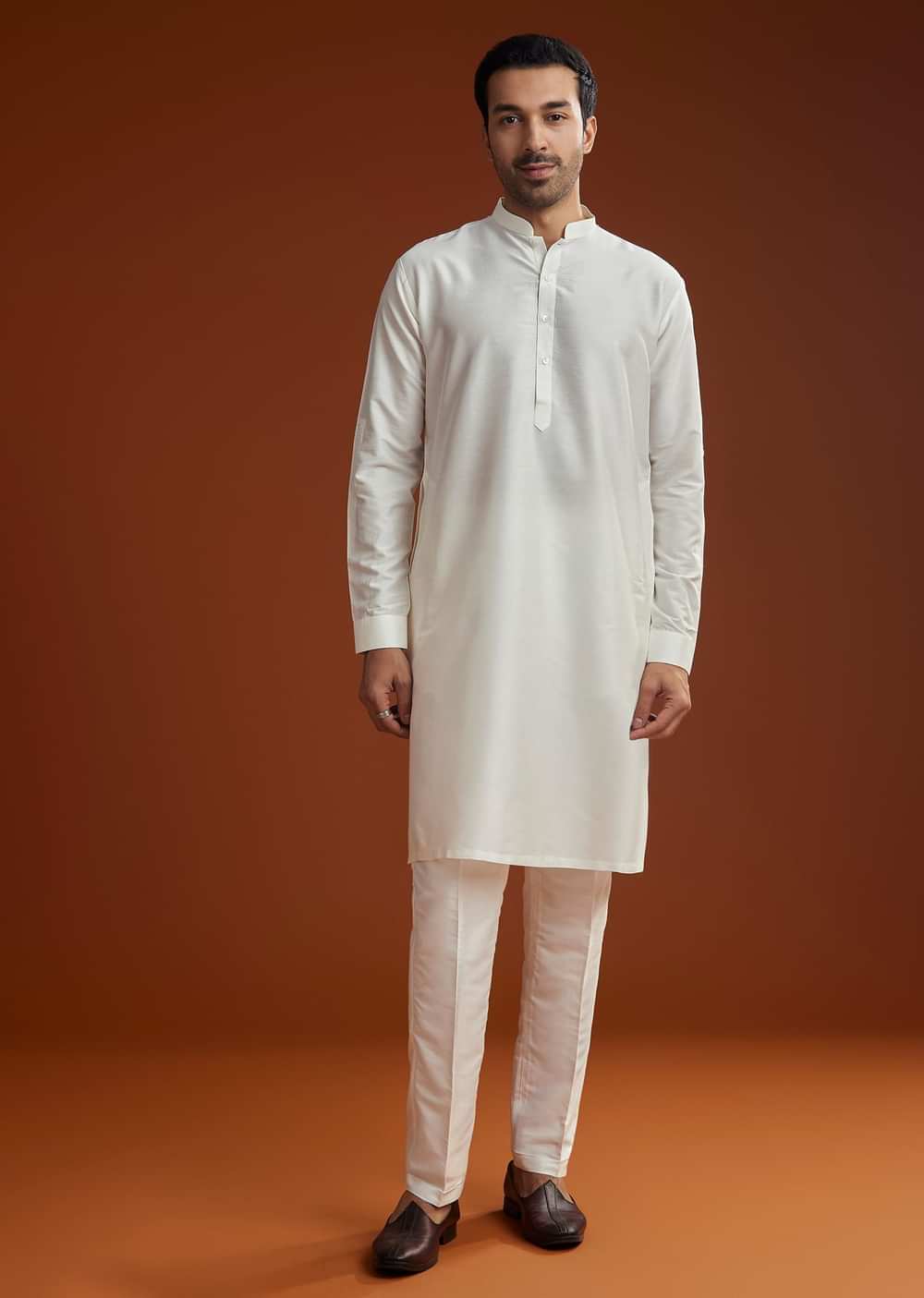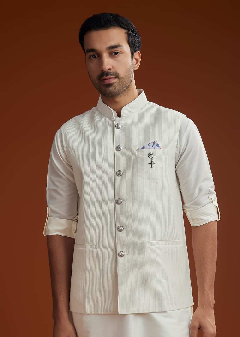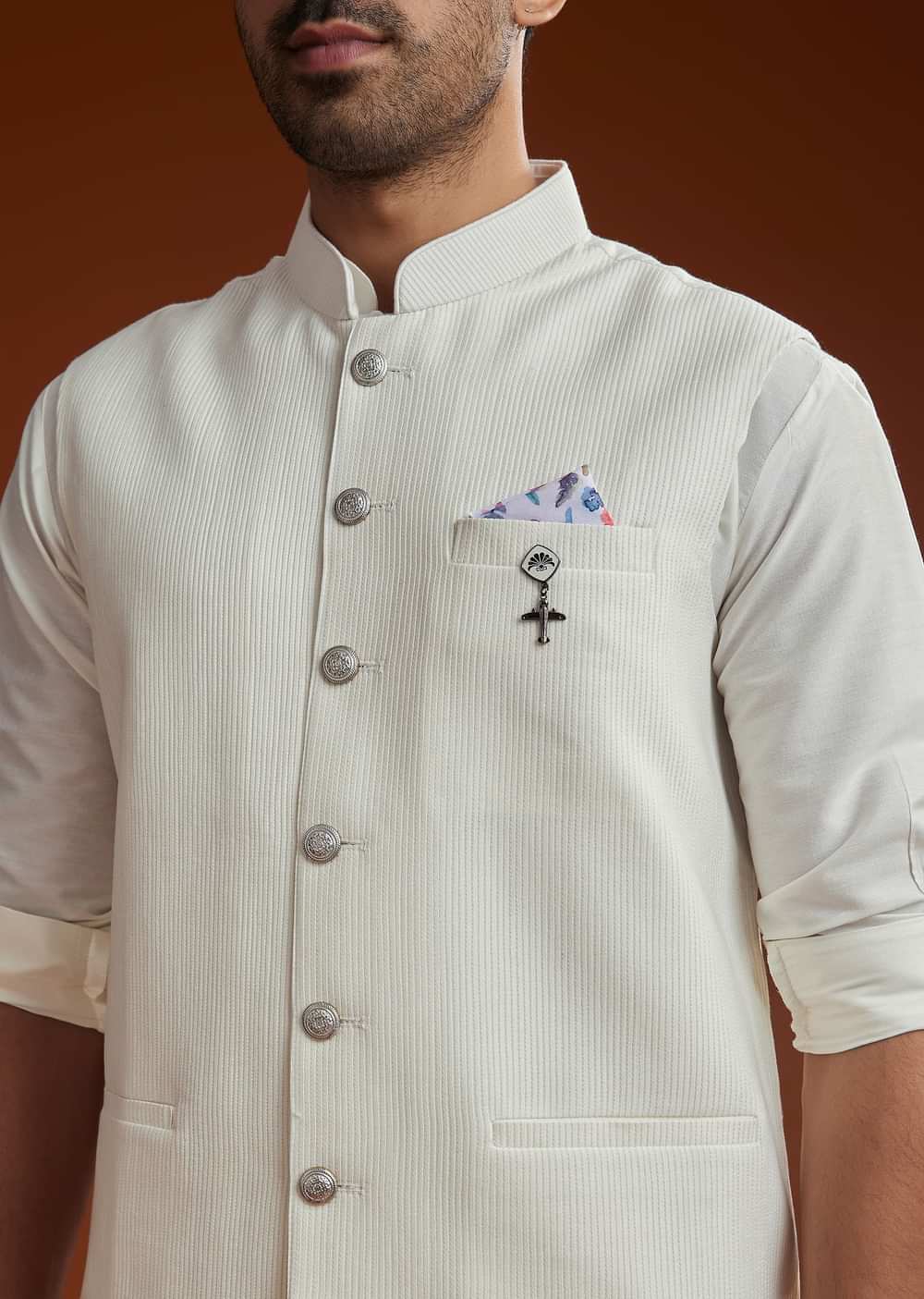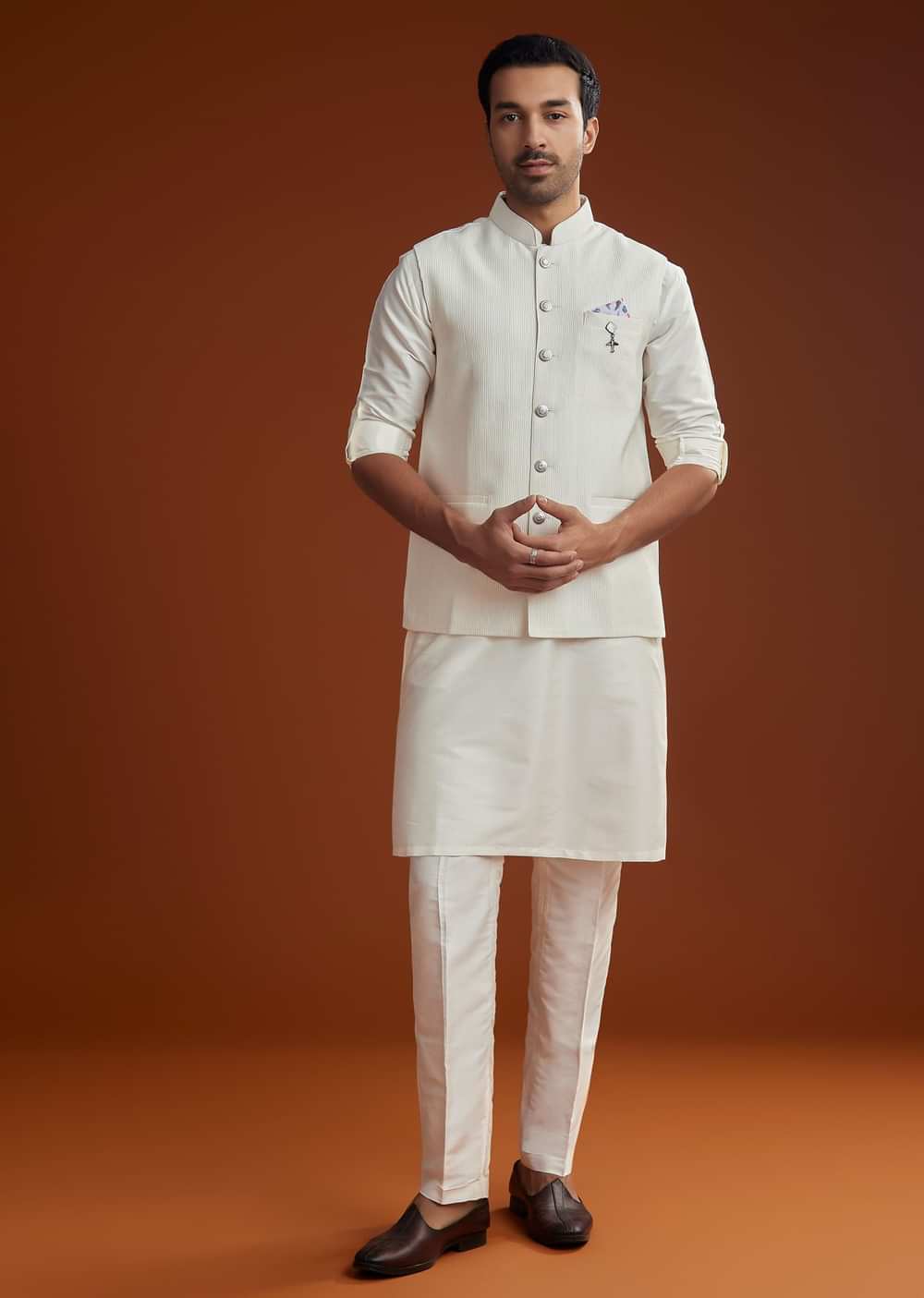 Timeless and graceful this ivory poly silk kurta jacket set features elegant pintucks lending a sleek and refined look. The Mandarin collar full sleeves and front button closure make it a versatile choice for weddings and special celebrations.Awarded as the Most Trusted Brand we're delivering styles you love just as promised.