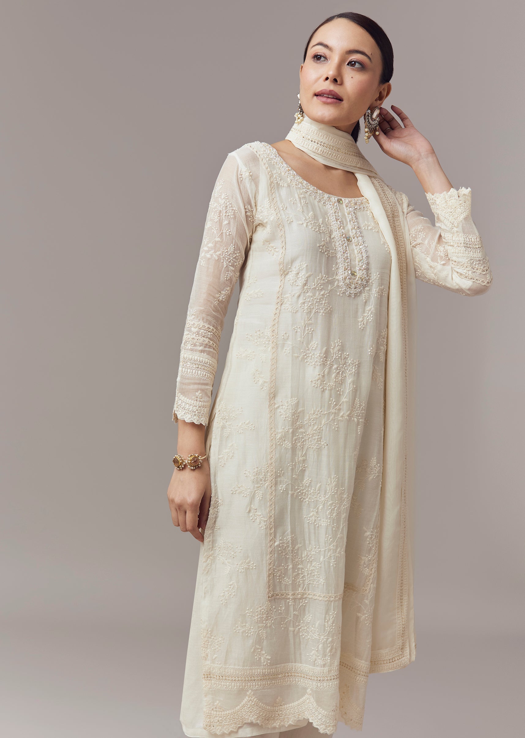 Ivory Kurta Set With Thread Sequins And Moti Work And Dupatta