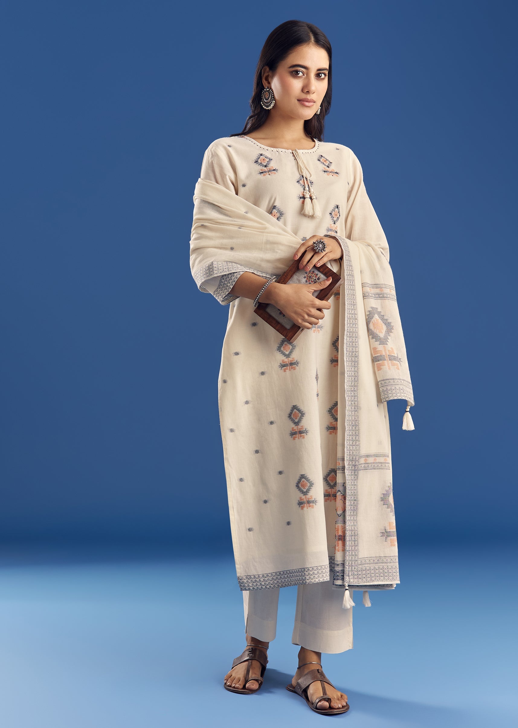 Ivory Mul Cotton Kurta Set With Thread Weaving And Dupatta