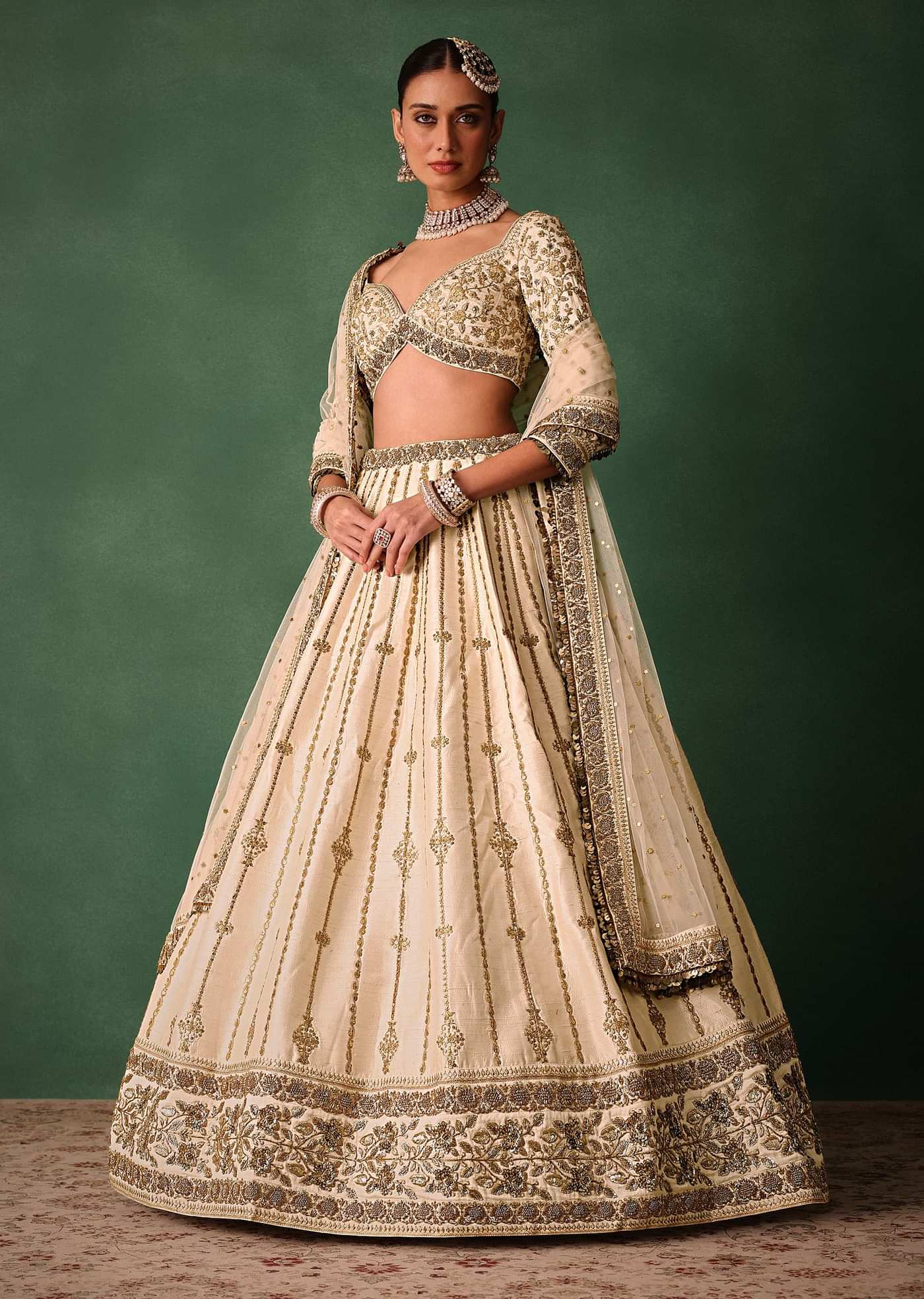 • A graceful ivory raw silk lehenga that highlights the finesse of hand embroidery, this set is designed for those who cherish understated elegance.