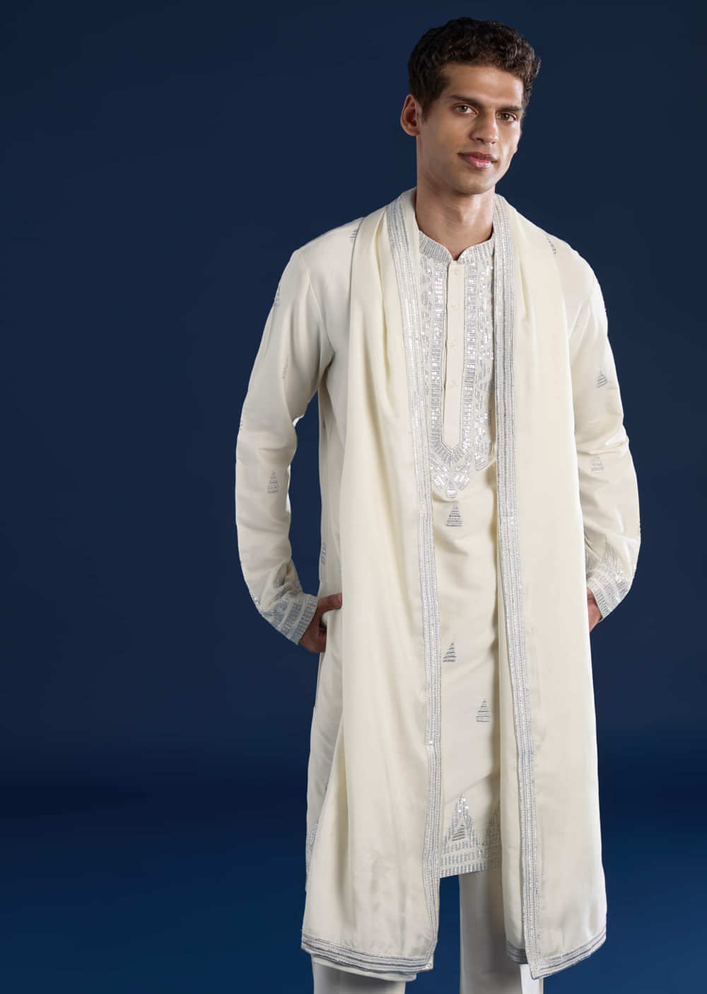 Ivory Sequin Embroidered Mens Kurta Set with Dupatta