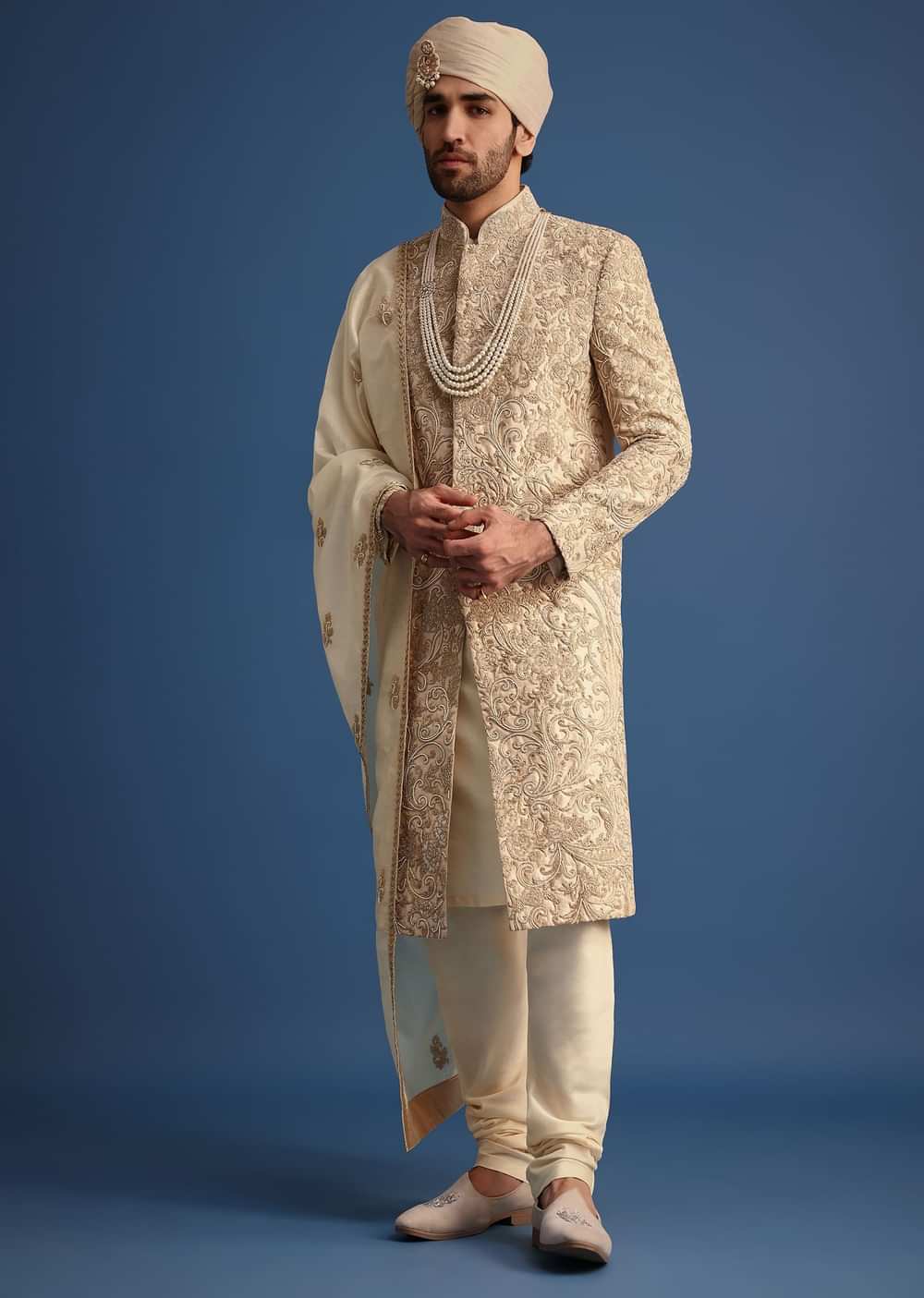Exude sophistication with our Ivory Sherwani Set crafted in rich art silk and intricately embroidered with beads and zari. This regal attire is perfect for the modern groom combining tradition with contemporary elegance to create a timeless look. Perfect for wedding occasions. This ensemble includes a sherwani kurta churidar and a dupatta. Awarded as the Most Trusted Brand, we're delivering styles you love, just as promised.