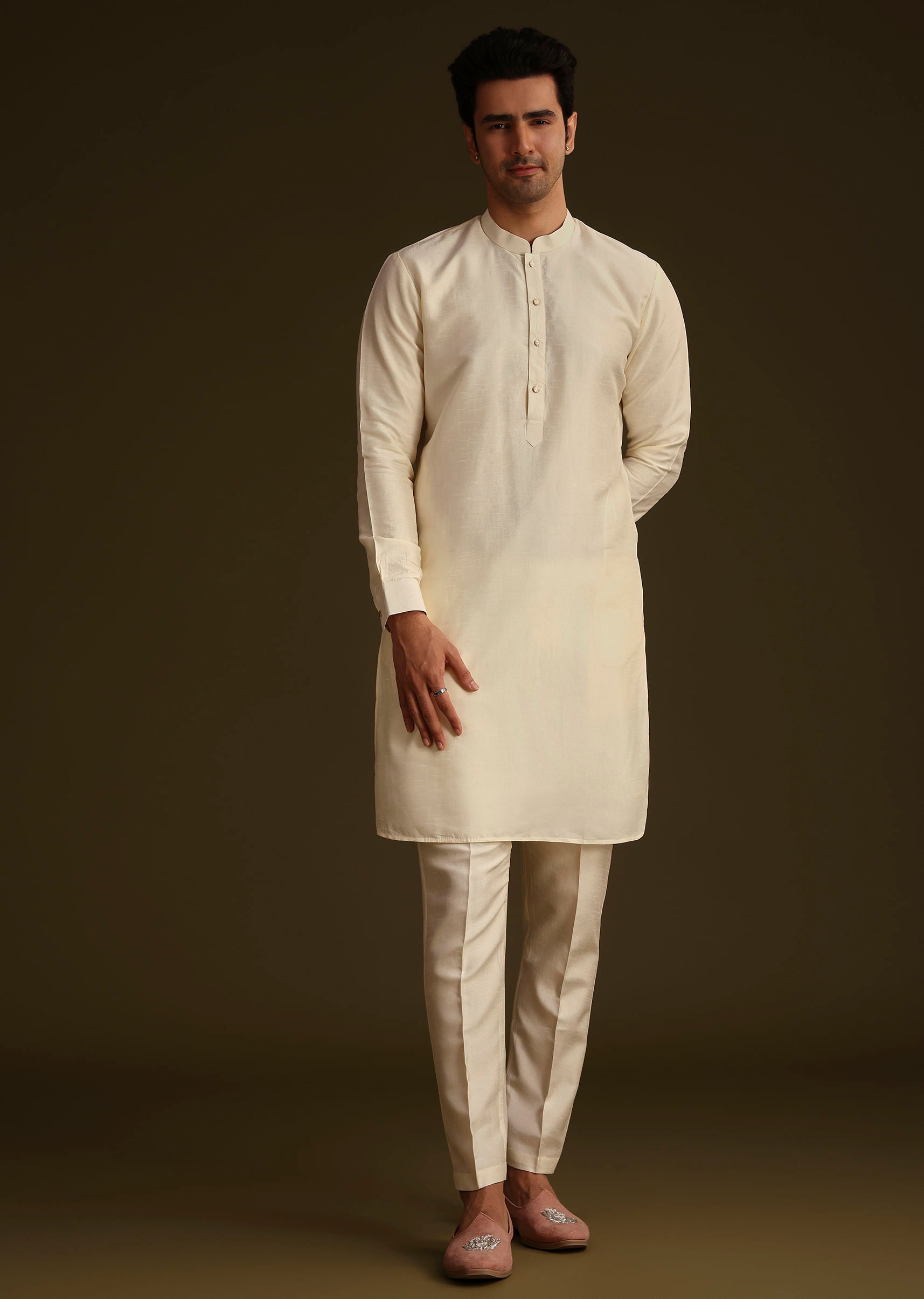 Exude Refined Elegance With This Ivory Silk Ensemble Featuring A Long Jacket Adorned With Intricate Thread Resham And Mirror Work. Paired With A Sleek Kurta And Tailored Bottoms This Masterpiece Blends Traditional Artistry With Modern Sophistication Perfect For Weddings Receptions And Festive Occasions. The Luxurious Silk Fabric And Detailed Embellishments Create An Aura Of Regal Charm. Redefine Grace With This Timeless Ensemble. Awarded as the Most Trusted Brand, we're delivering styles you love, just as promised.