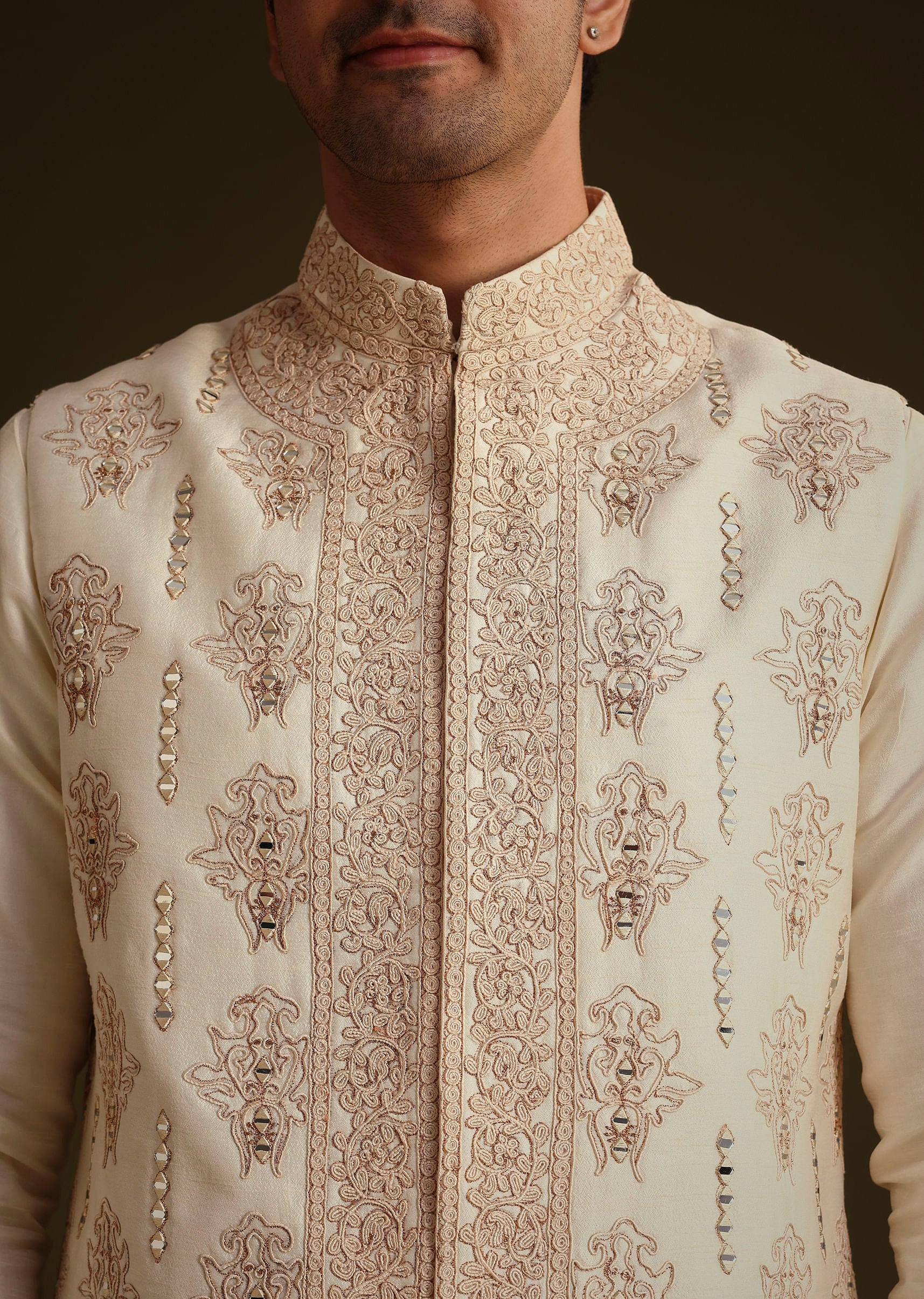 Exude Refined Elegance With This Ivory Silk Ensemble Featuring A Long Jacket Adorned With Intricate Thread Resham And Mirror Work. Paired With A Sleek Kurta And Tailored Bottoms This Masterpiece... More Product Details