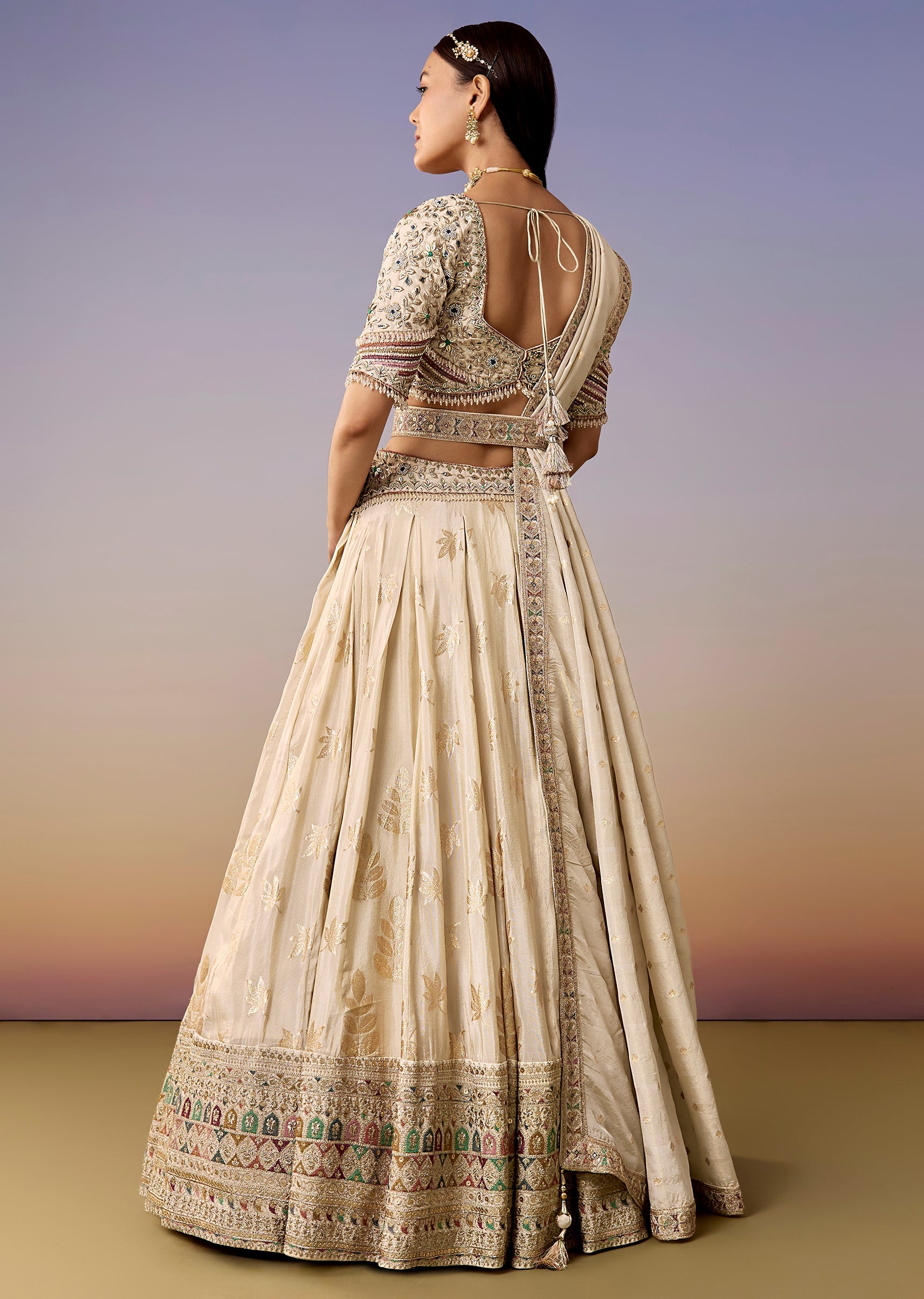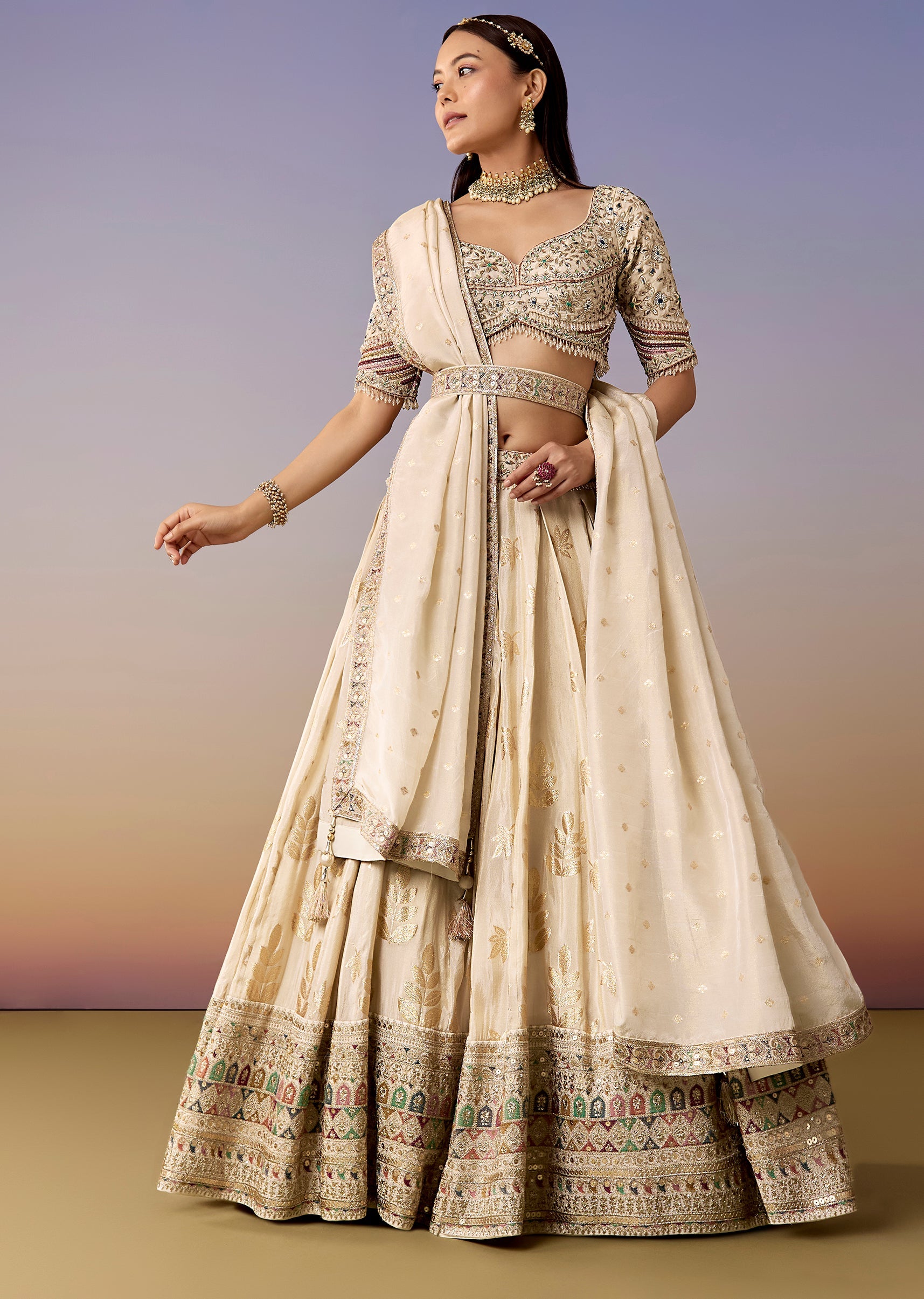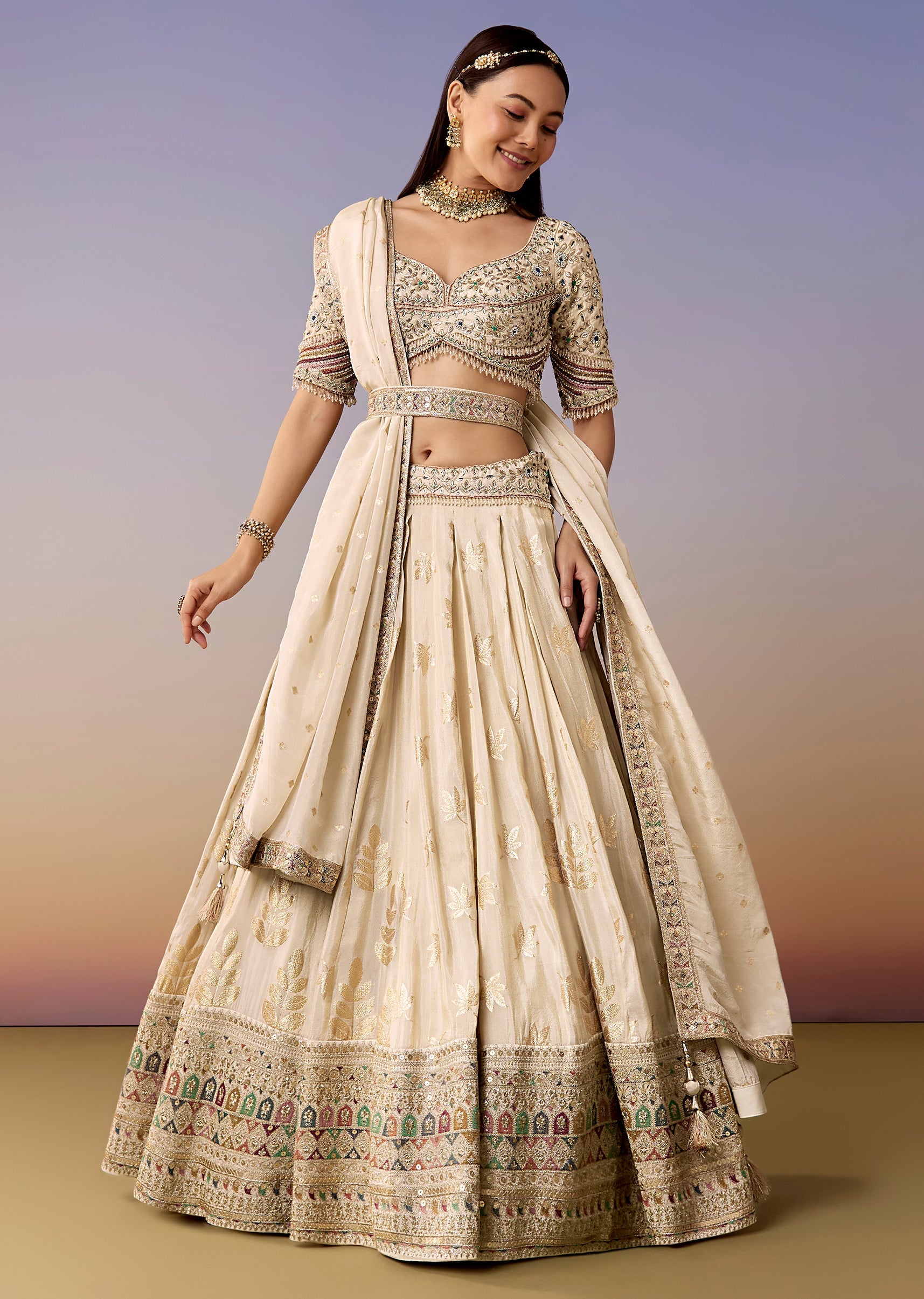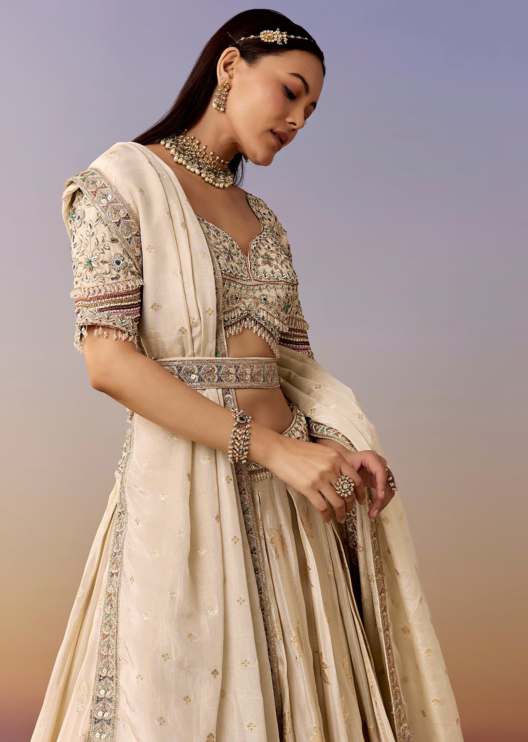 An elegant ivory lehenga set crafted in tissue brocade, featuring a sweetheart choli with zari, thread and moti work, paired with a flared lehenga, dupatta, and a matching belt for... More Product Details