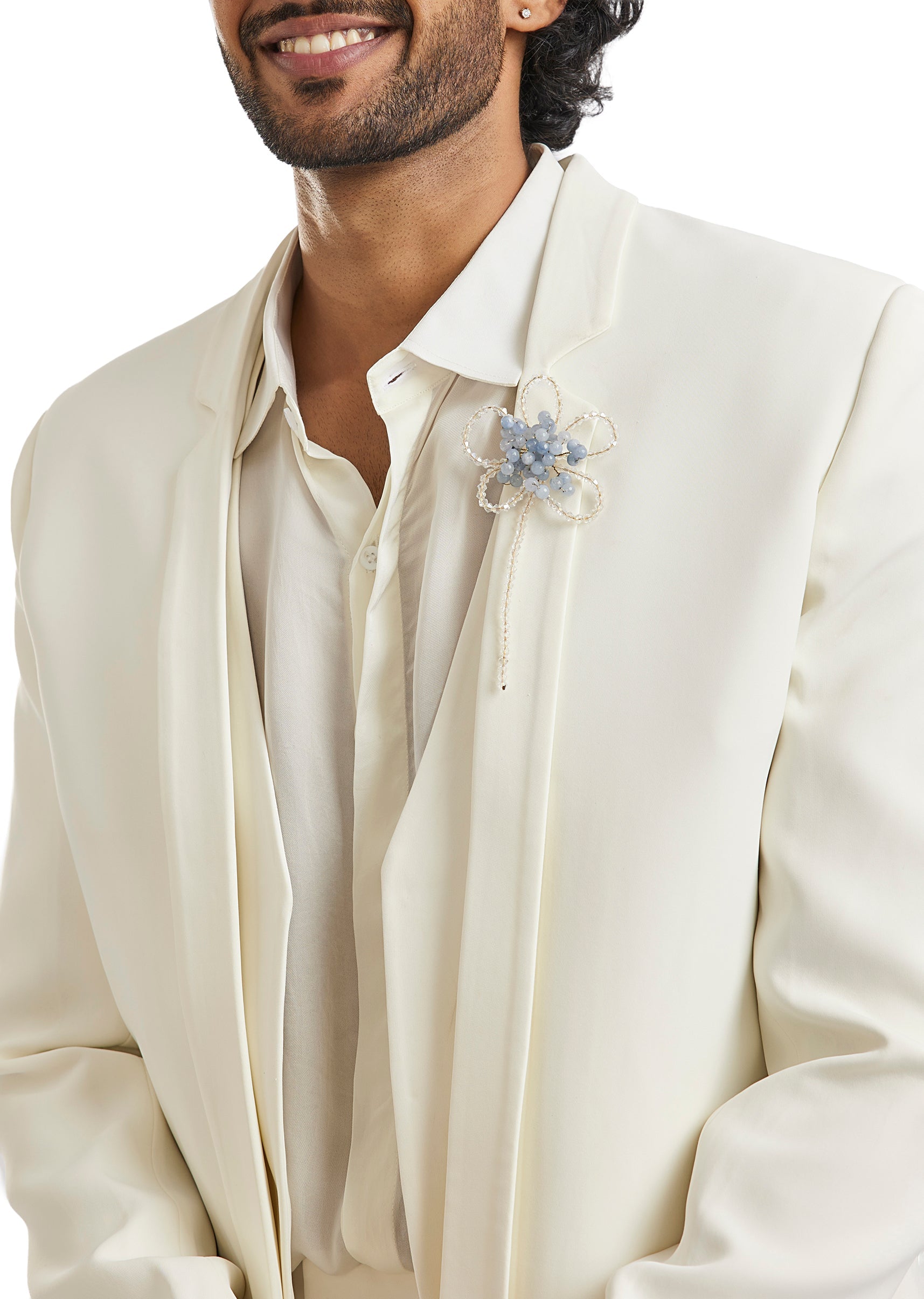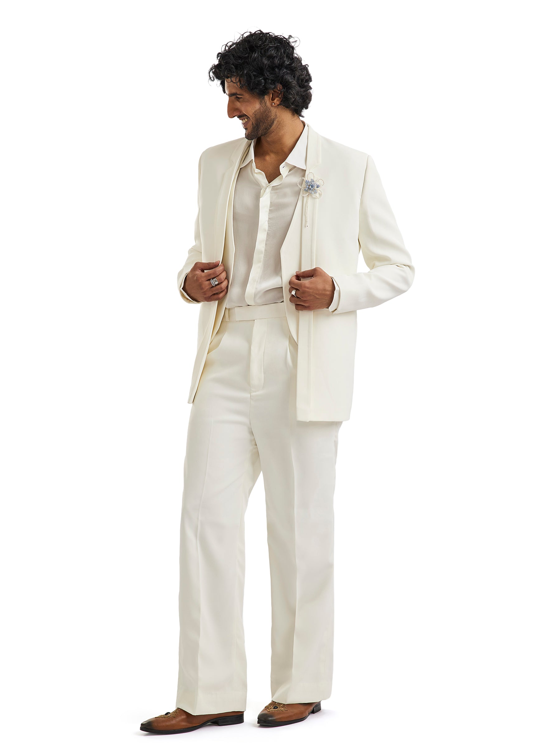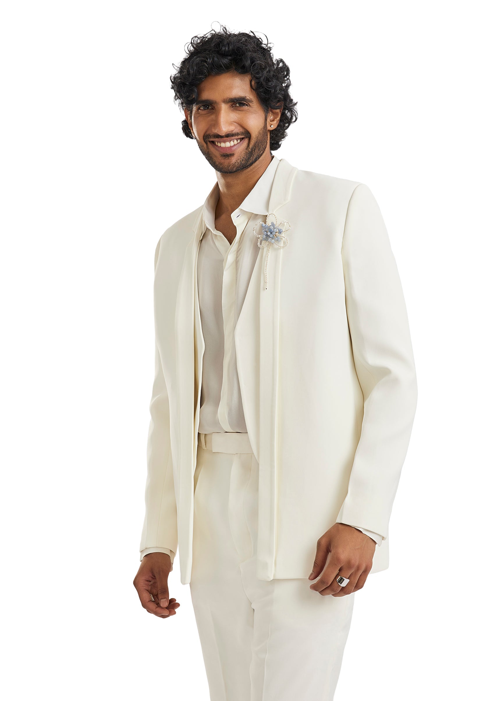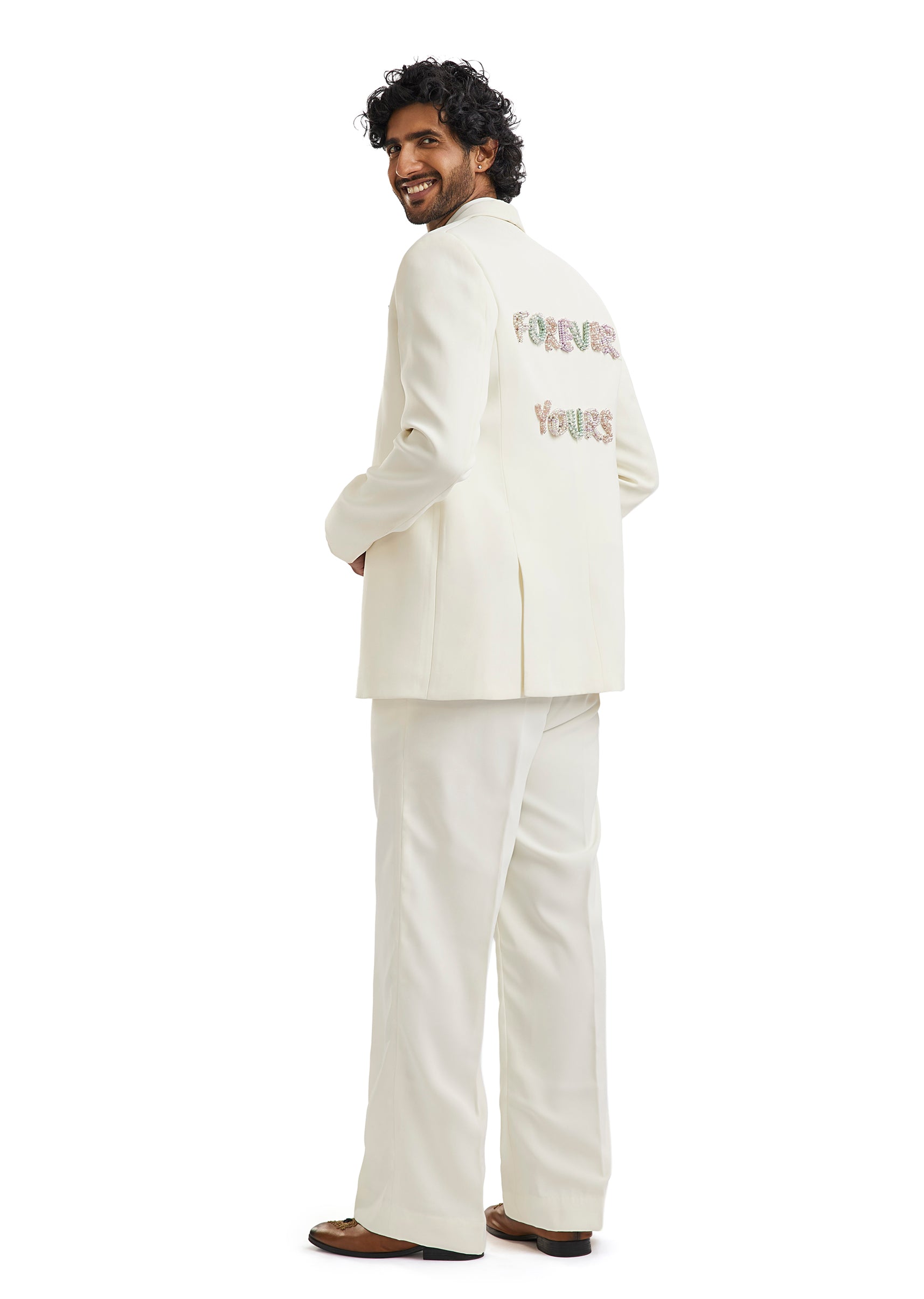 A sophisticated ivory tuxedo set featuring unique pearl letter embroidery on the blazer. Paired with a shirt and tailored pants, it offers a distinctive yet refined look for modern celebrations.