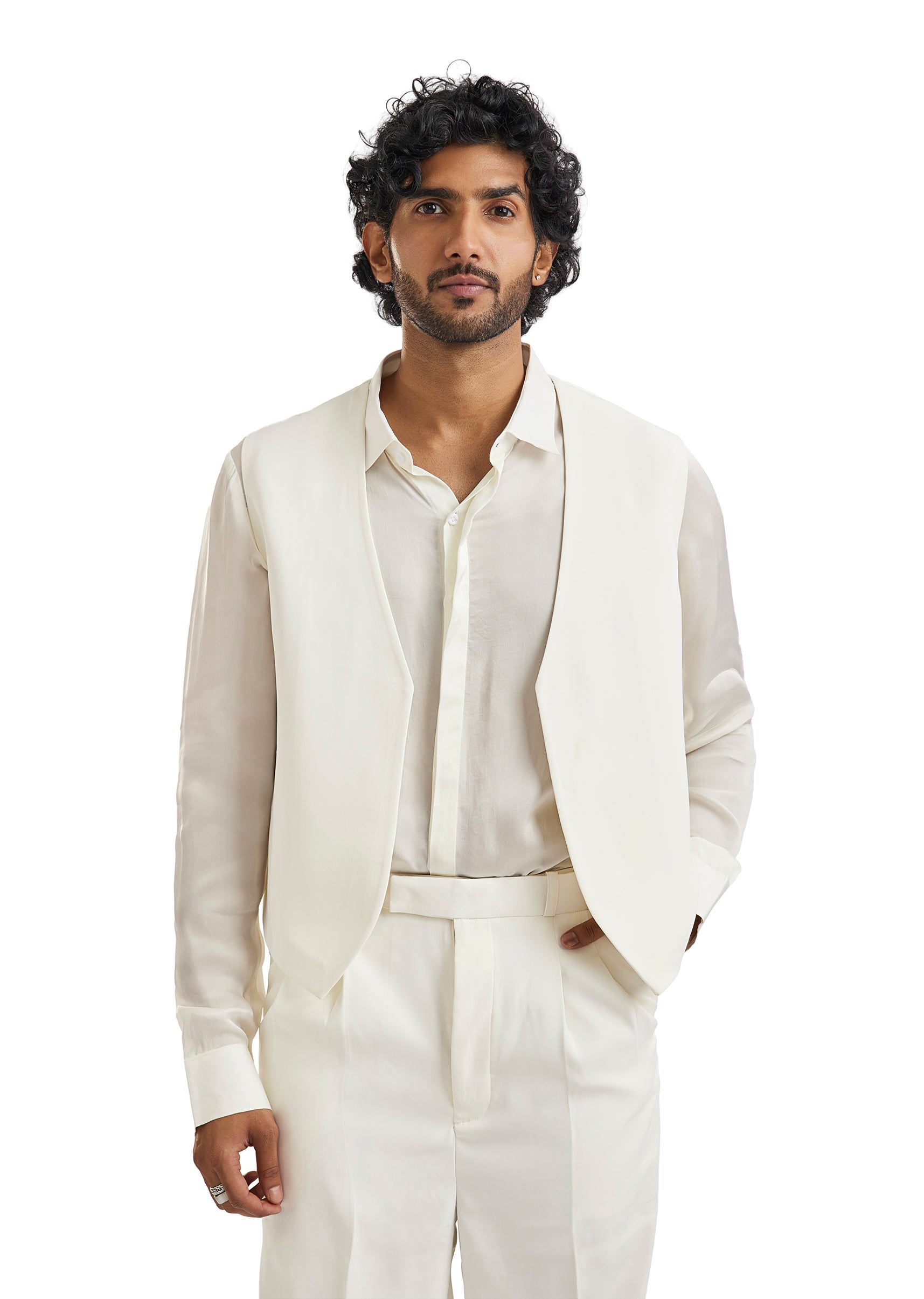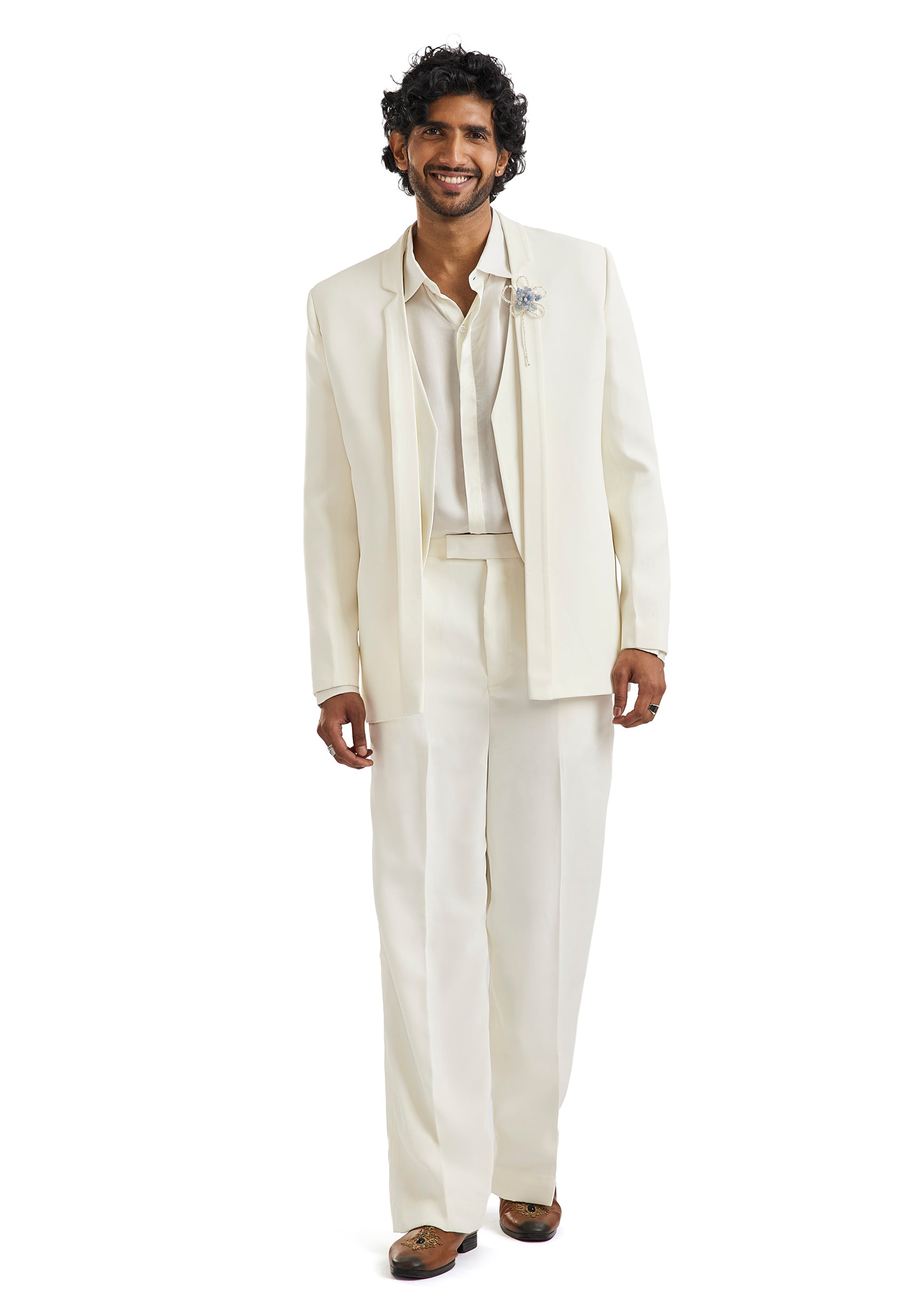 ... More Product DetailsA sophisticated ivory tuxedo set featuring unique pearl letter embroidery on the blazer. Paired with a shirt and tailored pants, it offers a distinctive yet refined look for modern celebrations.
