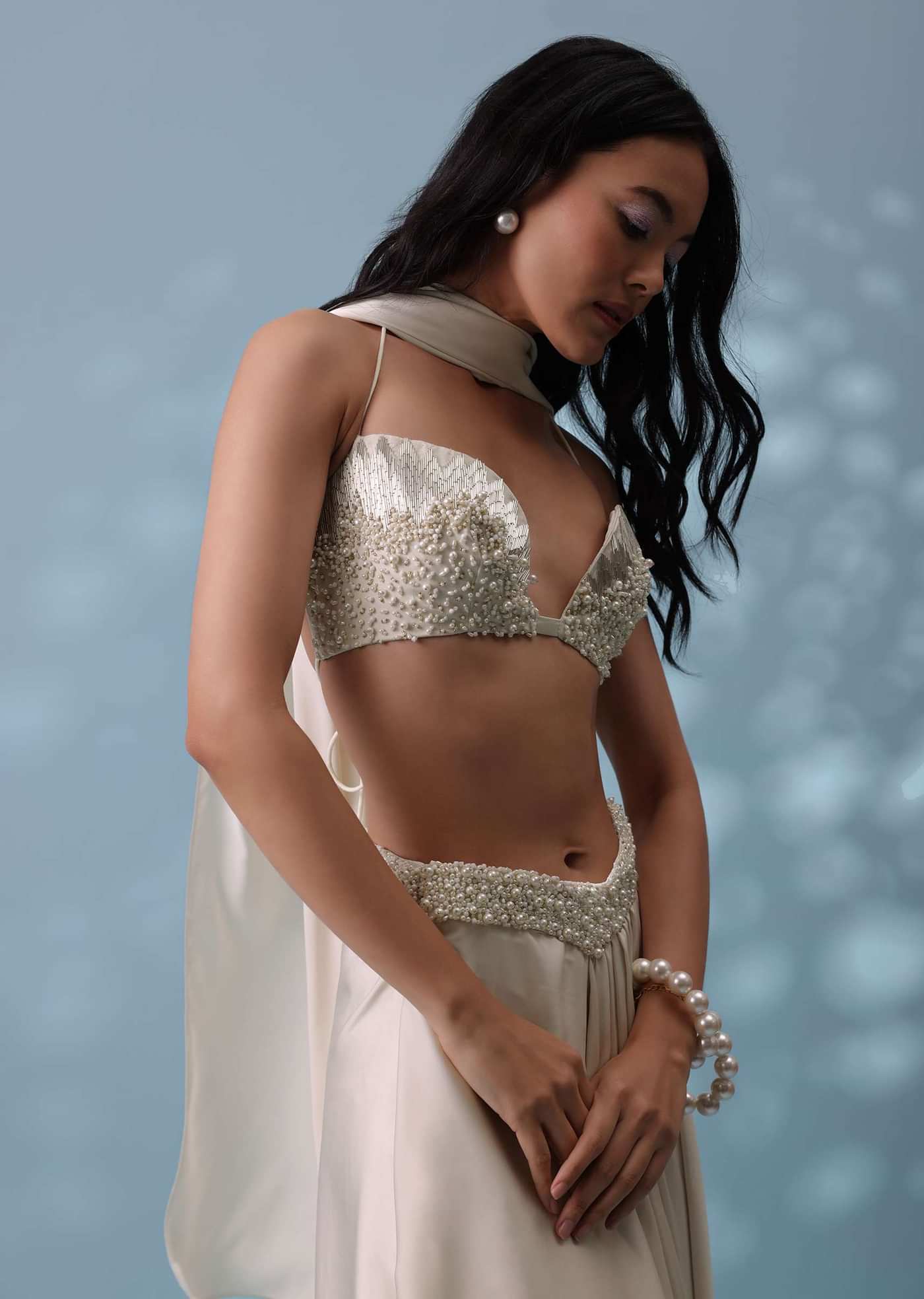 Introducing our cutdana, moti, and beads embroidered drape skirt and bustier top set. The stunning bustier features an illusion neckline and comes sleeveless, making it a great choice for the... More Product Details