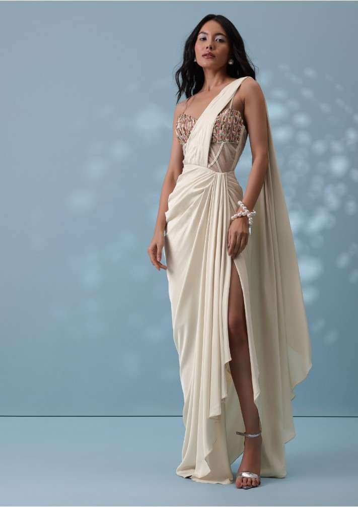 Ivory White Ready-To-Wear Embroidered Drape Saree Gown In Satin