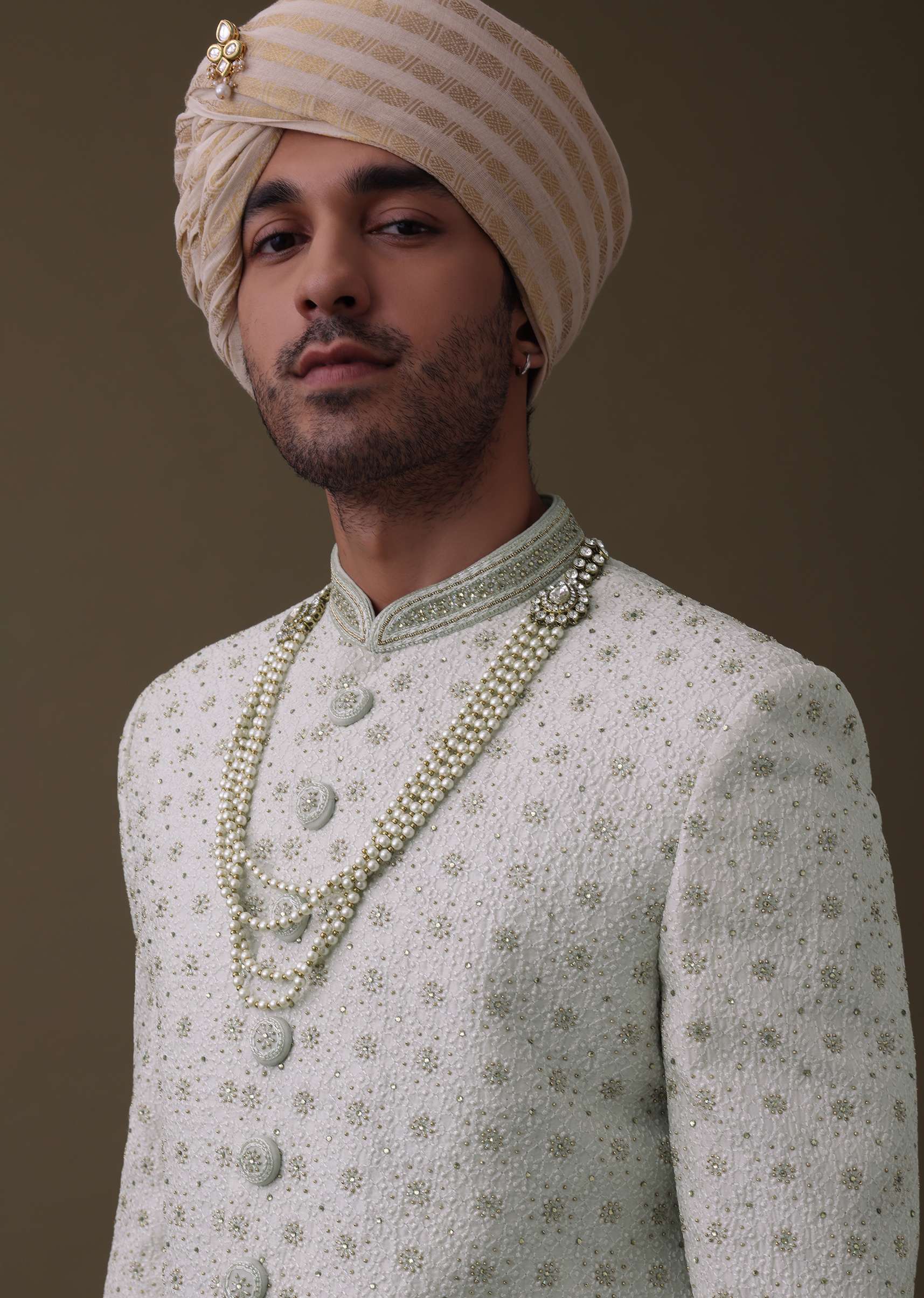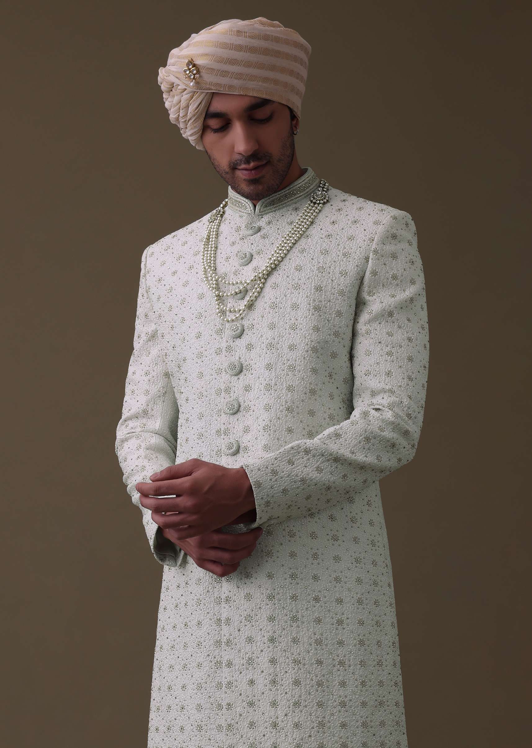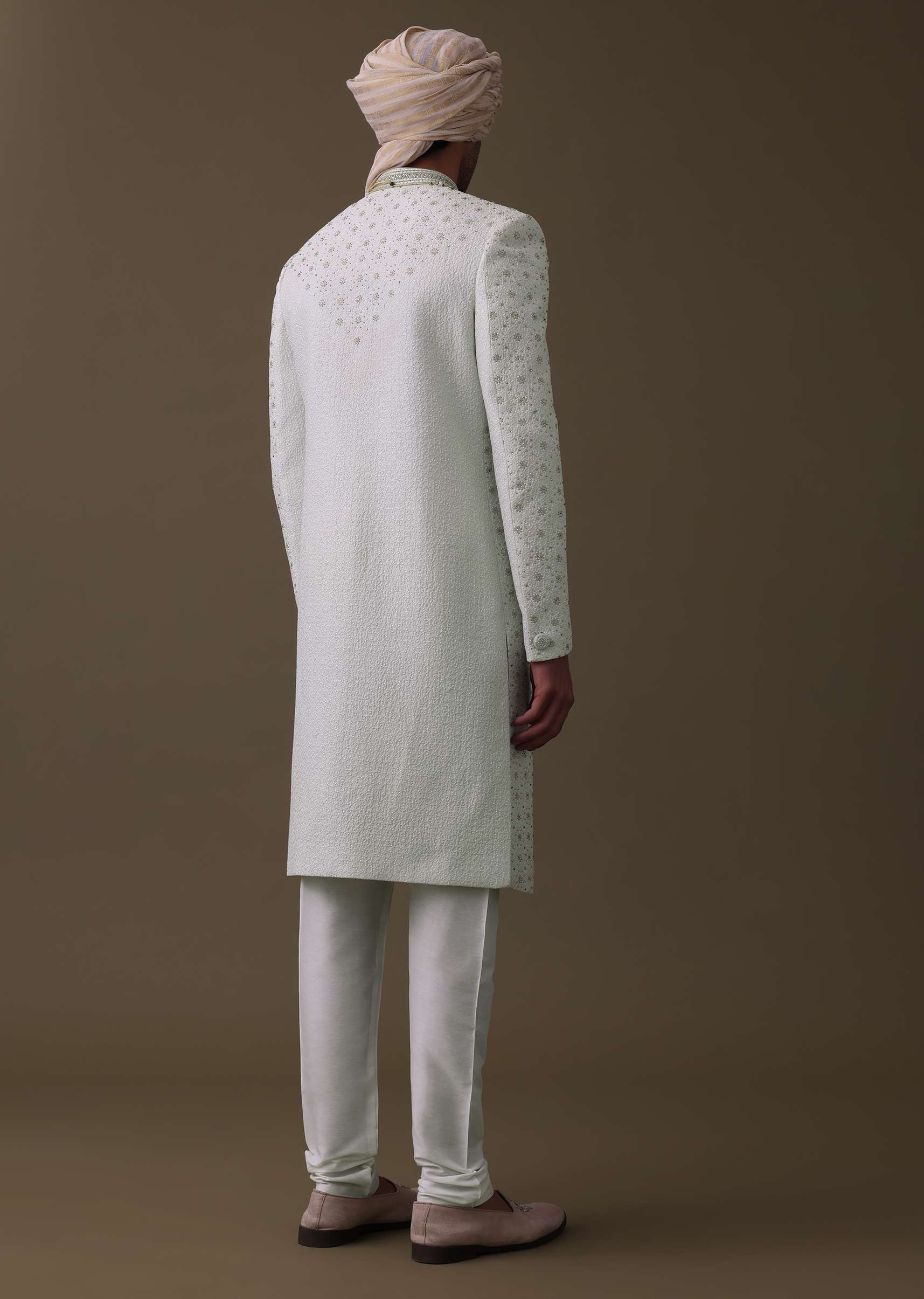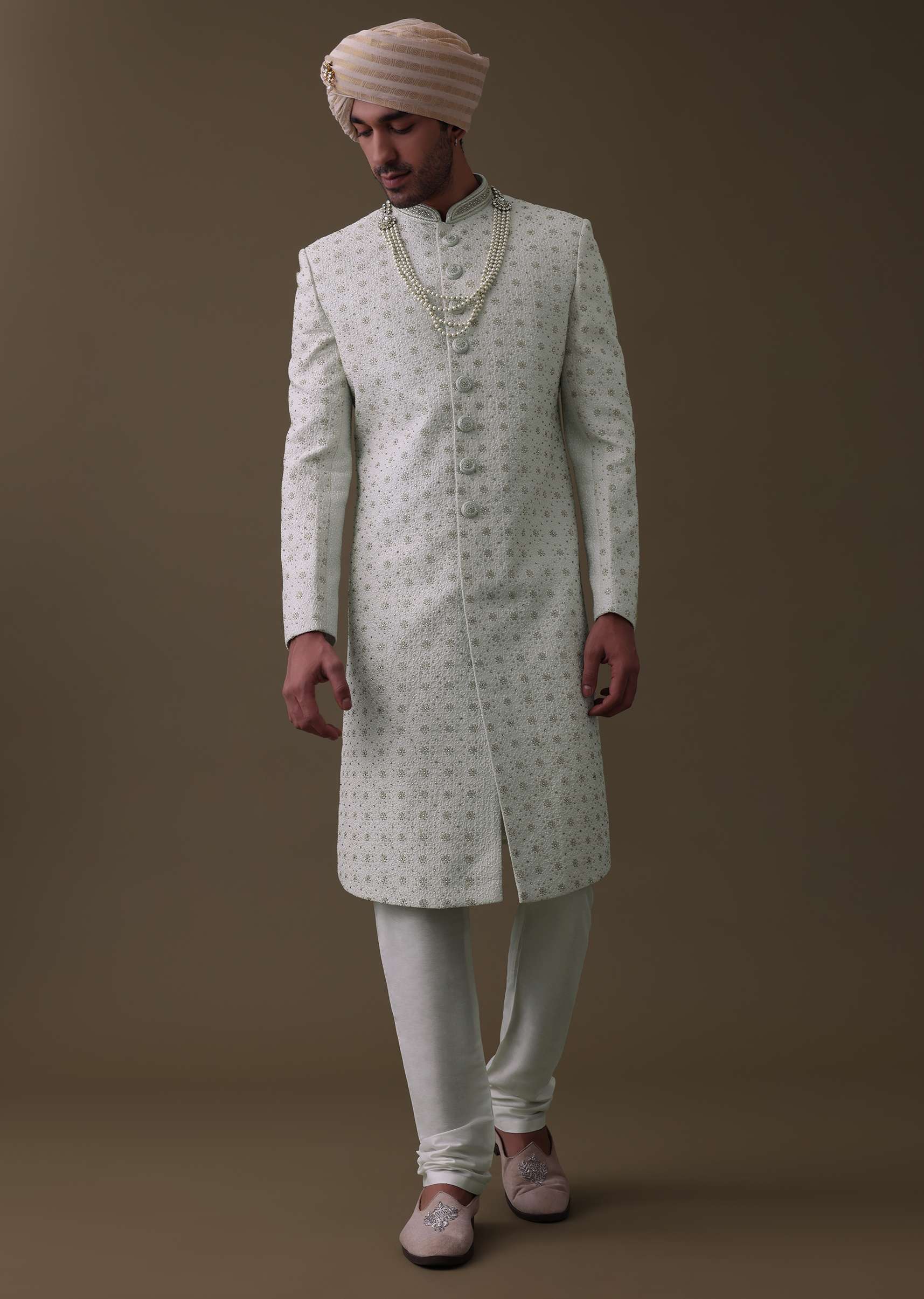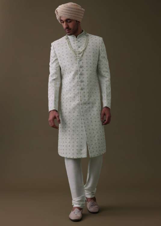 Introducing our elegant ivory white sherwani set.The detailed cut dana work on the sherwani adds a unique and luxurious touch.The sherwani comes in a mandarin collar neckline with full sleeves.The set comes with a matching churidar and a mala.EVENT - Perfect for weddings.NOTE - Buttons and accessories may vary in color, shape and size.Change folds regularly. Awarded as the Most Trusted Brand, we're delivering styles you love, just as promised.