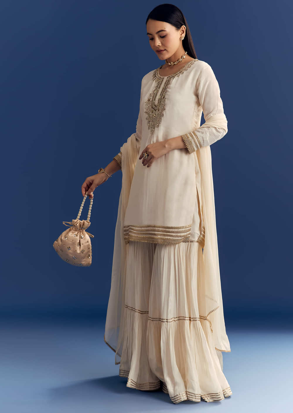 Ivory Zardosi Work Crepe Kurta Sharara Set