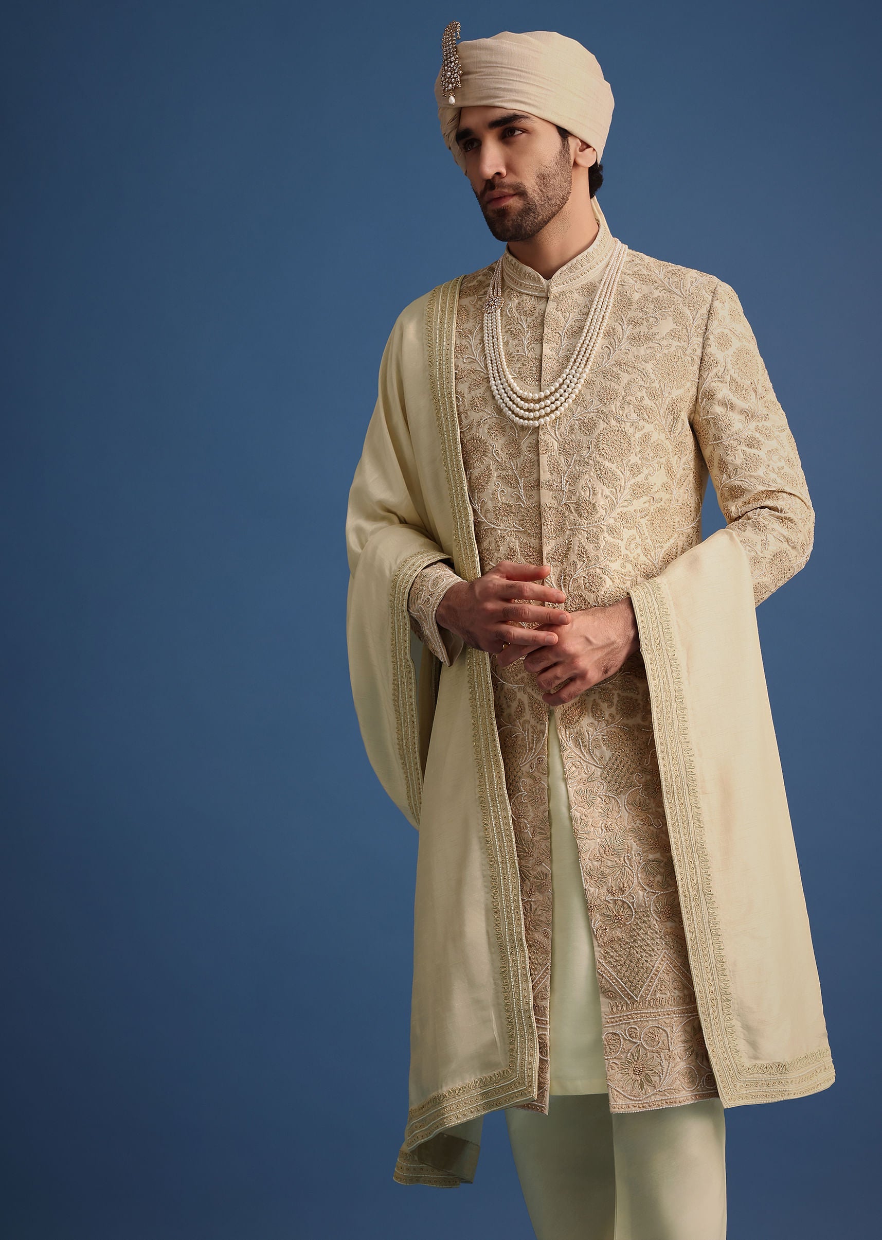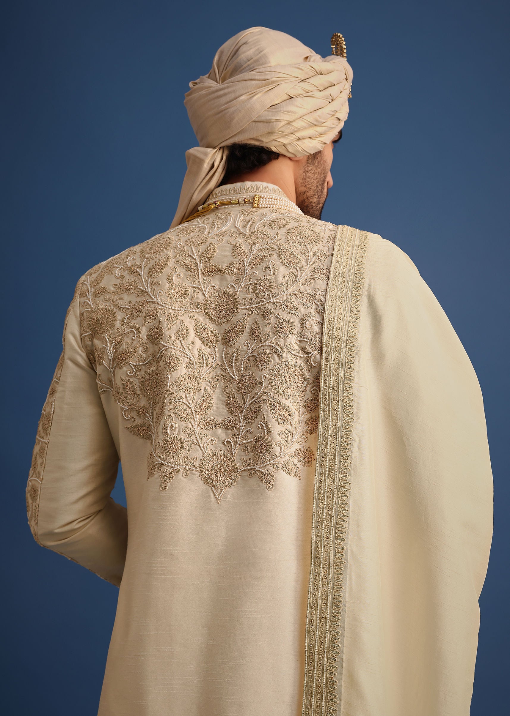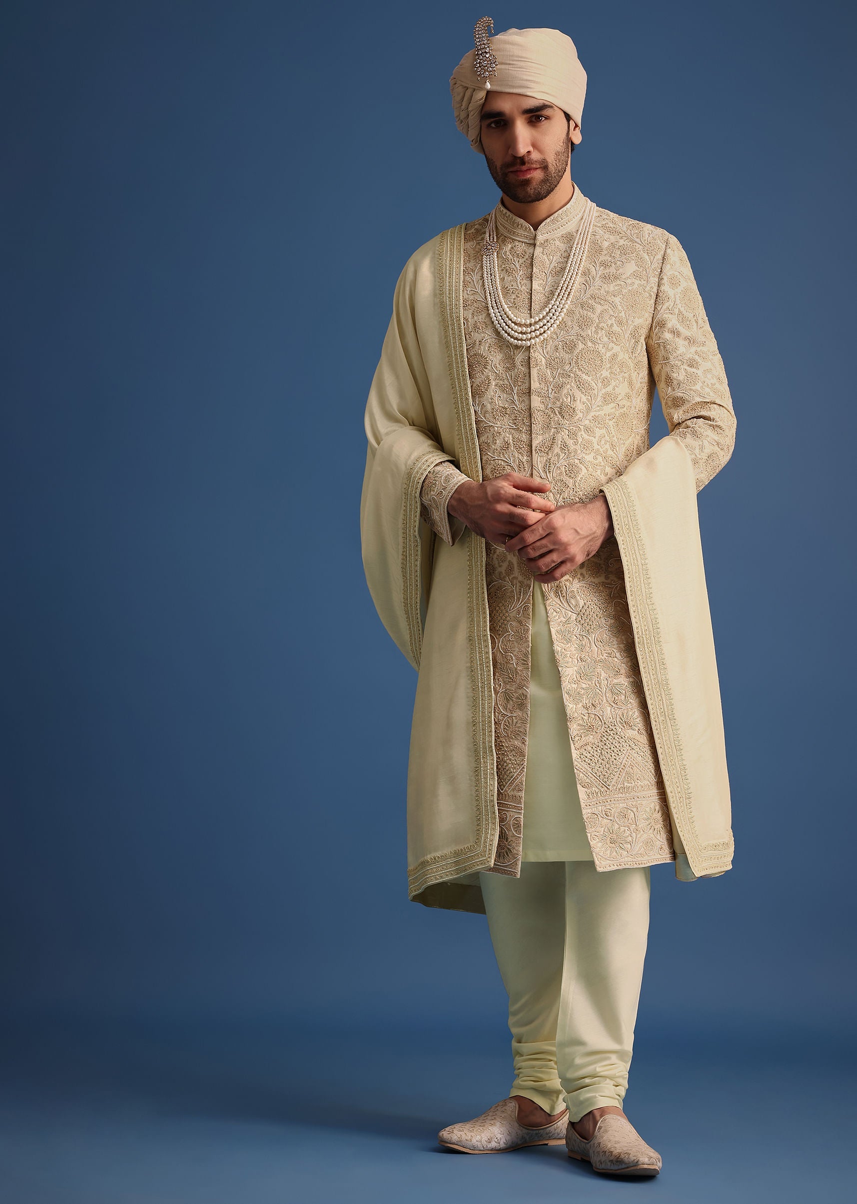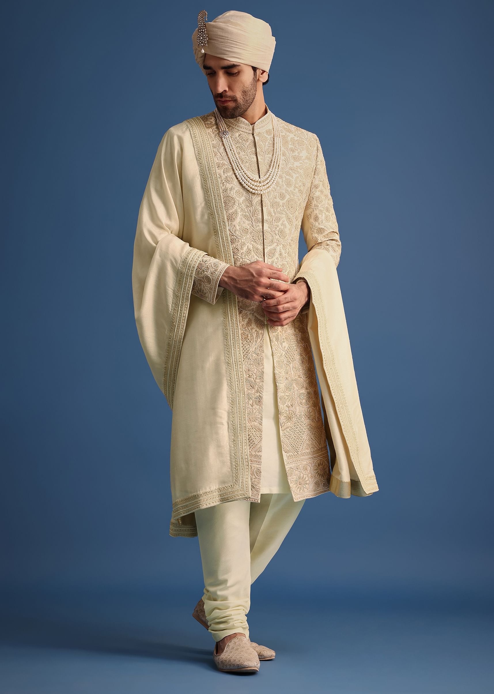 Step into grandeur with our Ivory Art Silk Sherwani Set featuring delicate dori zari and bead embroidery. This elegant set comprises a richly embroidered sherwani and churidar designed to make a lasting impression at weddings and special occasions. The sherwani is paired with a kurta churidar and dupatta. Awarded as the Most Trusted Brand, we're delivering styles you love, just as promised.