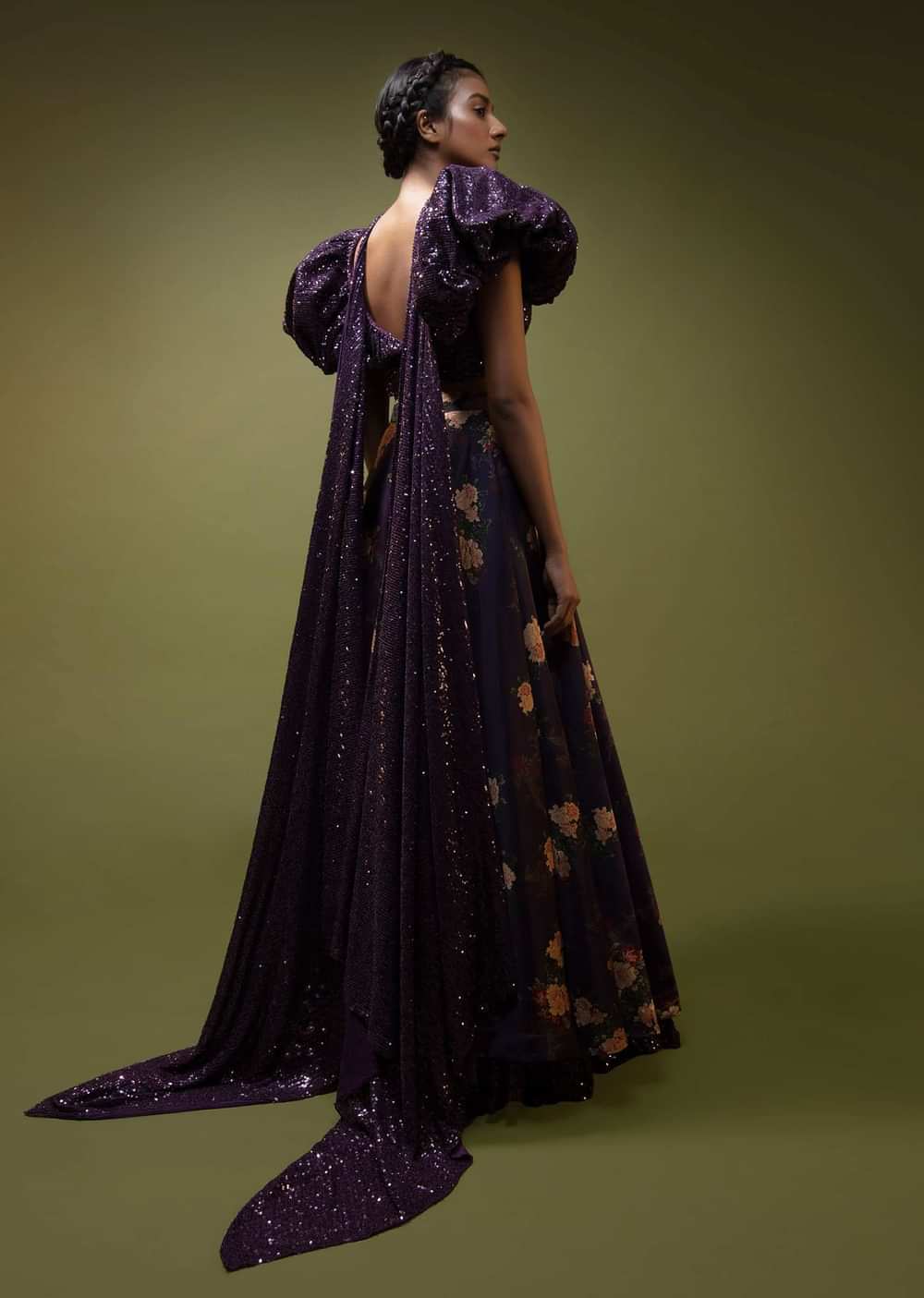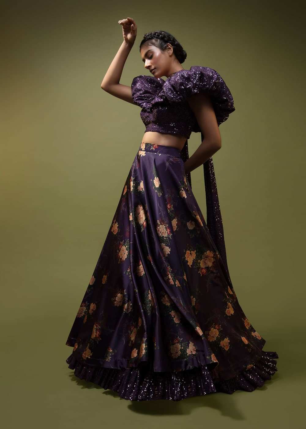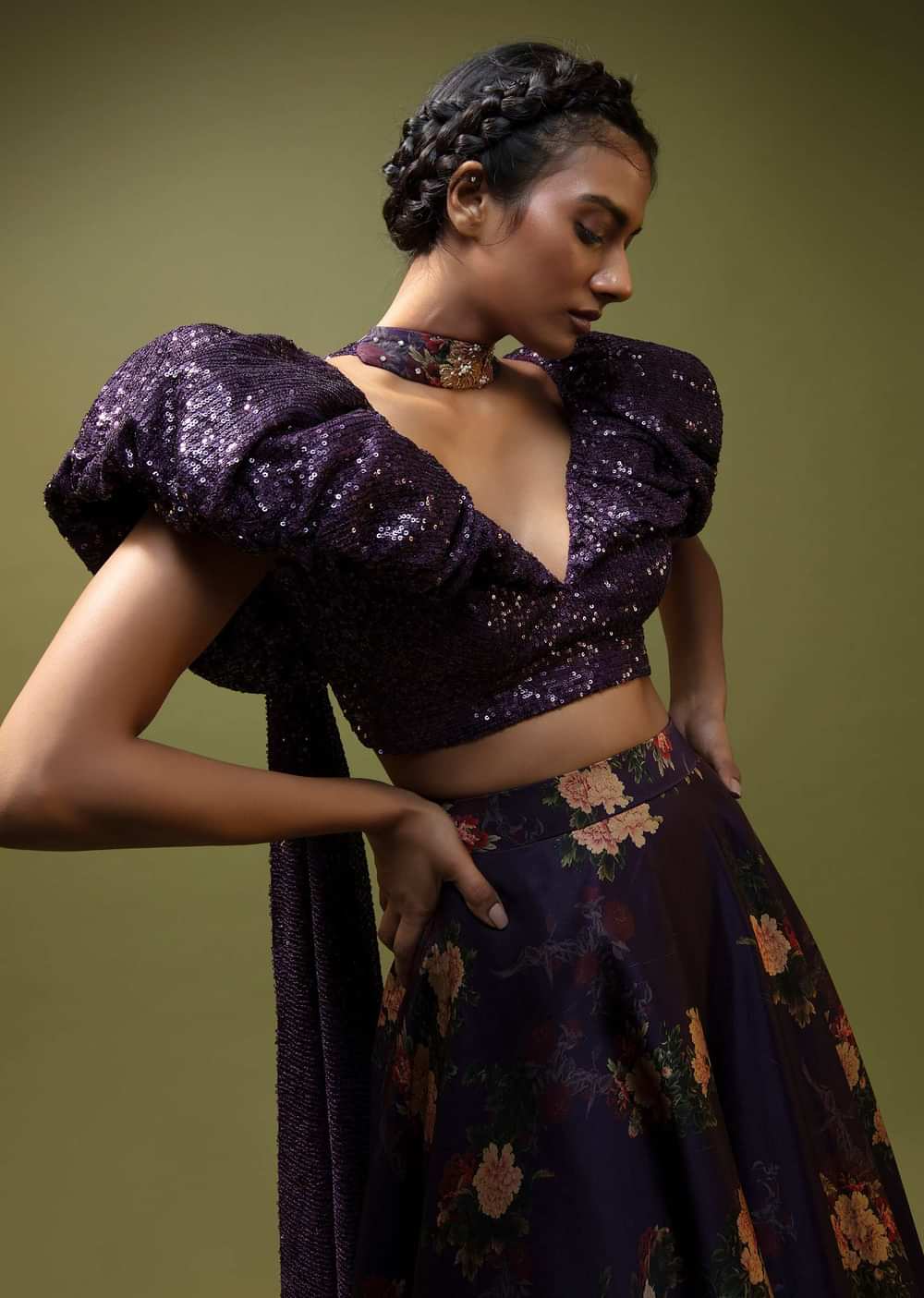 Jewel Purple Lehenga In Floral Printed Satin With A Sequins Crop Top Designed With An Elaborate Puff On The Shoulder And Neckline