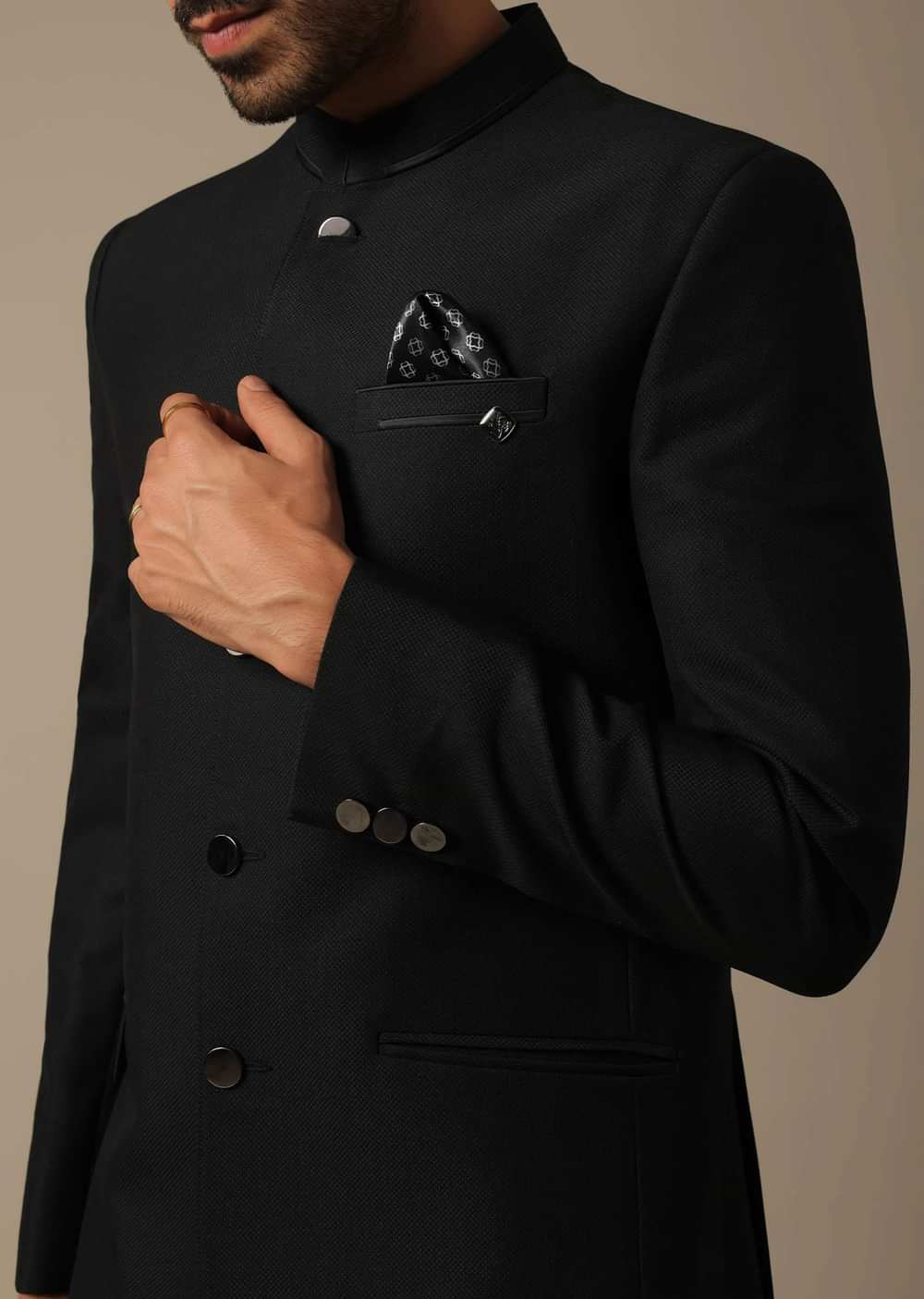 Enhance the classic charm by pairing this Bandhgala Sherwani with traditional mojris and a pocket square.