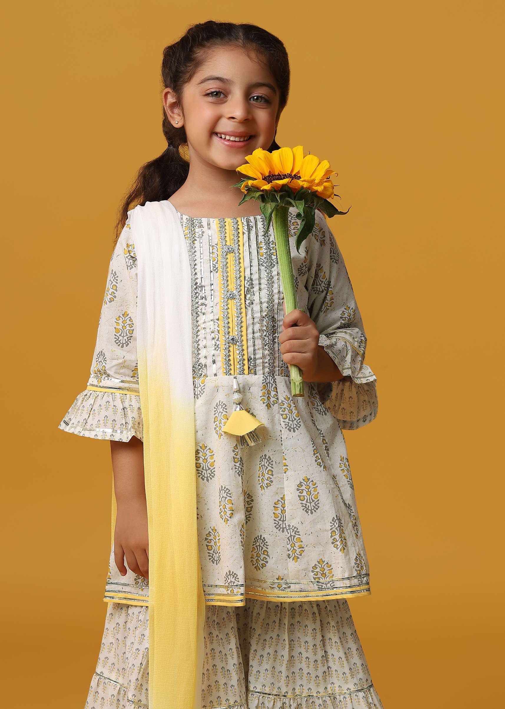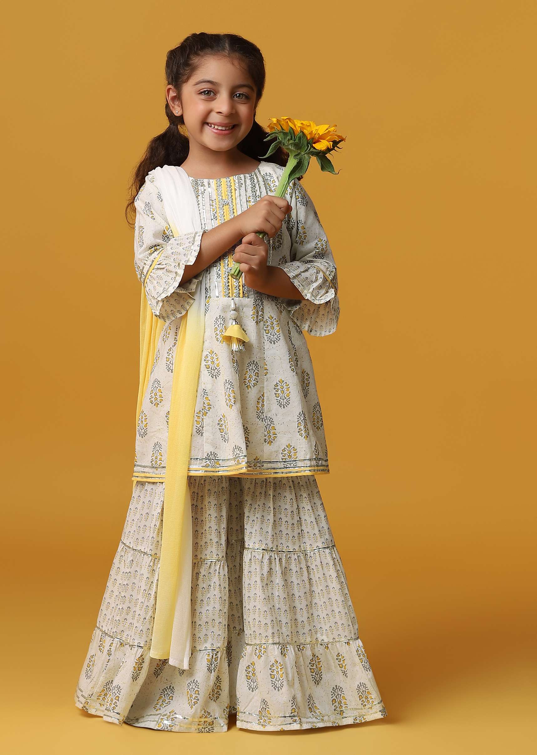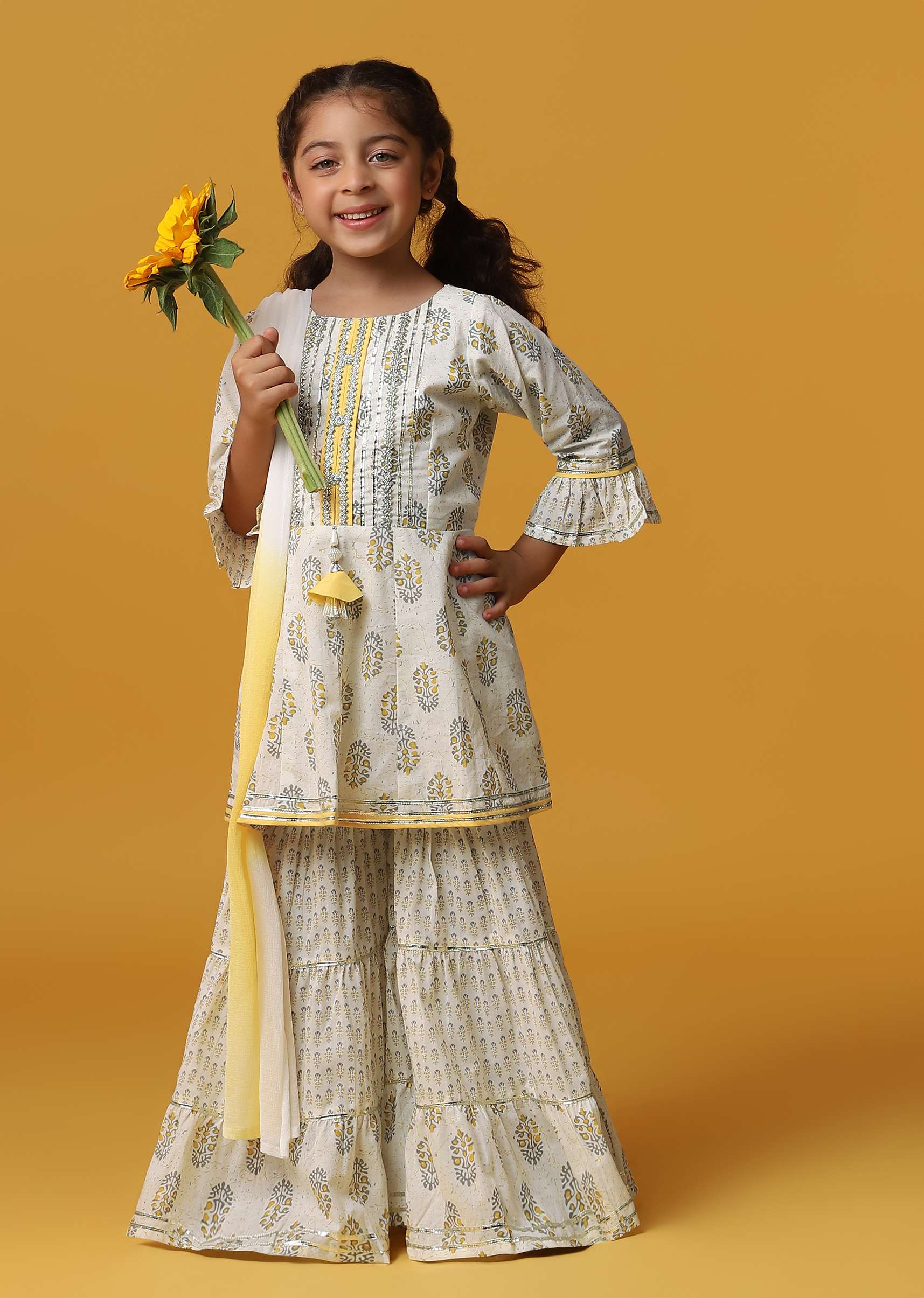 Kalki Beige Cream Printed Sharara And Kurta Set In Cotton For Girls