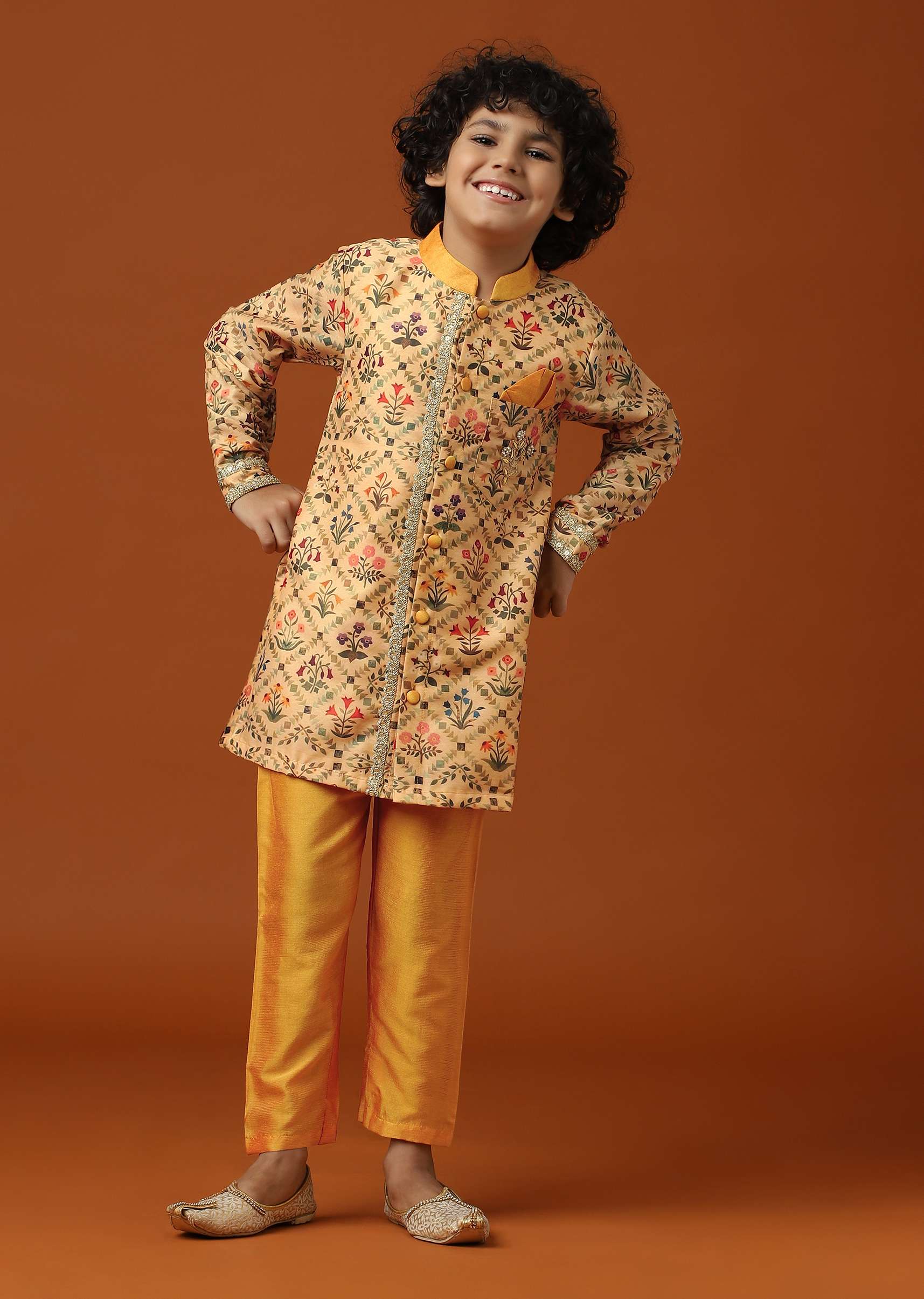 Introducing our digitally printed kurta pant set, crafted with care to suit your little boy's comfort and style.Made with a blend of cotton and silk, this set boasts softness, durability, and a smooth finish that feels amazing on the skin.The mandarin collar adds a touch of traditional sophistication.A pair of matching Aligarhi pants comes included.EVENT - Ideal for Raksha Bandhan and festive celebrations.Change folds regularly. Awarded As The Most Trusted Brand We'Re Delivering Styles You Love Just As Promised.
