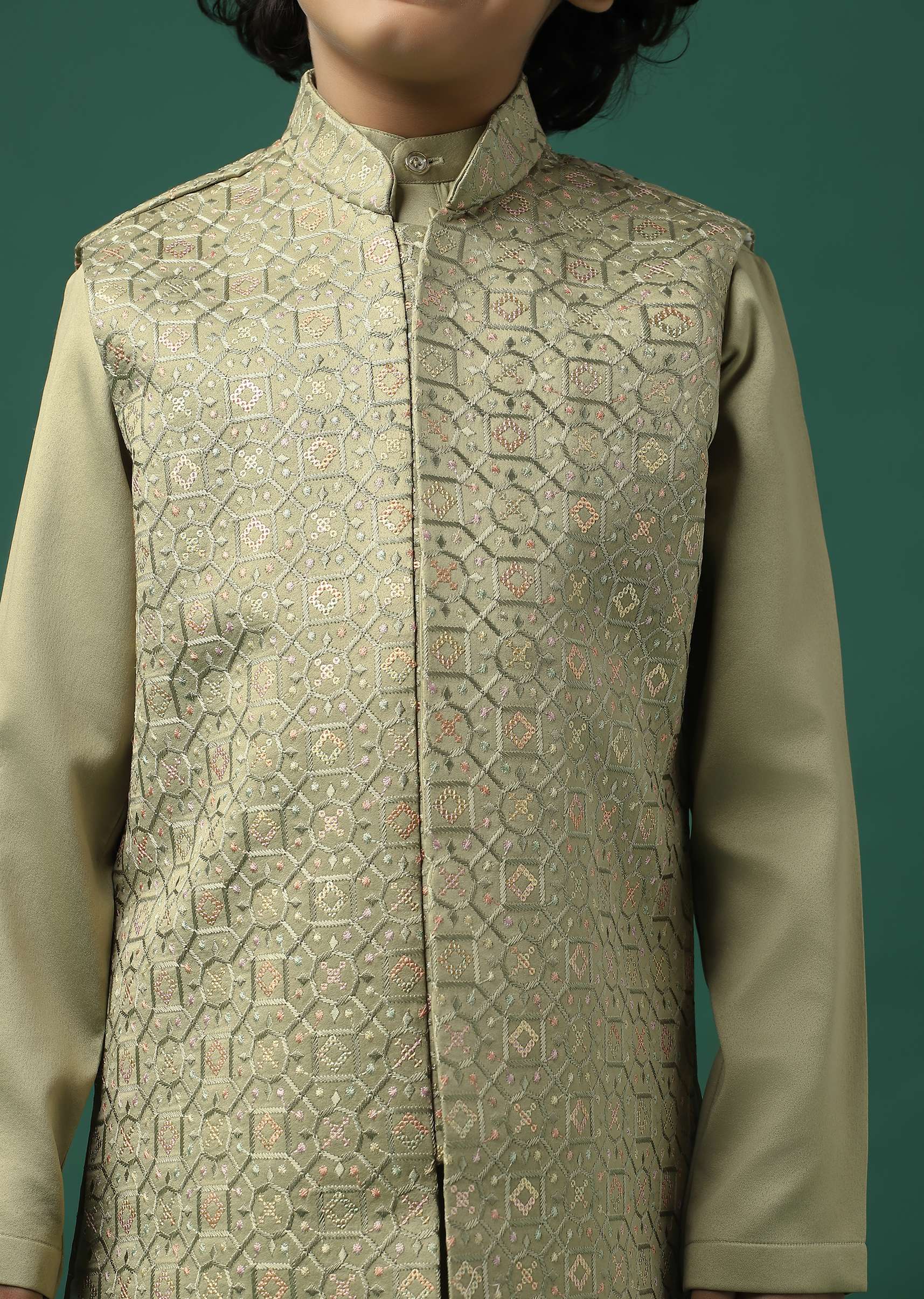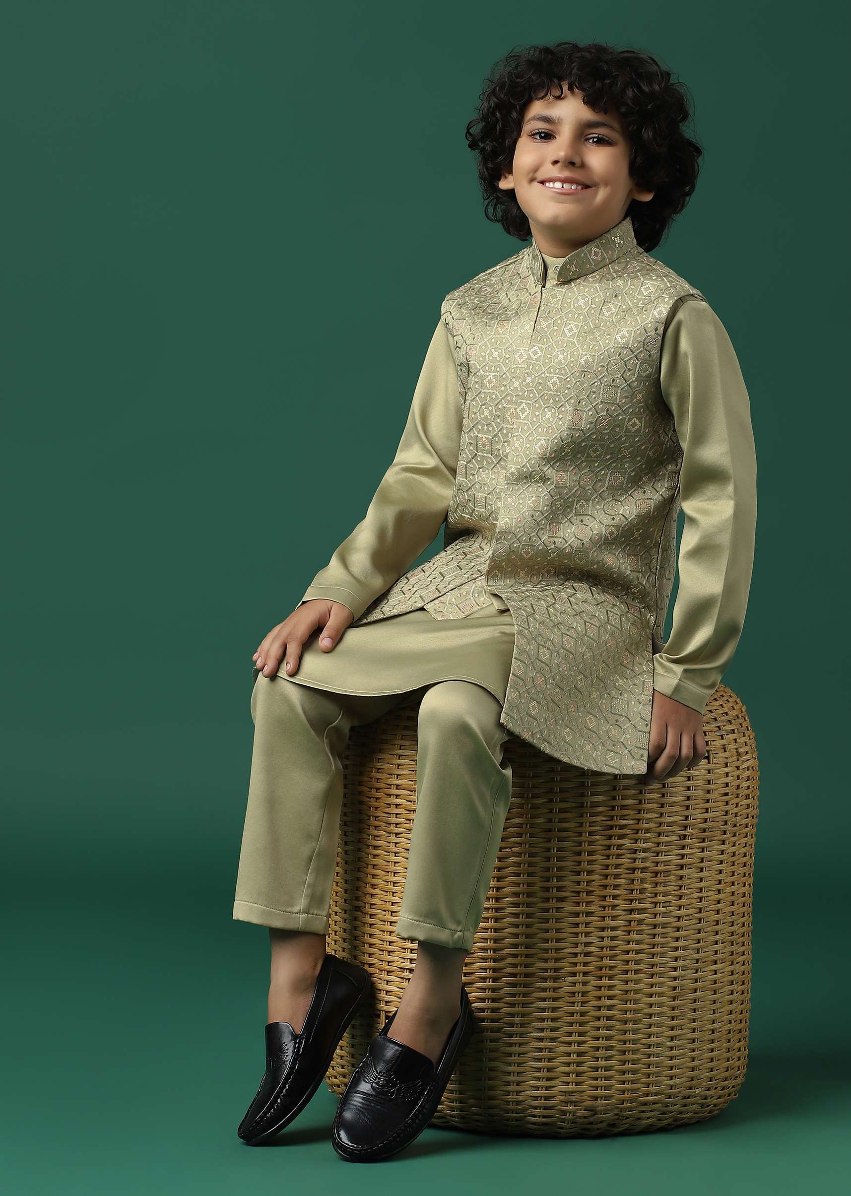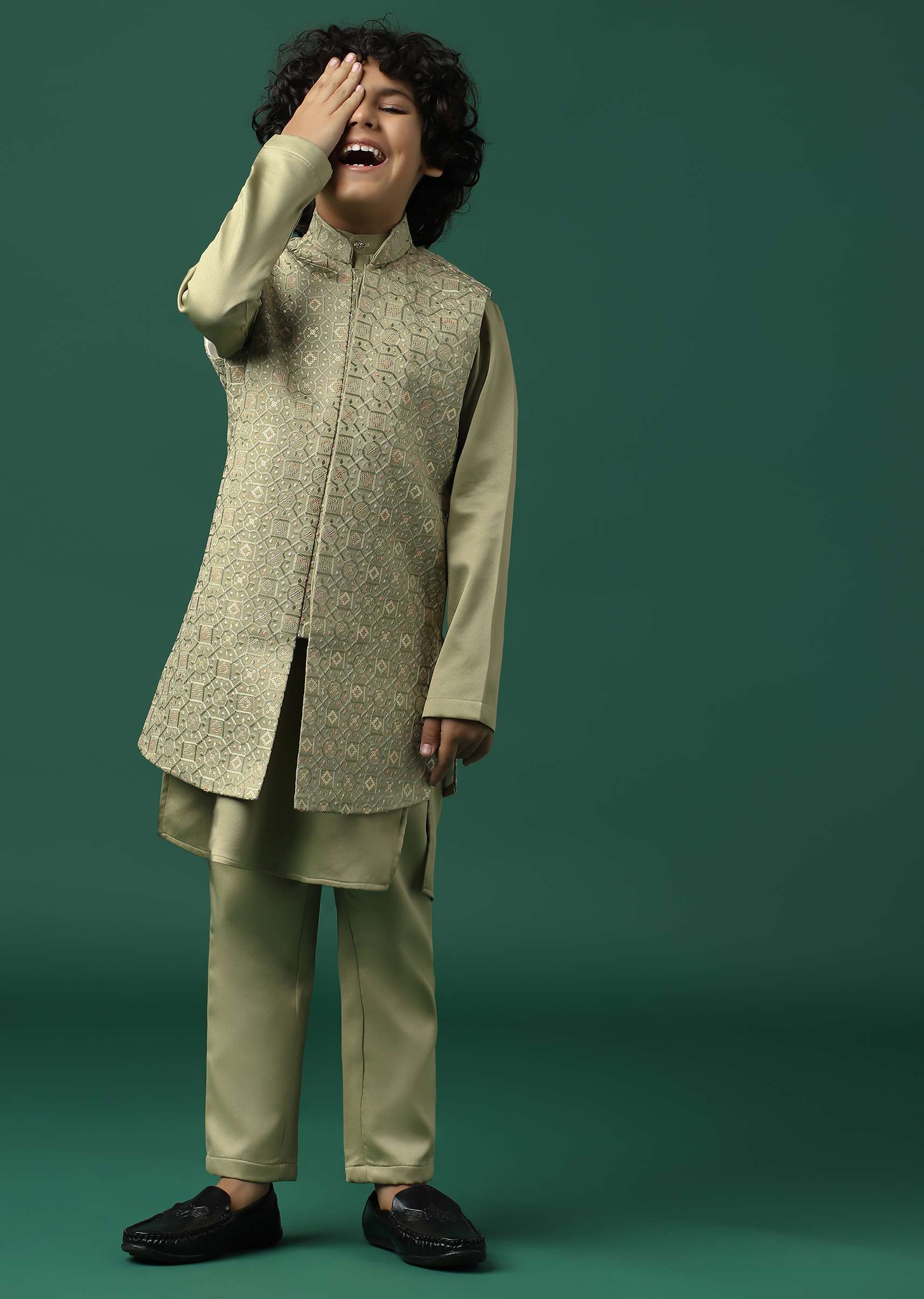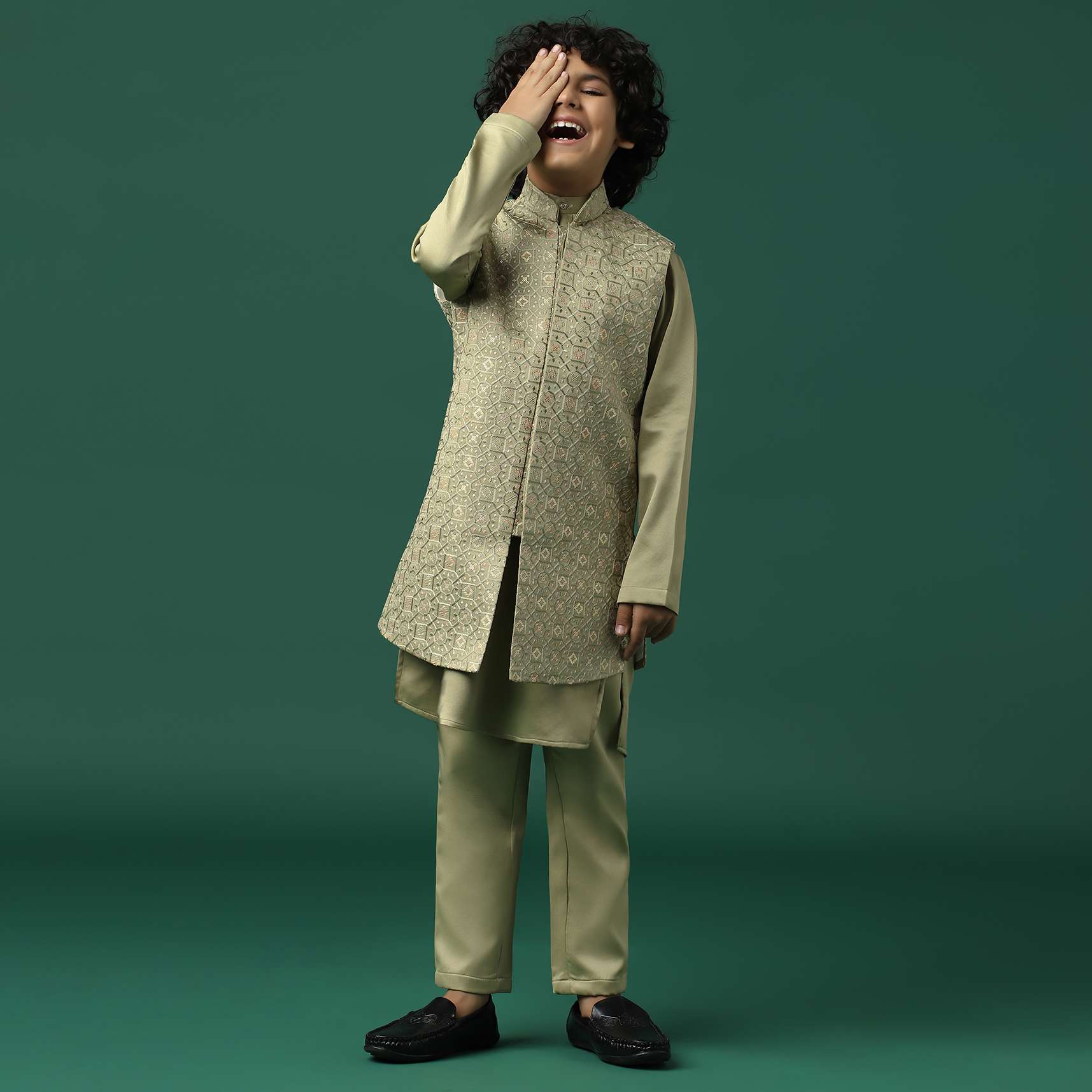 Introducing our sequins-embroidered jacket and kurta set for boys, a stylish and modern take on traditional Indian attire. The jacket and kurta both feature a mandarin collar neckline, creating a unique and stylish look. The threadwork on the jacket adds a touch of sophistication to the outfit.The set includes a pair of matching Aligarhi pants.EVENT - Perfect for any festive occasion or formal event. Change folds regularly. Awarded As The Most Trusted Brand We'Re Delivering Styles You Love Just As Promised.
