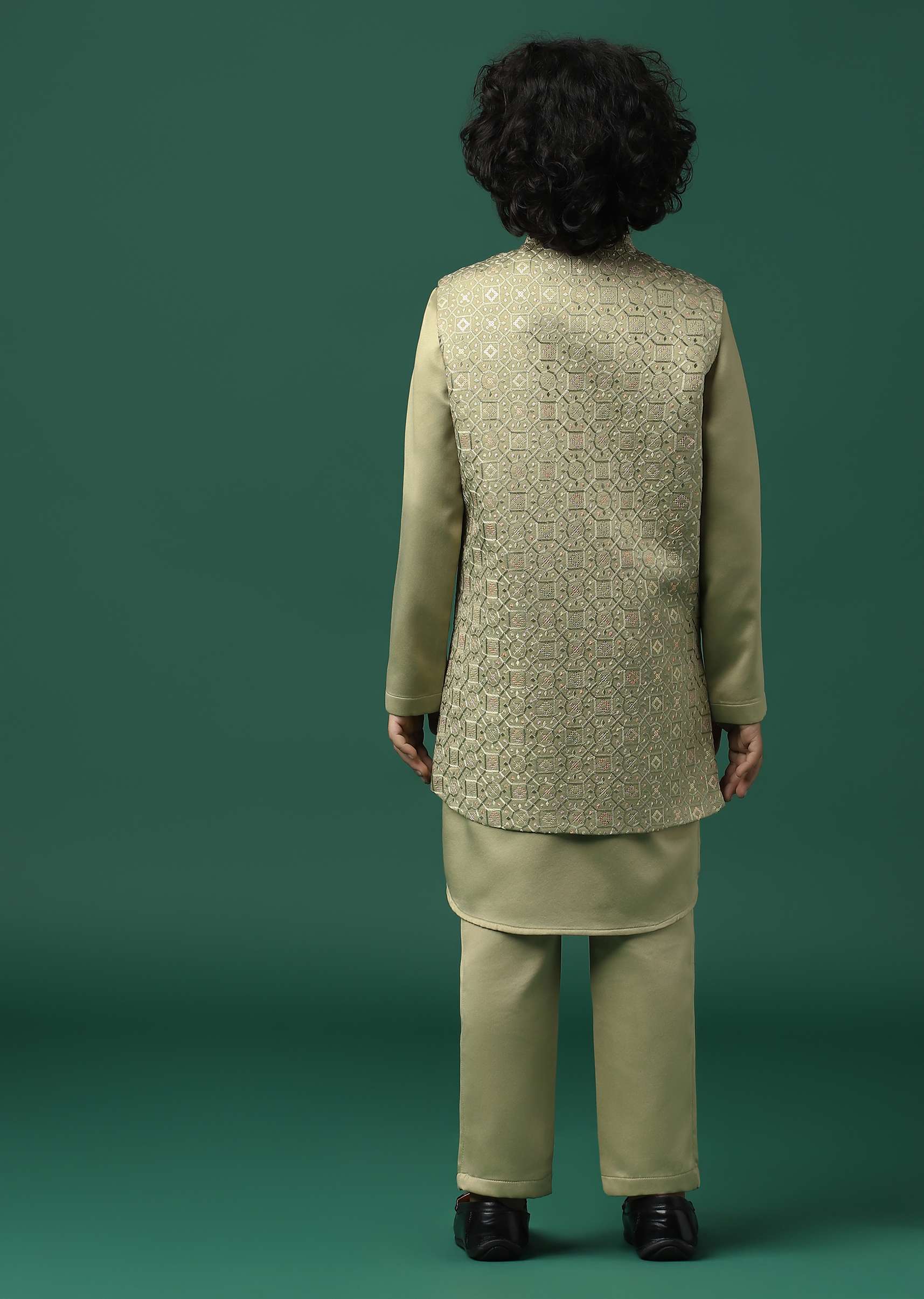 Kalki Beige Sherwani Set In Satin With Threadwork And Sequins Embroidery For Boys