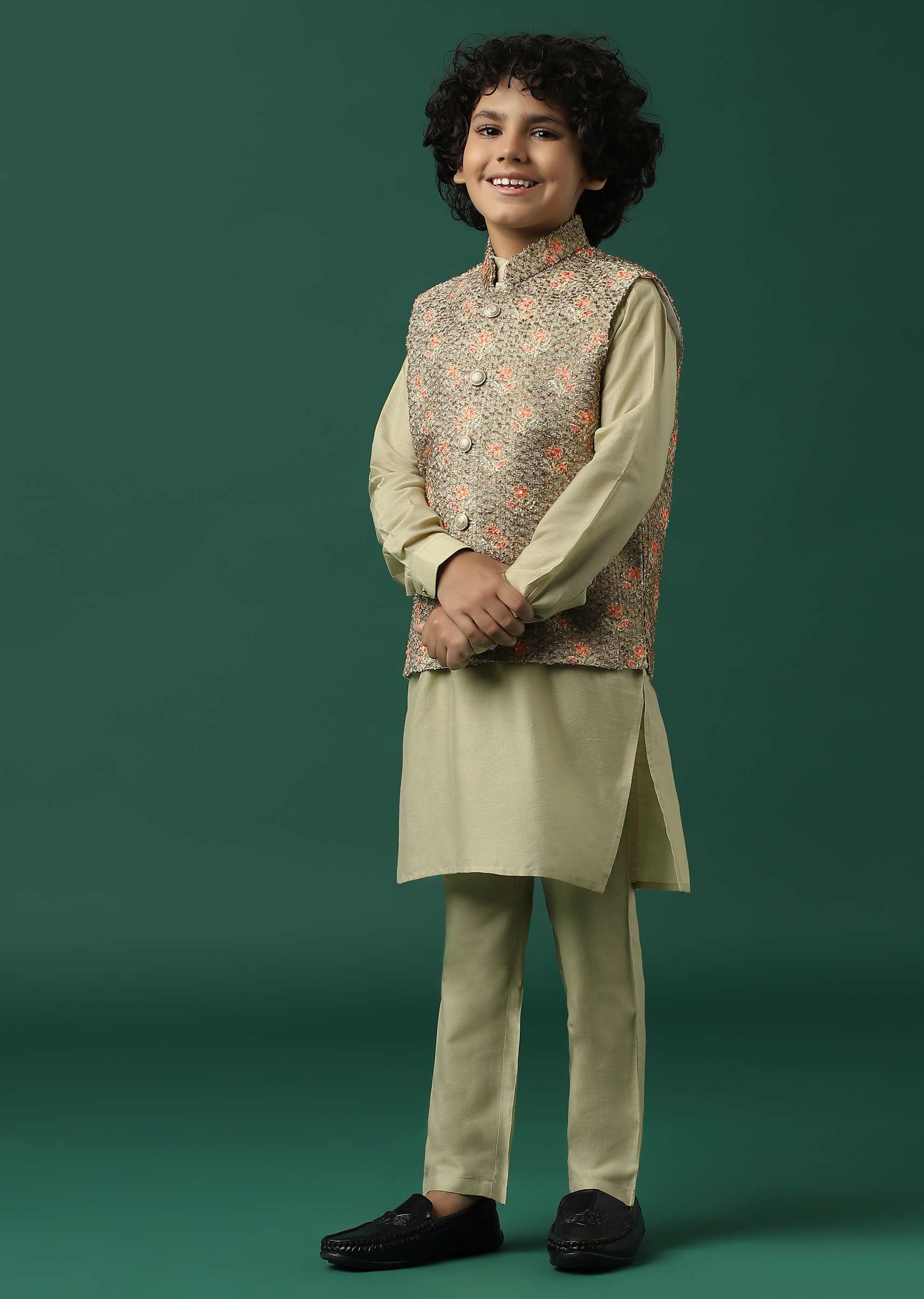 Kalki Beige Textured Bandi Jacket Set In Silk With Floral Print For Boys