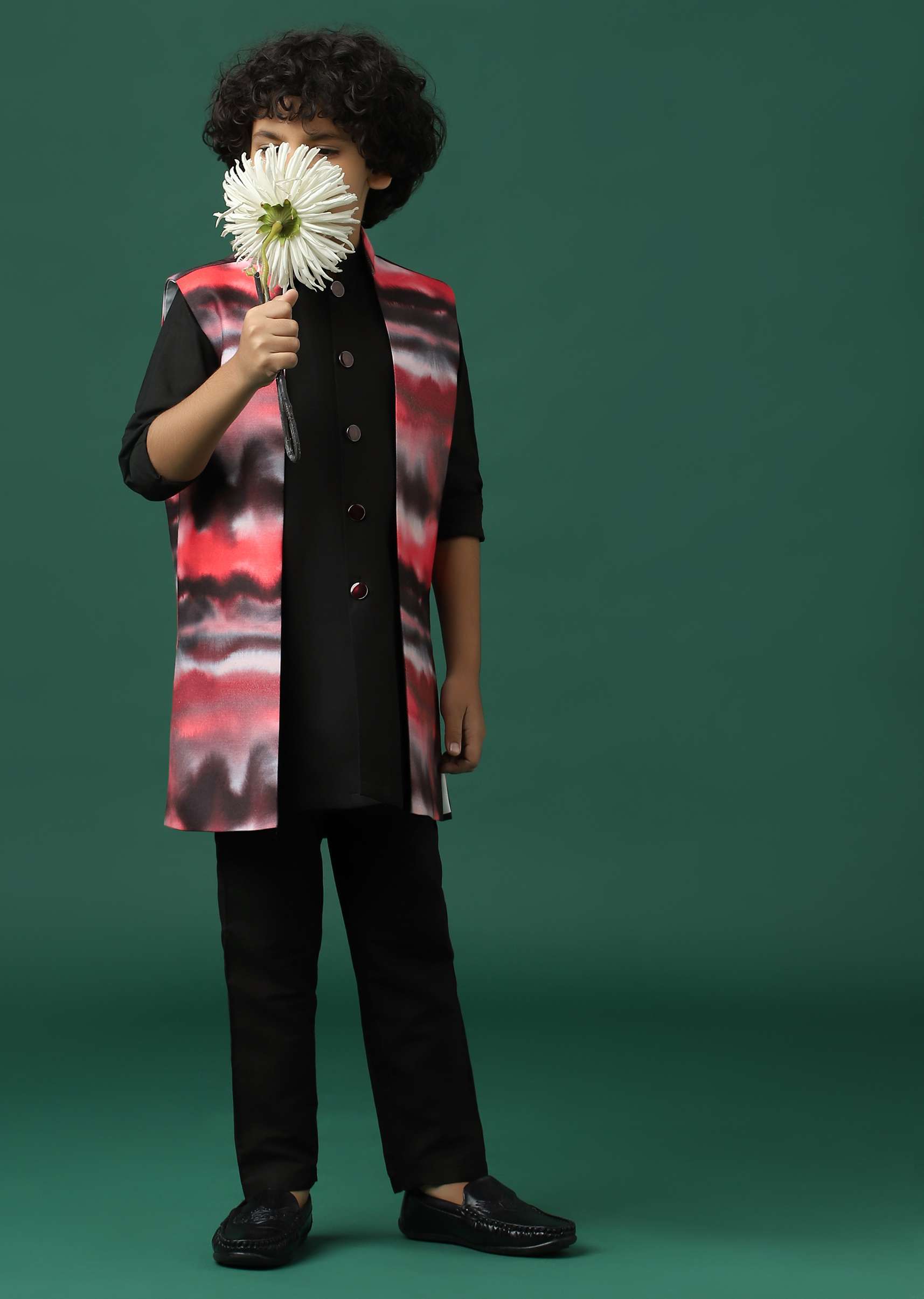 Kalki Black Printed Kurta Jacket Set In Silk For Boys