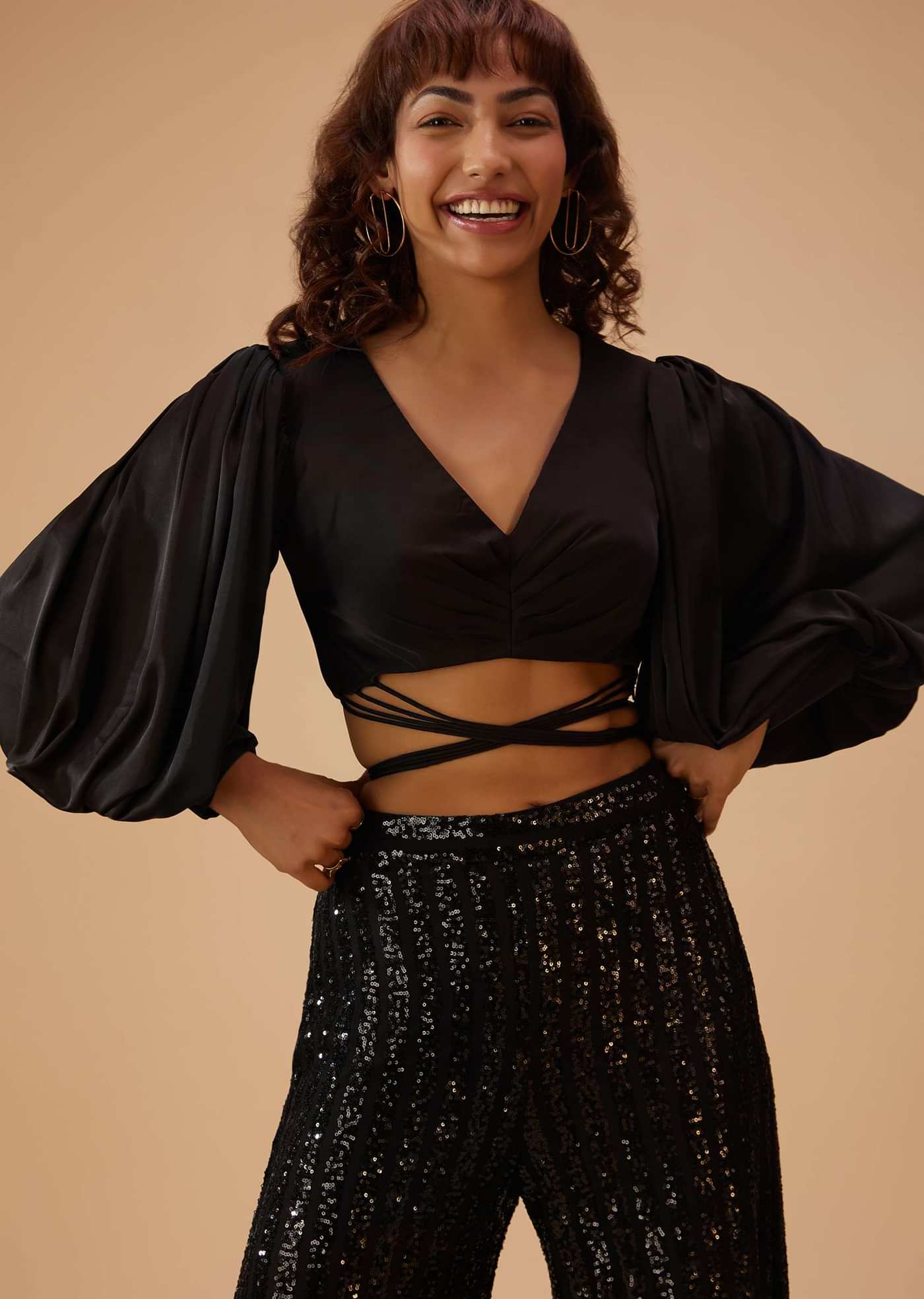 Caviar black palazzo and crop-top set.The palazzo is fabricated in sequins and the top is in satin.The palazzo has a wide-leg flare and comes with a side-zip closure secured by... More Product Details