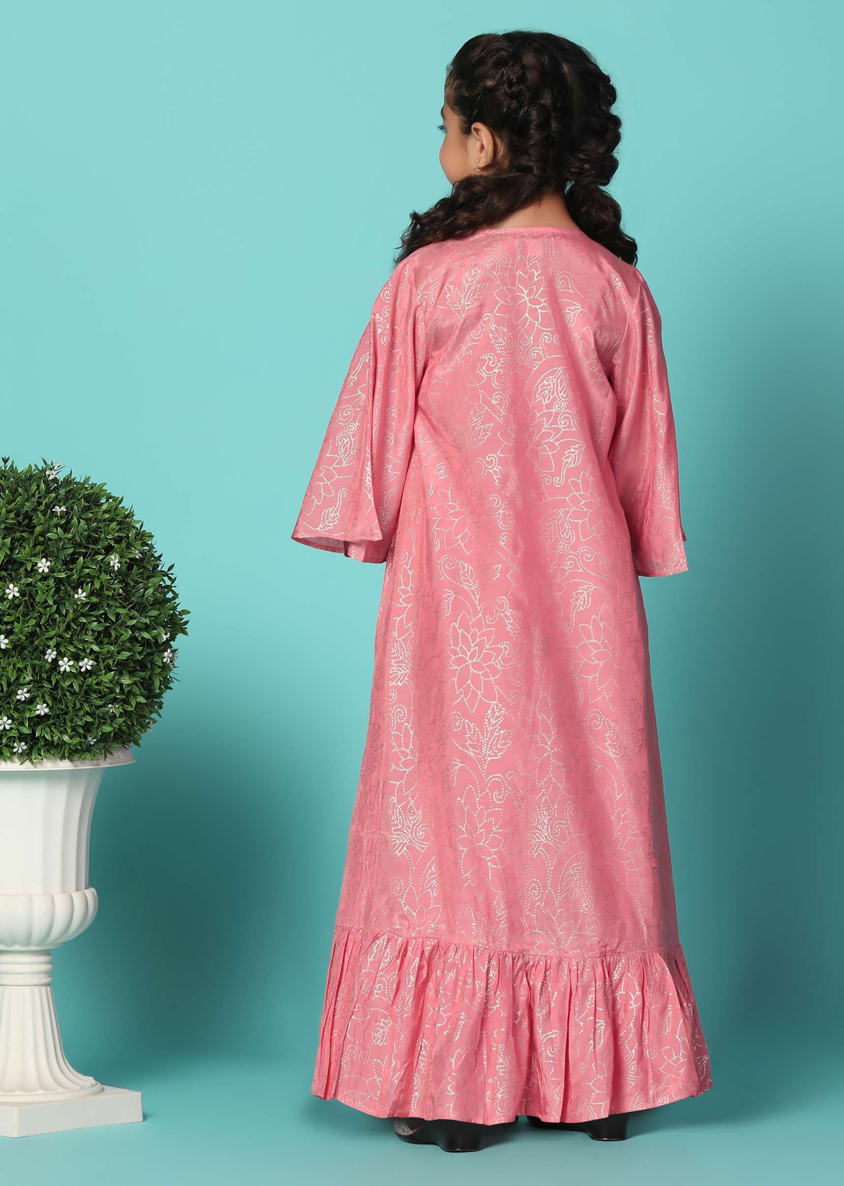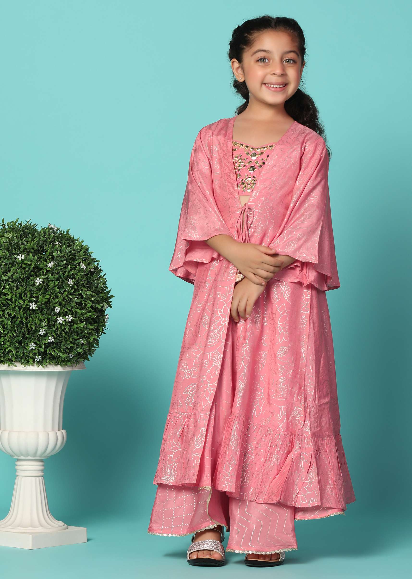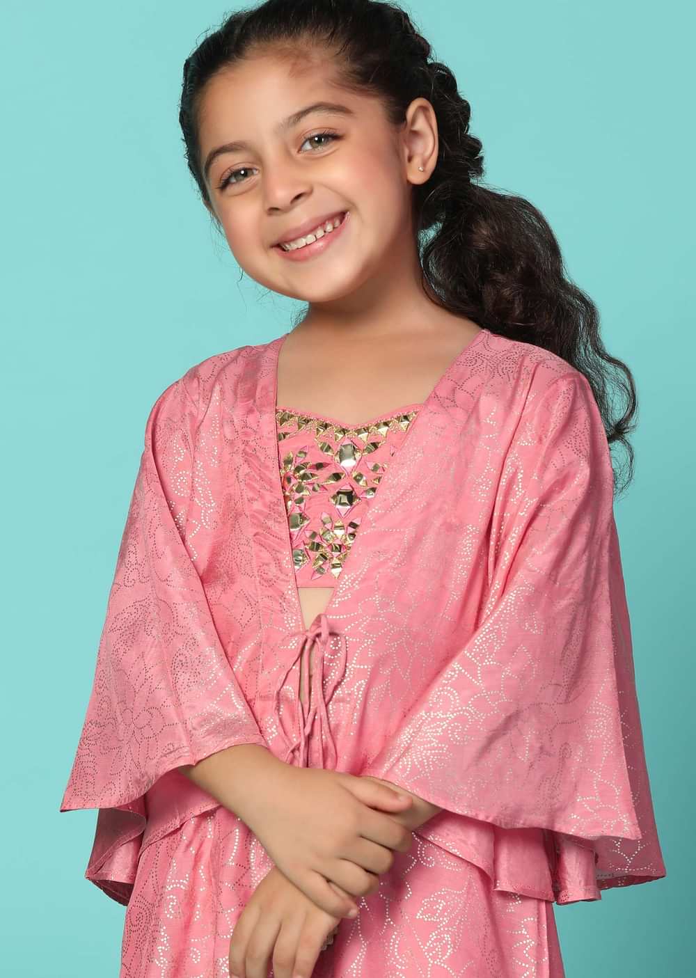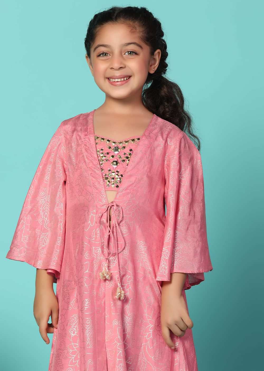 Elevate your little one's style with our coral pink top and lehenga set with a jacket in silk. This stunning ensemble is adorned with intricate mirror embroidery work on the top adding a touch of charm. The set includes a beautiful lehenga and a matching jacket.EVENT - Ideal for birthday parties.Change folds regularly. Awarded as the Most Trusted Brand, we're delivering styles you love, just as promised.