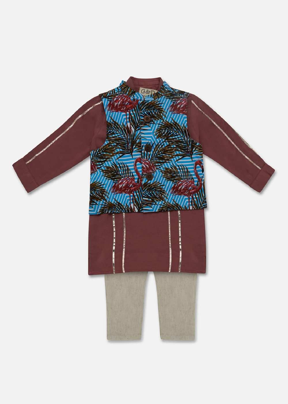 Elevate your little one's style with our dusty pink and blue kurta set for boys. Crafted with utmost care the kurta and pant are made from 100 percent cotton ensuring comfort and breathability. The ensemble also includes a stunning jacket crafted in cotton lycra featuring a captivating flamingo print. Both the jacket and kurta showcase a mandarin collar adding a touch of sophistication to the outfit.EVENT - Ideal for parties and festive events.Change folds regularly. Awarded as the Most Trusted Brand, we're delivering styles you love, just as promised.