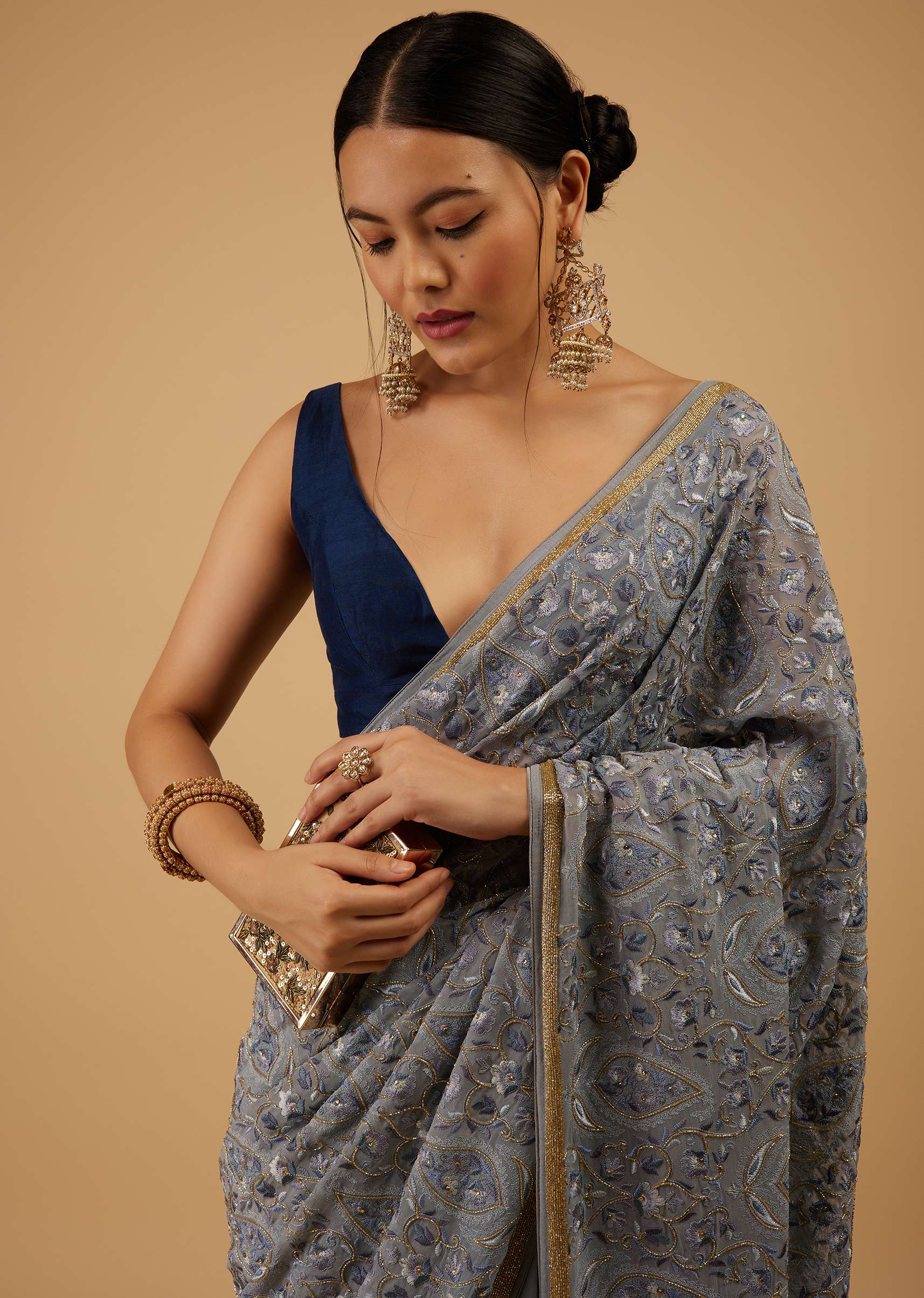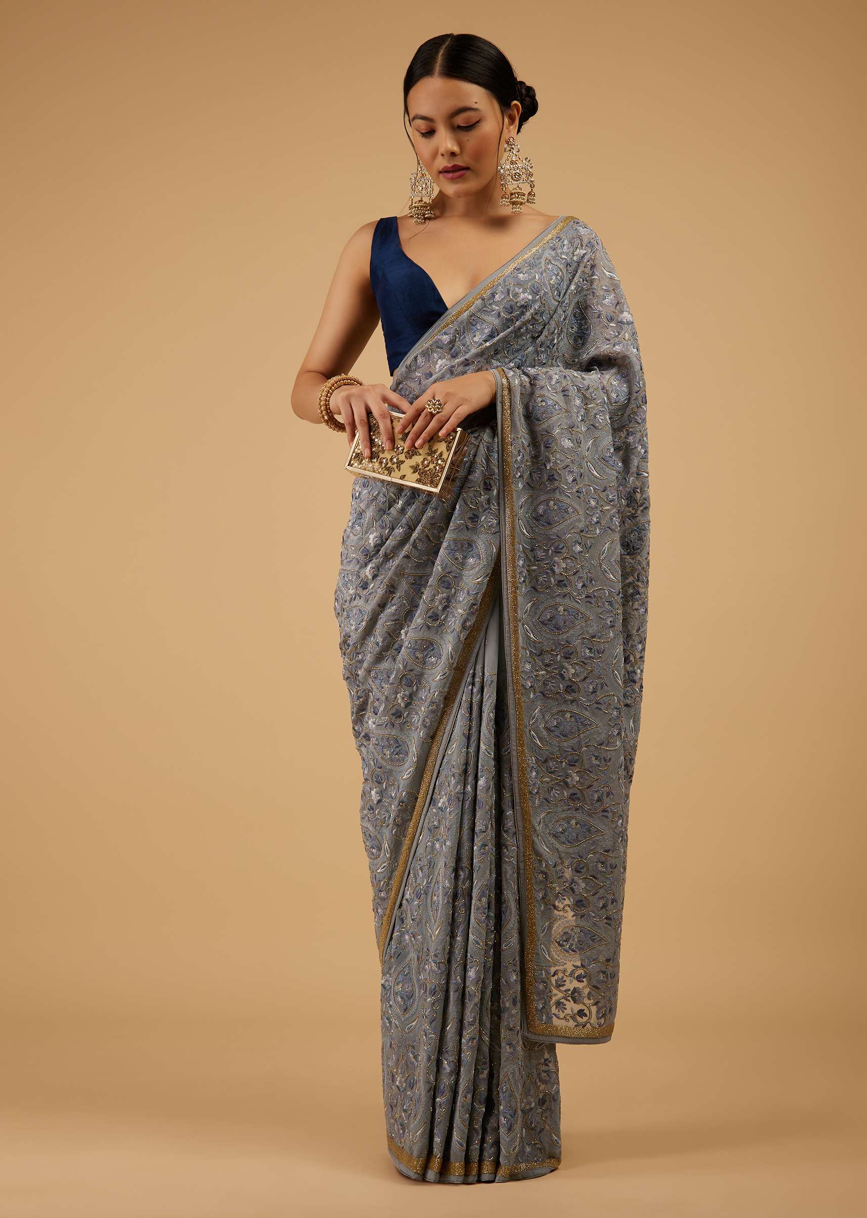 Festive Fog Grey Saree Kashmiri Floral Embroidered In Georgette