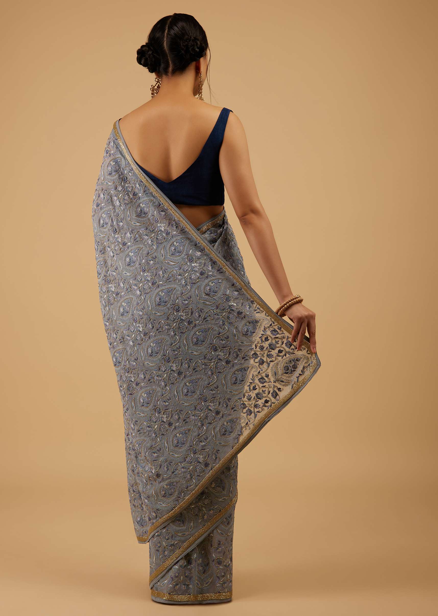 Kalki Festive Quarry Grey Kashmiri Embroidered Saree In Georgette. The saree is fabricated in georgette and embroidered in Kashmiri threadwork with cut dana embroidery and stone embellishments. The lower half... More Product Details