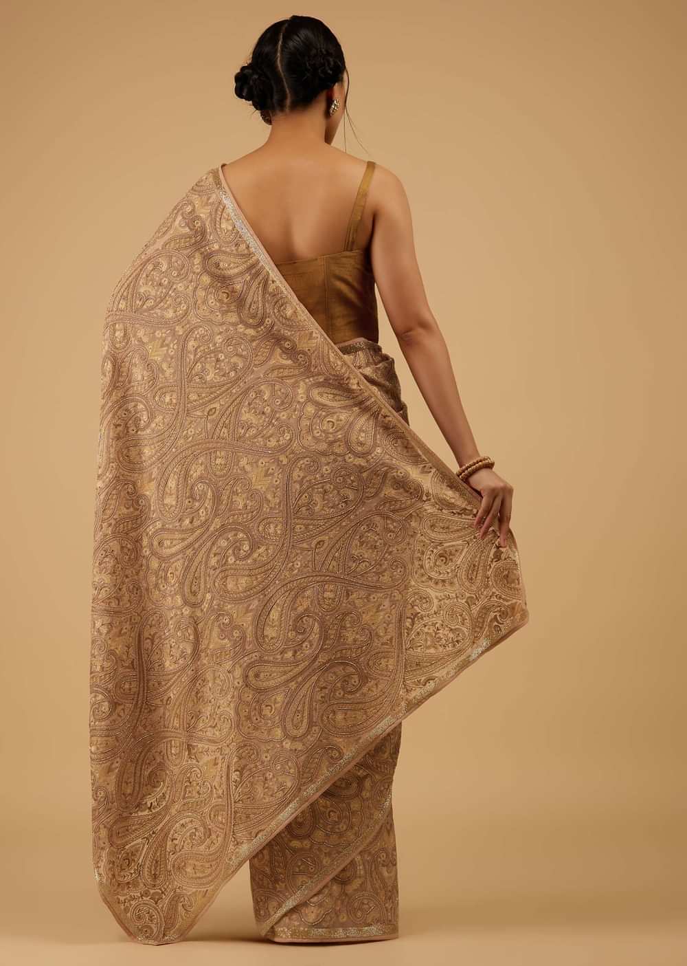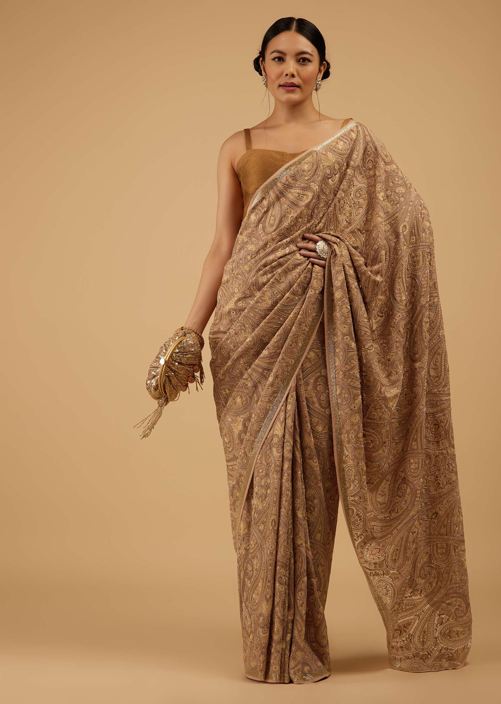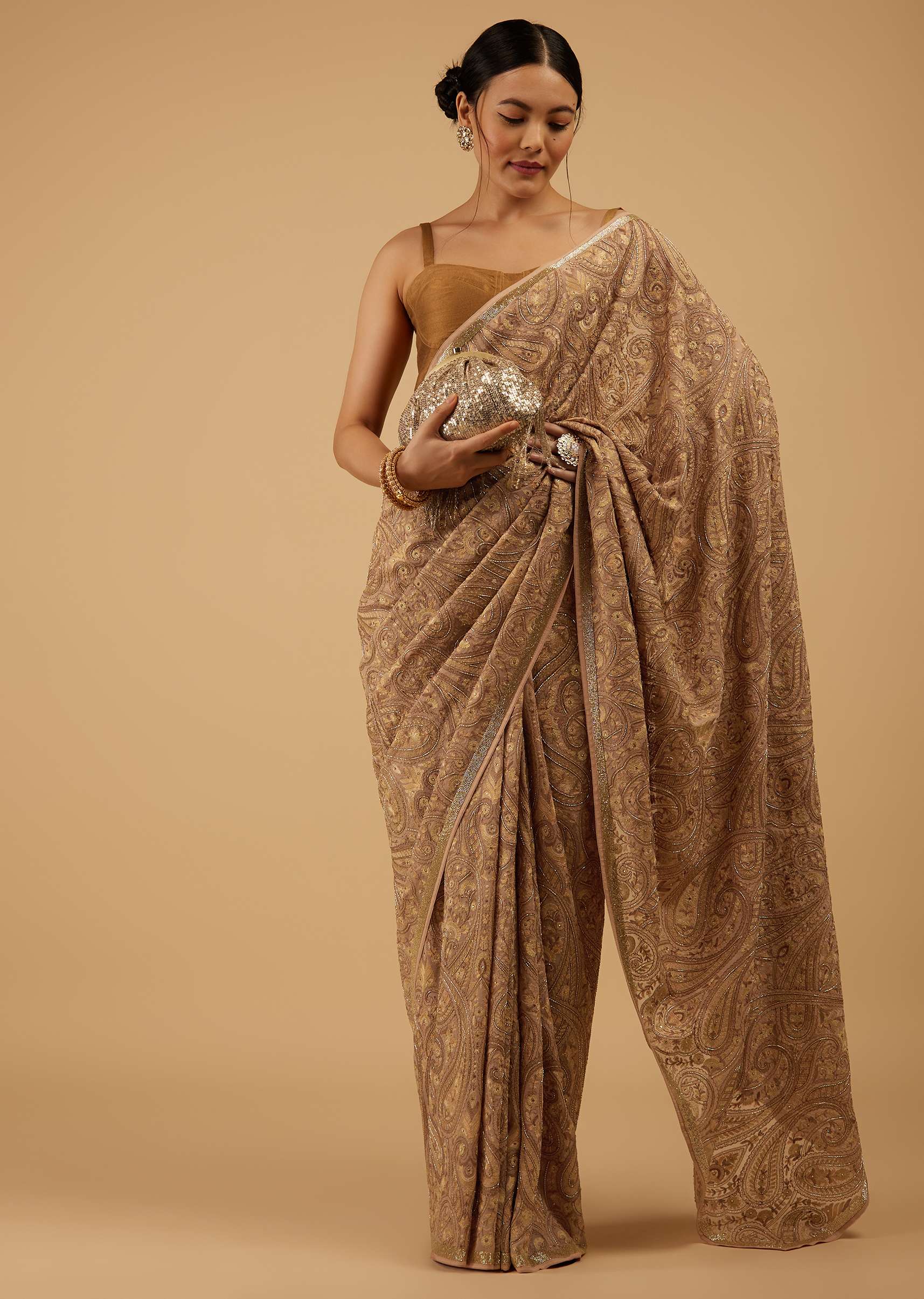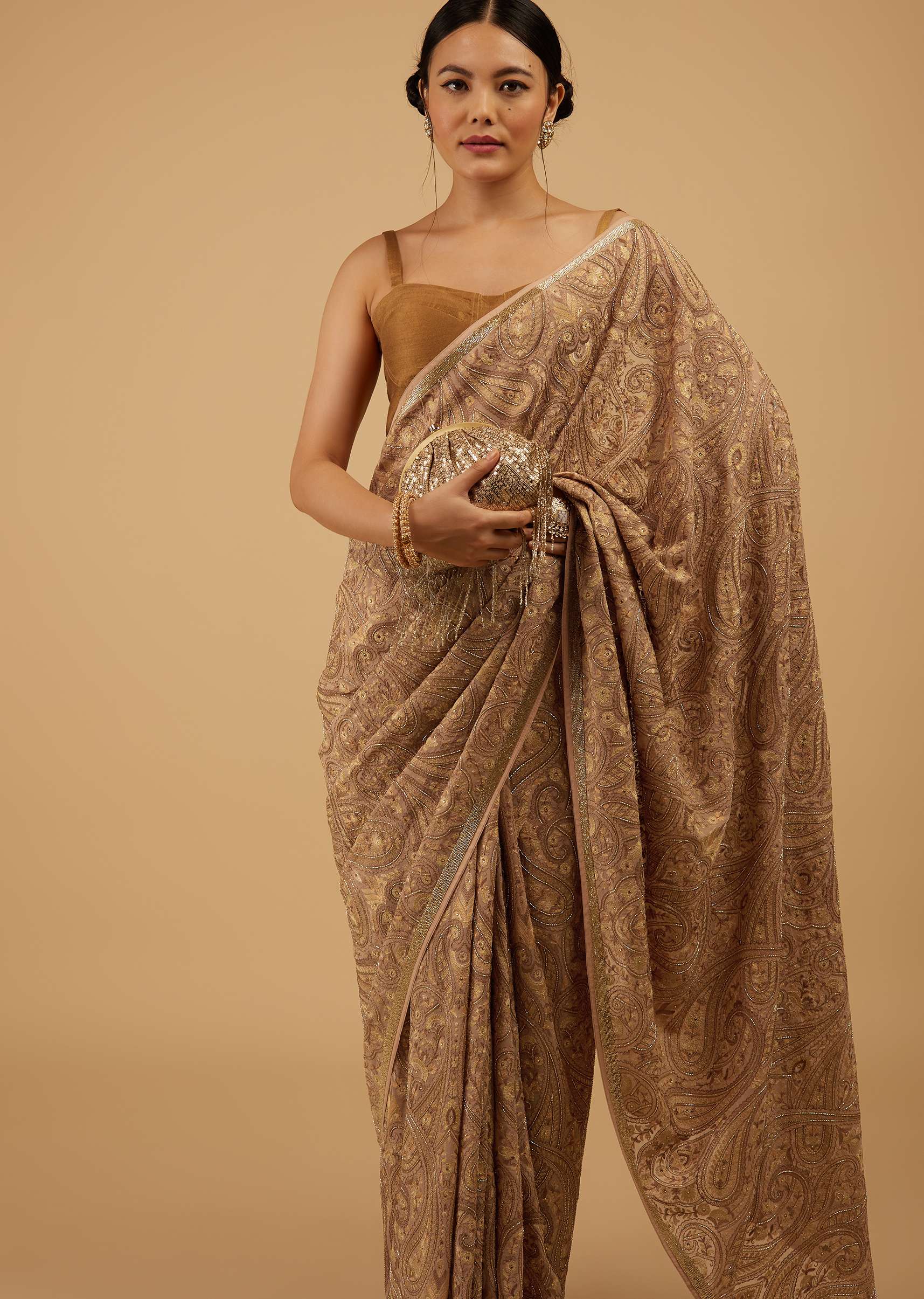 Mocha Brown Festive Toasted Almond Beige Saree Kashmiri Embroidered In Georgette