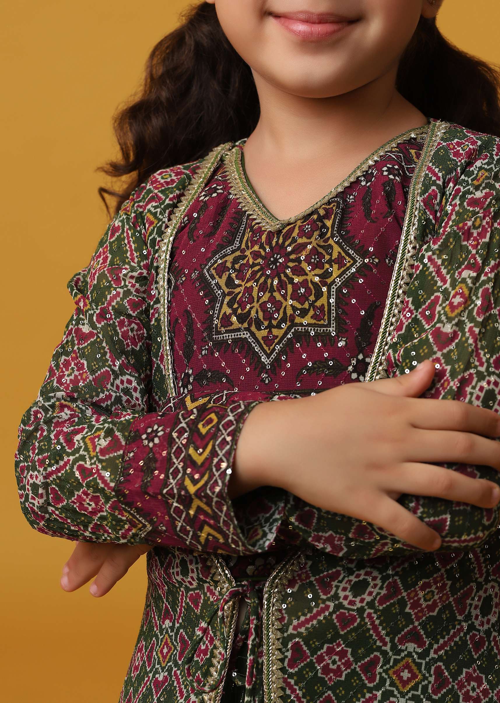 Dress your little girl in our forest green top and palazzo set with jacket, crafted in soft viscose georgette. The set features a captivating print pattern adorned with shimmering sequins... More Product Details