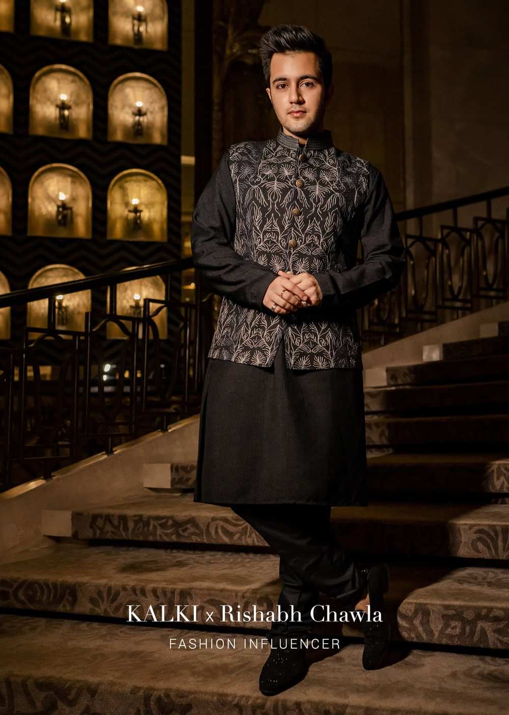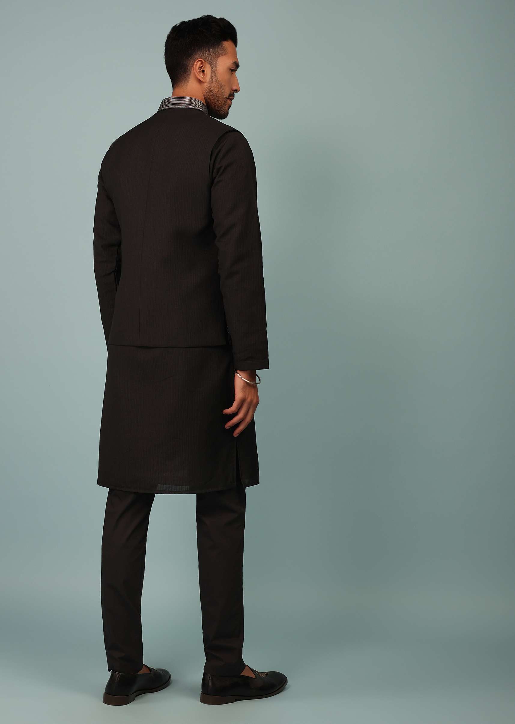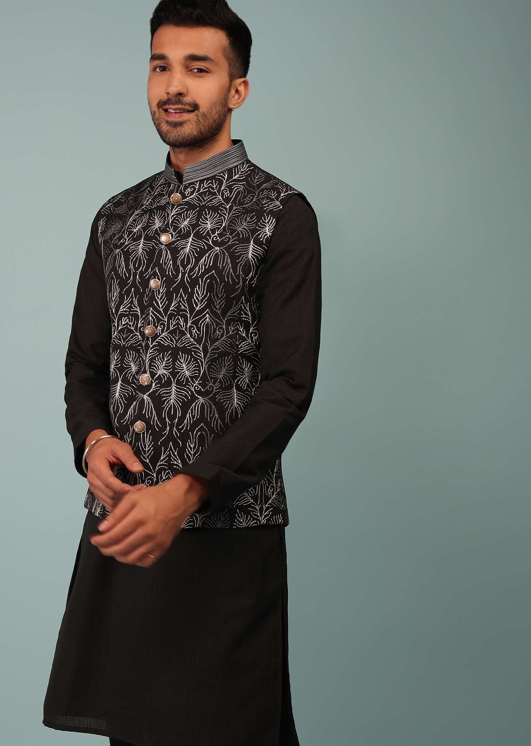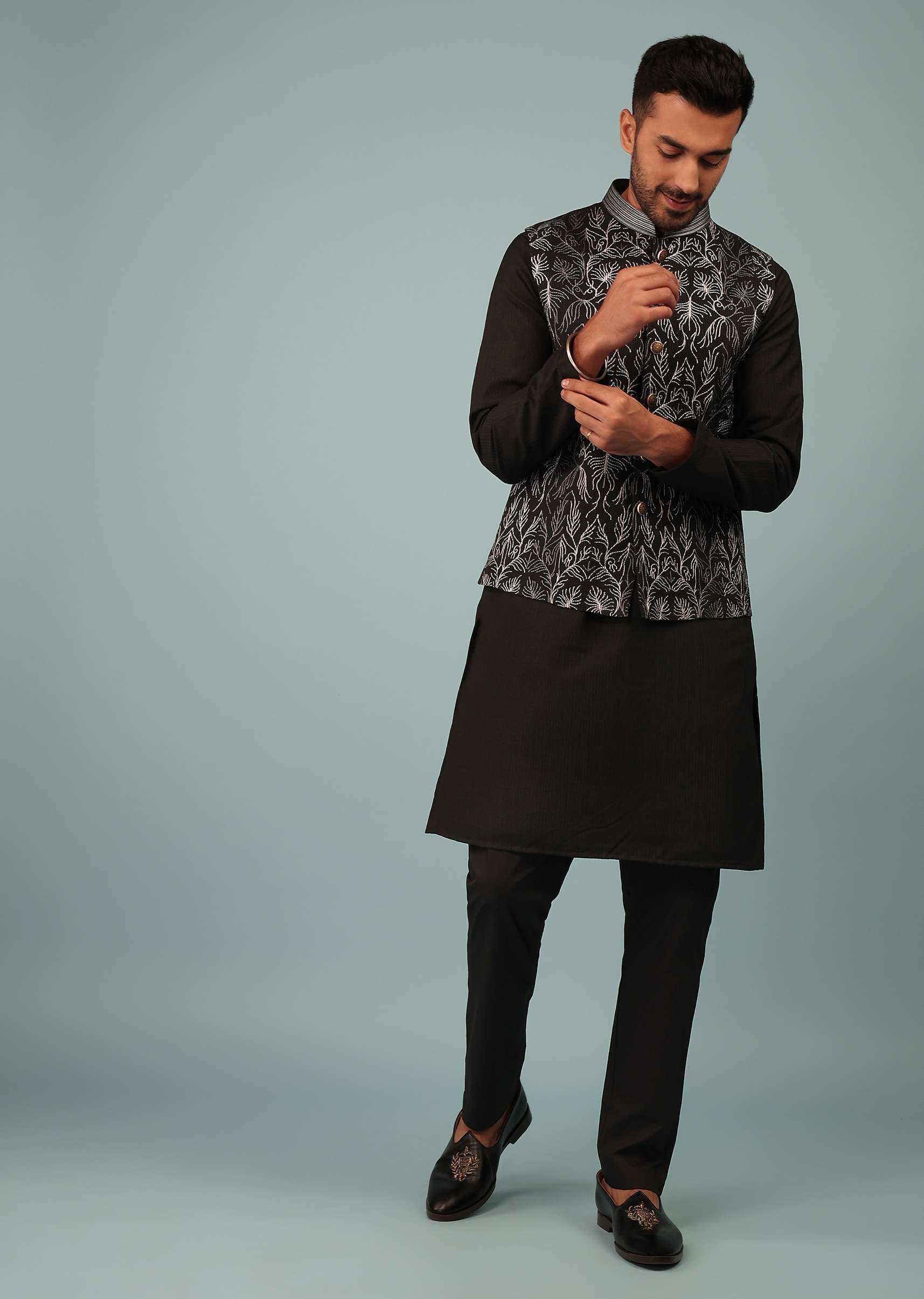 Festivities begin with Kalki in the most fantastic ways. Festive Jet Black Bandi Jacket in silk suiting fabric with machine Aari embroidery. The outfit is fabricated in Silk. The jacket is paired with a matching silk kurta. The jacket is crafted in a mandarin collar with cut sleeves, and front button closure, secured with a hook. The jacket comes with floral pattern stitch aari embroidery in resham and zari. The jacket comes with fancy buttons. The matching kurta comes in full sleeves in a mandarin collar style. The cuffs and the collars of the kurta are embroidered in a thread line stitch. The kurta comes in a textured fabric. The kurta comes secured with a front hook closure. The outfit is paired with matching trouser pants. Elevate the look by pairing the outfit with some classic mules. Button design, shape, and size may vary as per availability. Awarded As The Most Trusted Brand We'Re Delivering Styles You Love Just As Promised.