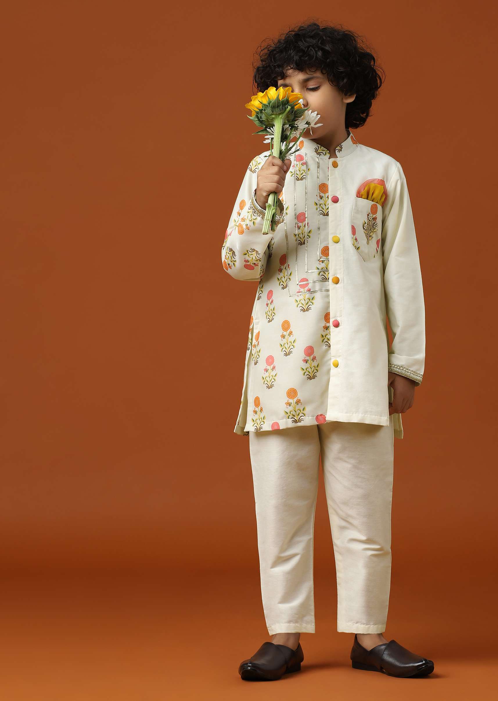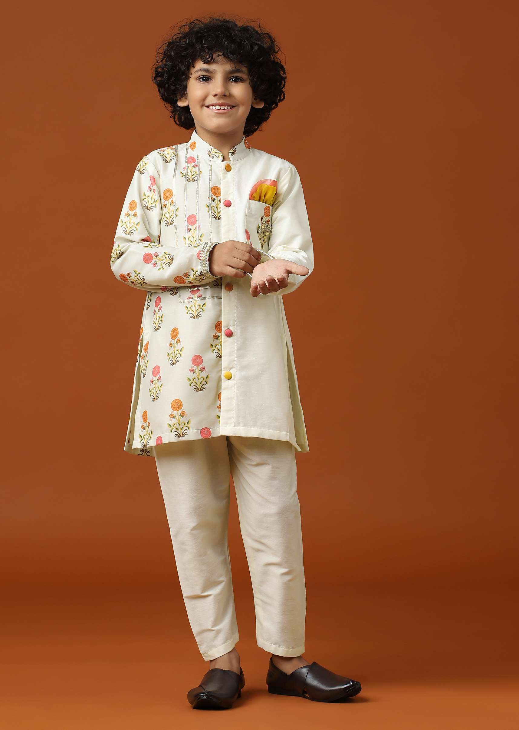 Introducing our off-white with orange tone digitally printed kurta pant set with hints of orange, crafted with care to suit your little boy's comfort and style. Made with a blend of cotton and silk, this set boasts softness, durability, and a smooth finish that feels amazing on the skin.The mandarin collar adds a touch of traditional sophistication.A pair of matching Aligarhi pants comes included.EVENT - Ideal for Raksha Bandhan and festive celebrations. Change folds regularly. Awarded As The Most Trusted Brand We'Re Delivering Styles You Love Just As Promised.
