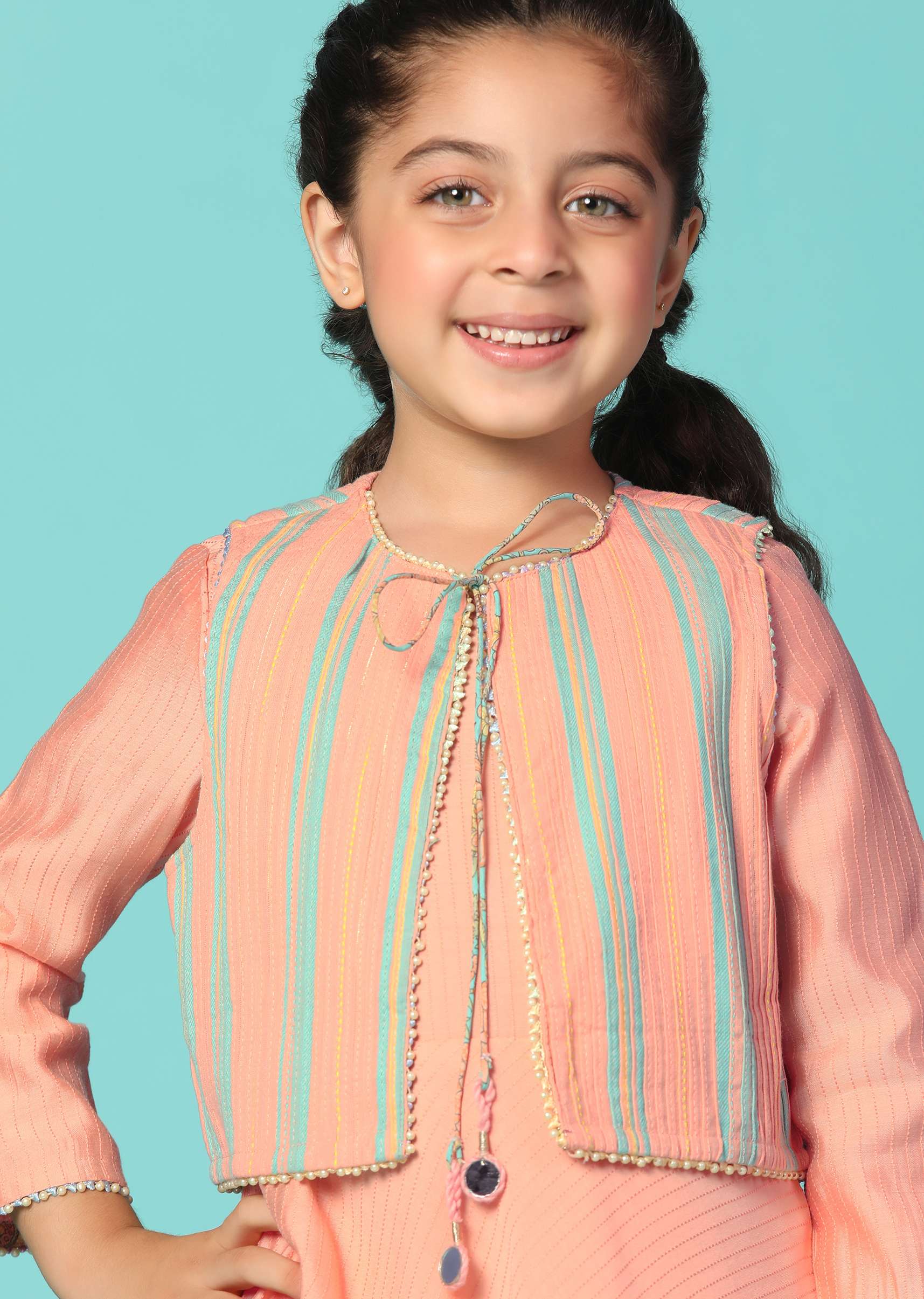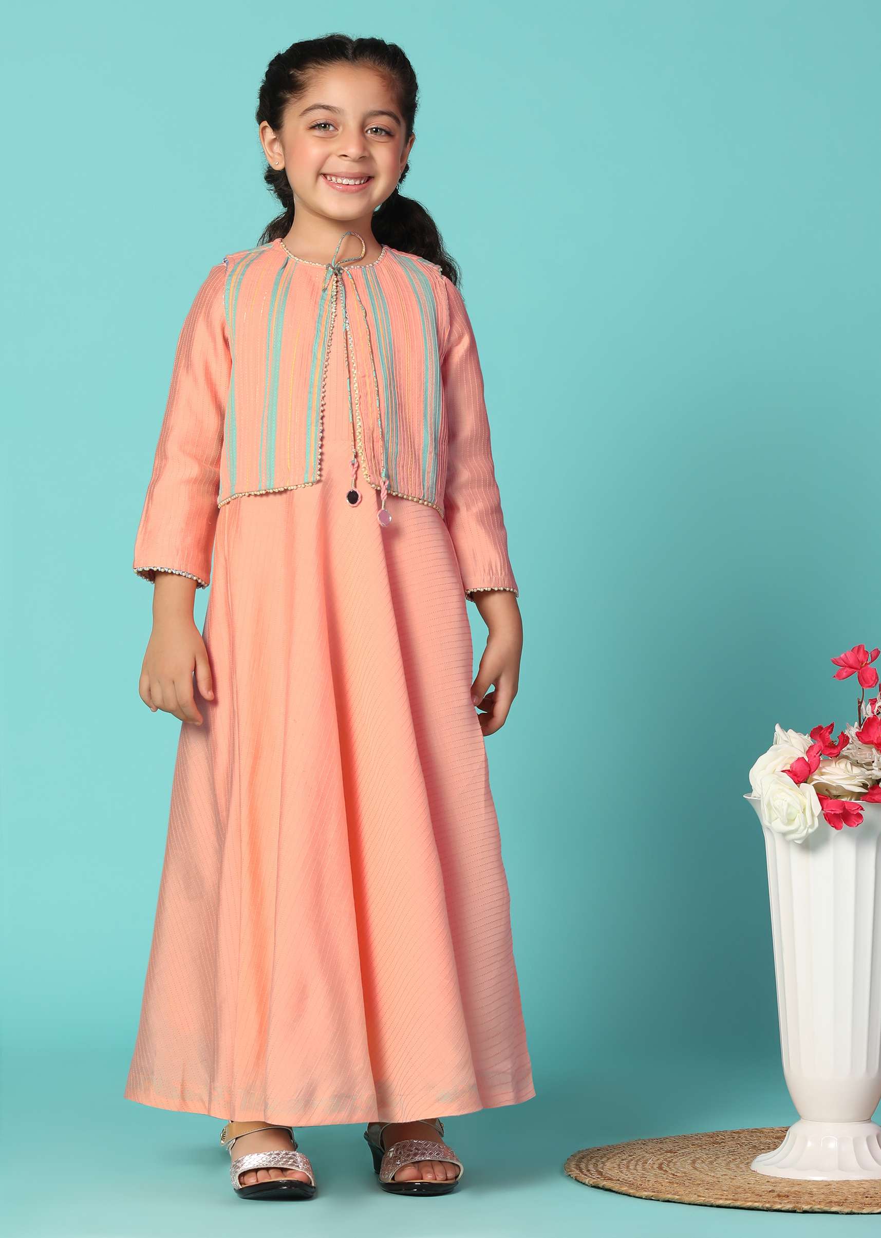 Introducing our peach pink printed gown and jacket set in cotton. This charming set features a gorgeous print and is paired with a matching jacket. The jacket showcases a trendy two-color stripe pattern adding a touch of flair to the ensemble. EVENT - Perfect for birthday parties and festive events.Change folds regularly. Awarded as the Most Trusted Brand, we're delivering styles you love, just as promised.