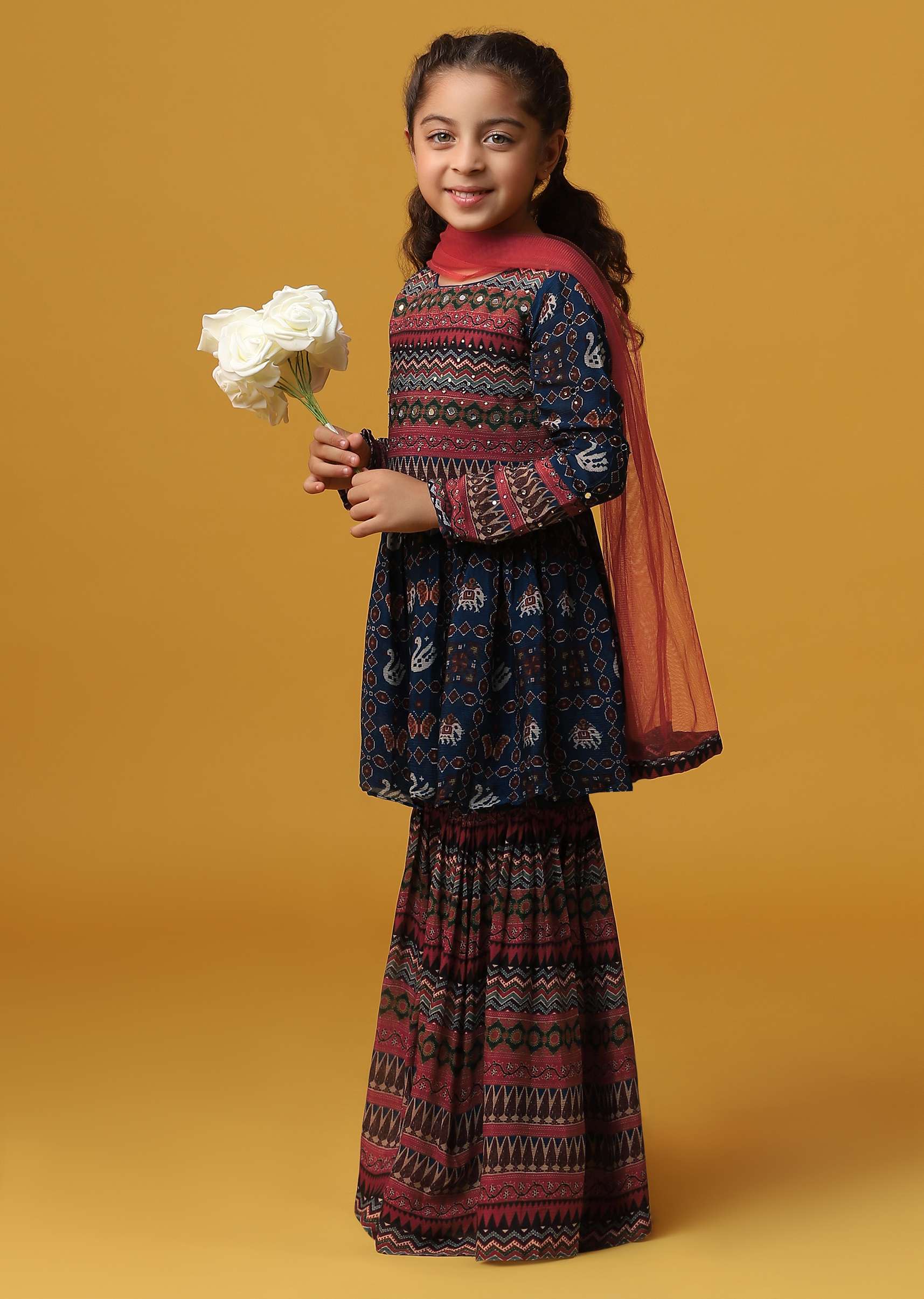 Kalki Peacock Blue Printed Kurta And Sharara Set In Georgette For Girls