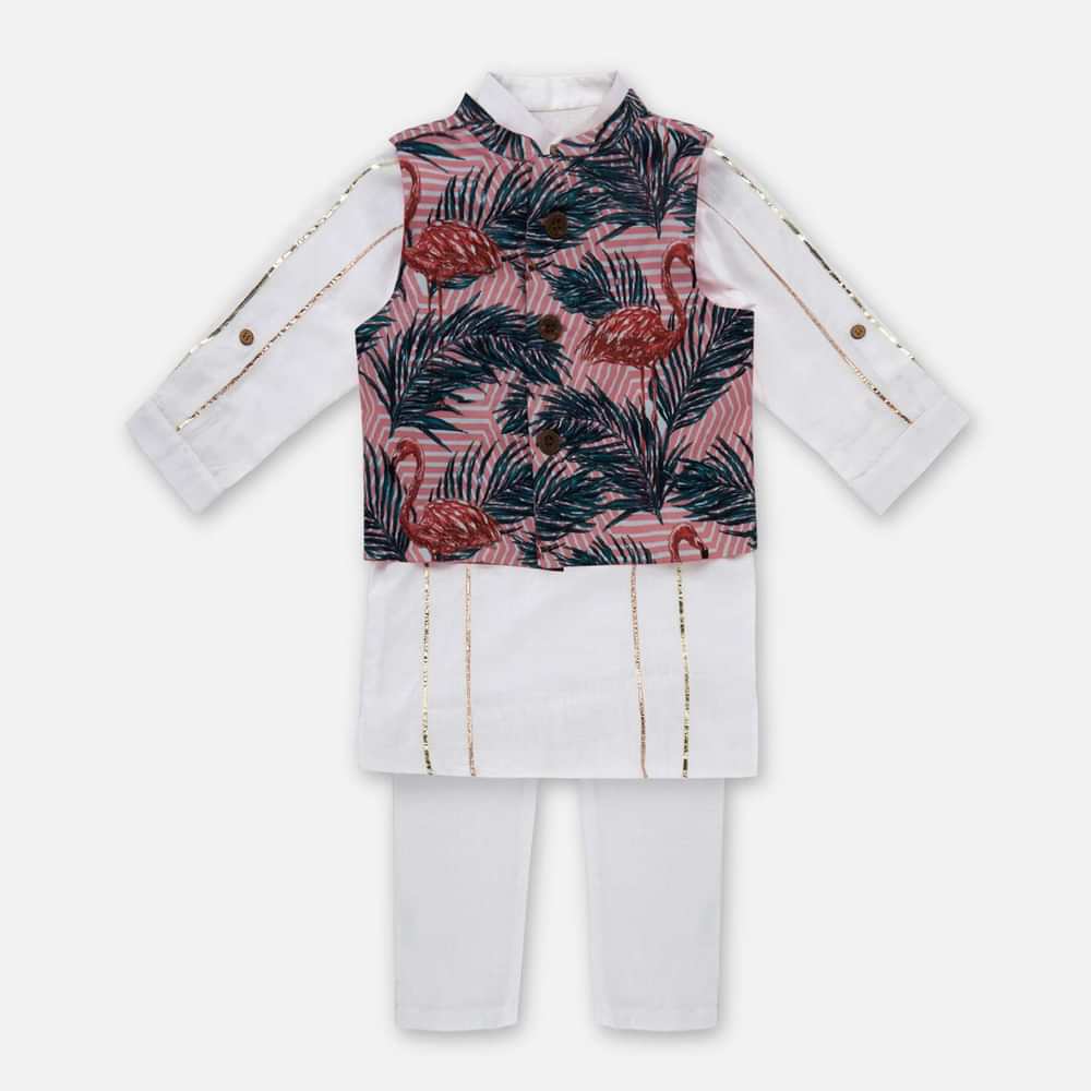 Elevate your little one's style with our rose pink and white kurta set for boys. Crafted with utmost care the kurta and pant are made from 100 percent cotton ensuring comfort and breathability. The ensemble also includes a stunning jacket crafted in cotton lycra featuring a captivating flamingo print. Both the jacket and kurta showcase a mandarin collar adding a touch of sophistication to the outfit.EVENT - Ideal for parties and festive events.Change folds regularly. Awarded as the Most Trusted Brand, we're delivering styles you love, just as promised.