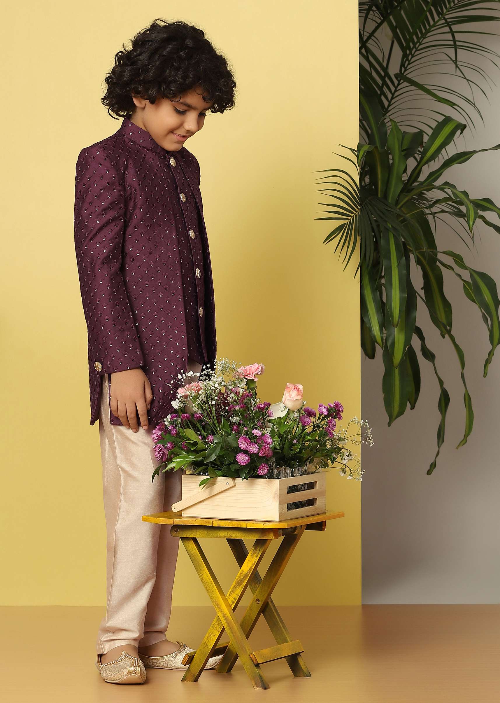 Kalki Wine Embroidered Sherwani Set In Raw Silk With Threadwork And Sequins For Boys