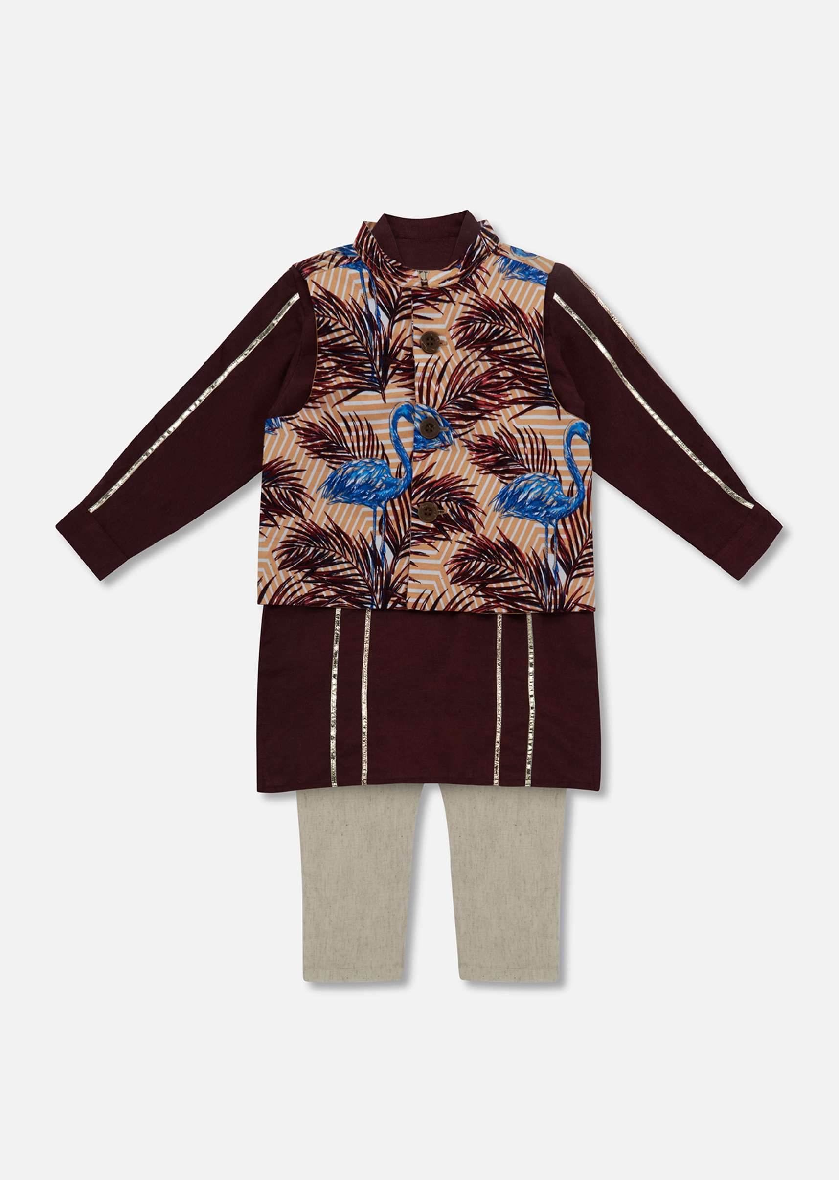 Kalki Wine Purple Flamingo Printed Jacket Kurta Set In Cotton For Boys