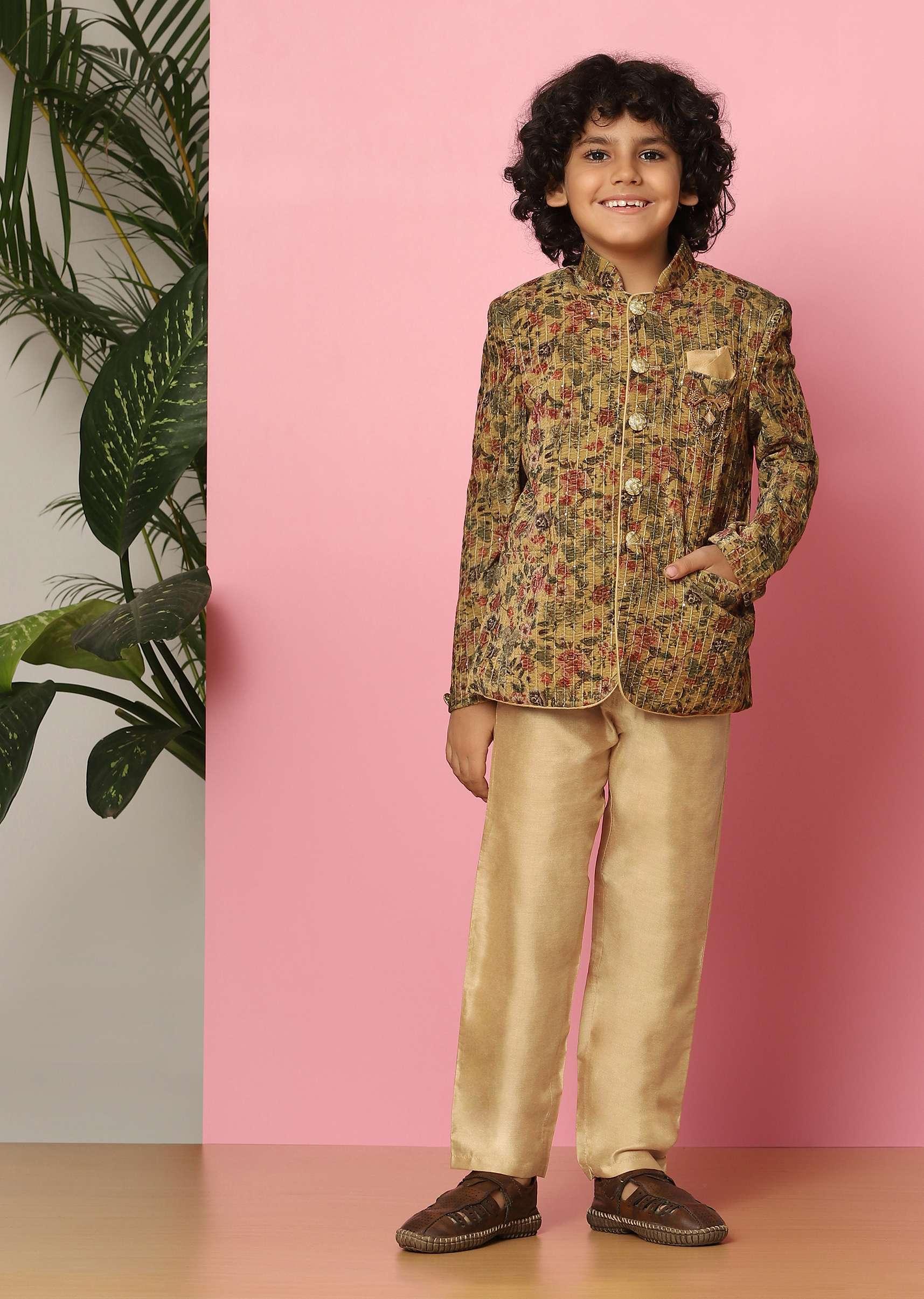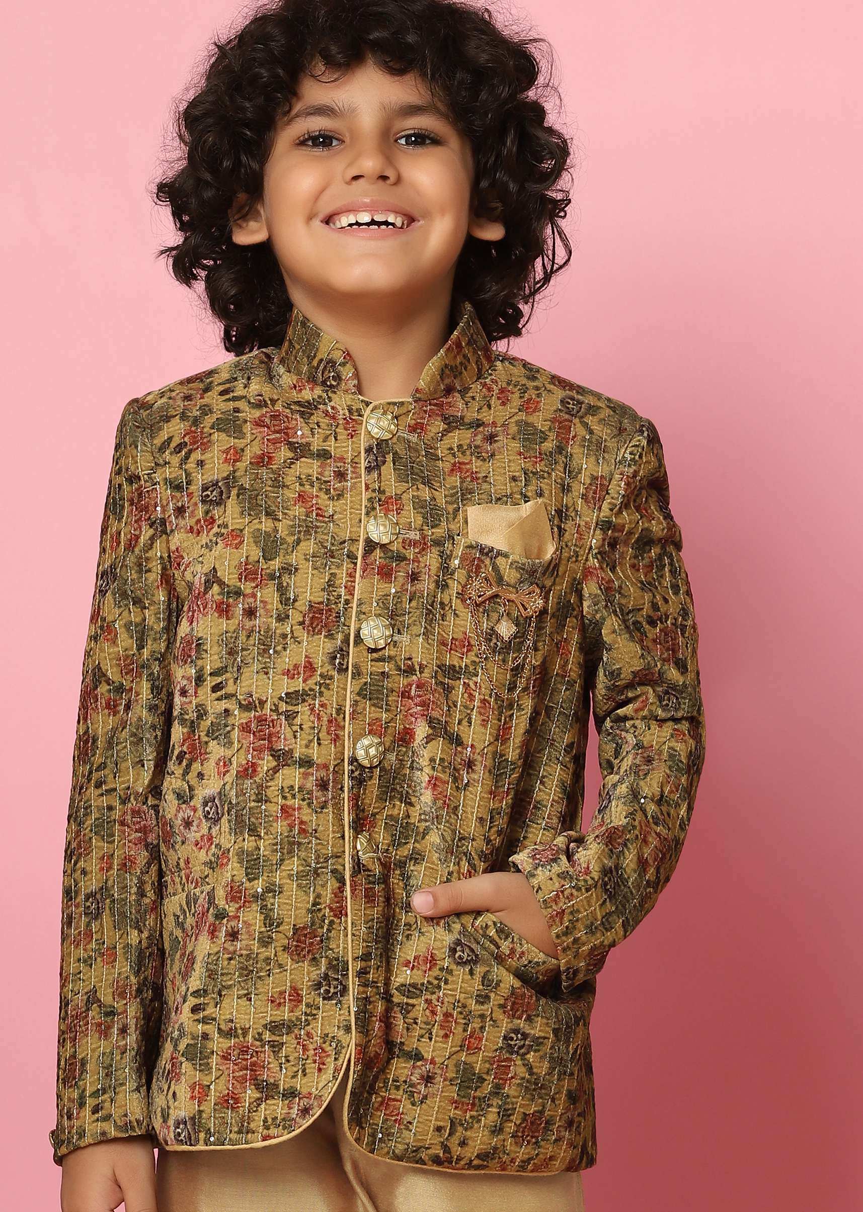 Make your little ones set the bar high in this ravishing sherwani set. The detailing on the outfit makes for a perfect outfit, for all special occasions. A perfect outfit to be worn by your tiny angels at your friend's wedding function or any family occasion when paired with matching footwear and sunglasses.