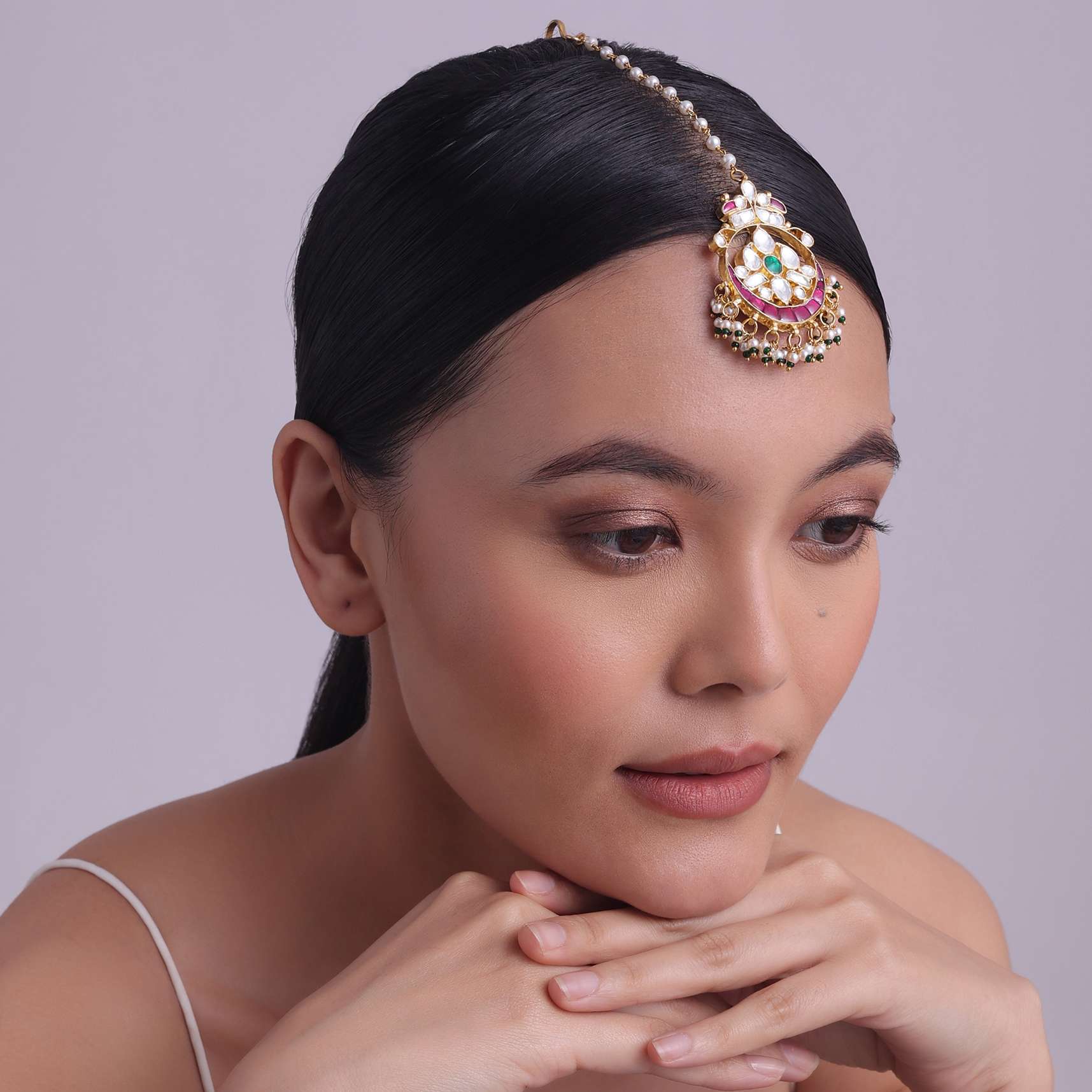 An enigmatic maangtikka with gold finish kundan, pearls with ruby and emerald stones. Made with intricate detailing and craftsmanship. Handcrafted using best quality material. The jewellery piece is polished and... More Product Details
