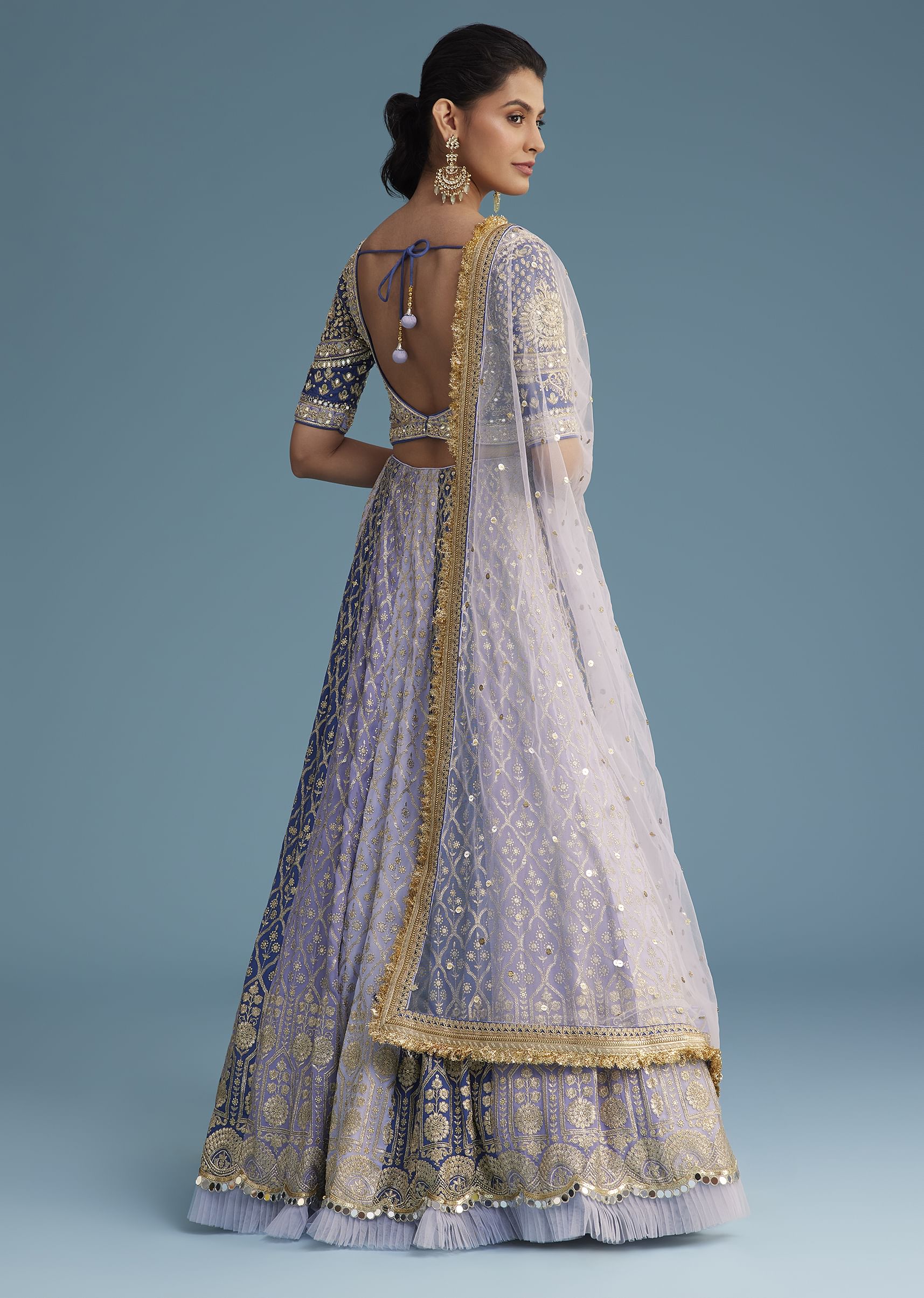 - This stunning lavender and blue silk-Georgette lehenga set features intricate embroidery with mirror, sequins, zardosi, moti, zari, and gotta lace detailing.