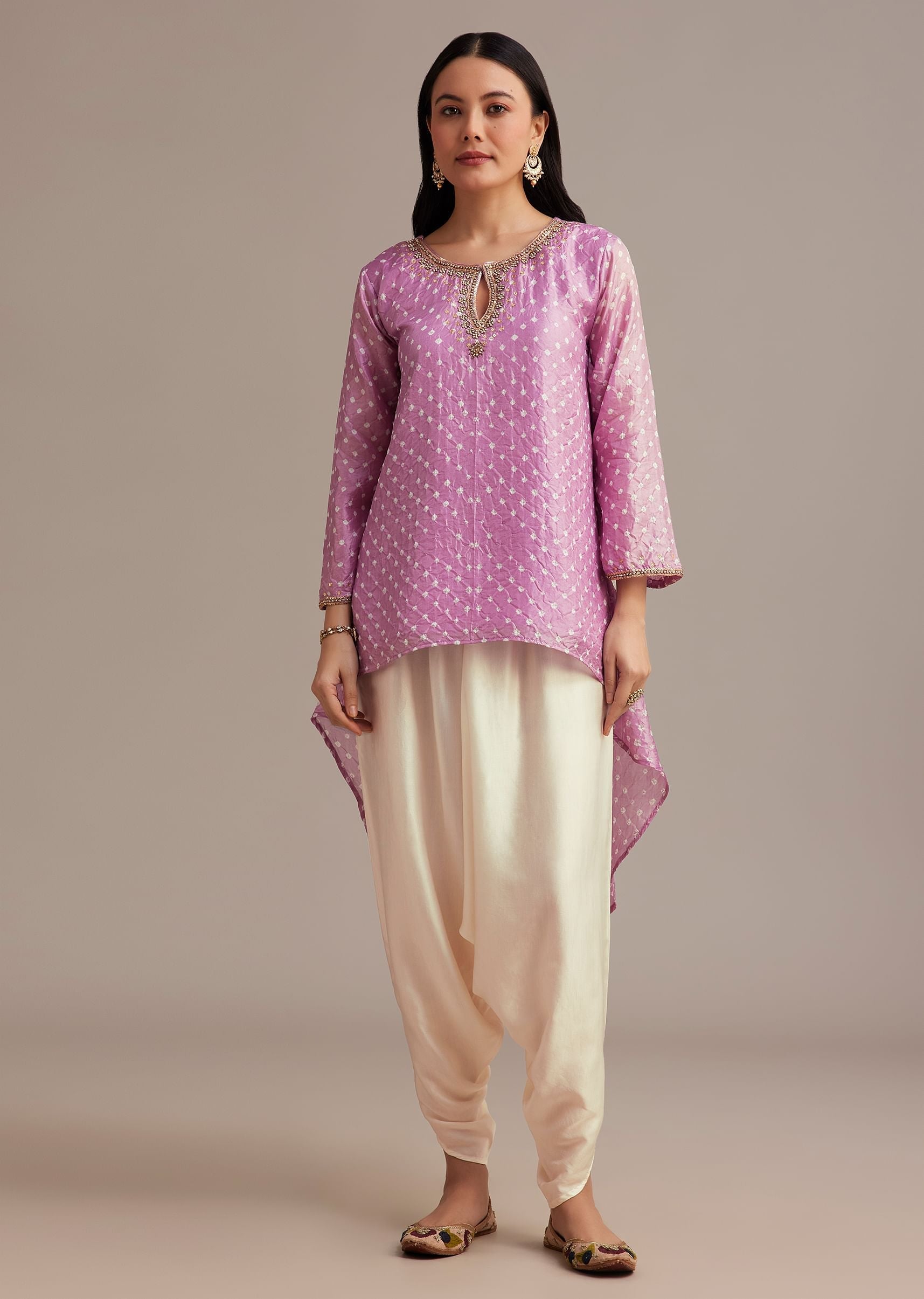Lavender Bandhani High Low Kurta Set With Dhoti