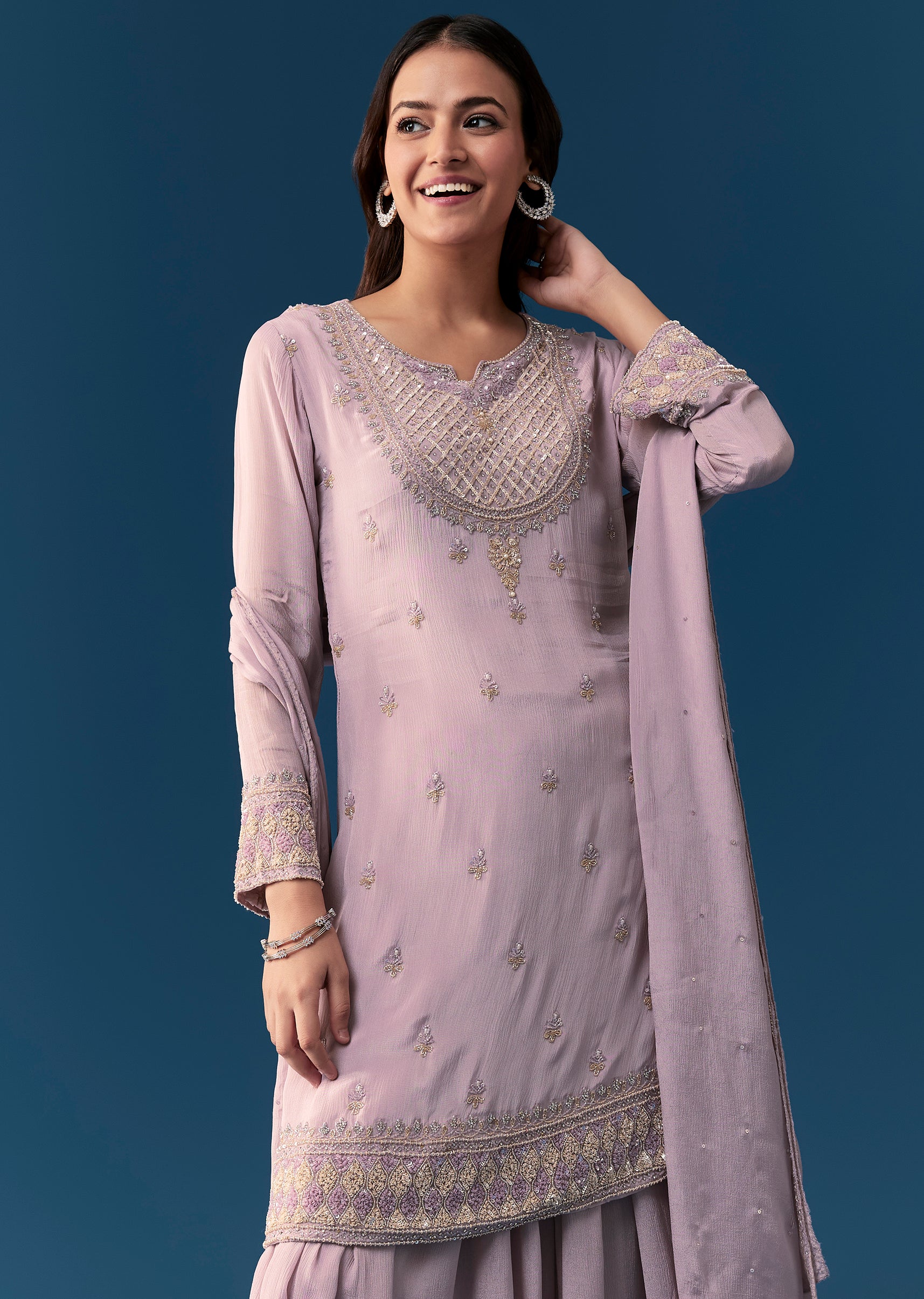 Lavender Chinon Palazzo Set With Sequins And Stone Work.