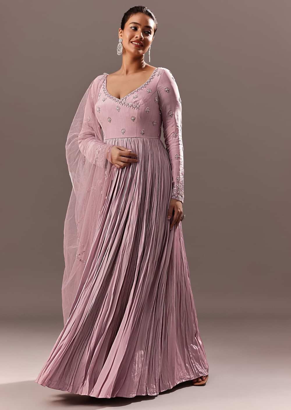 With this stunning Anarkali suit with lavender embroidery, which exudes timeless beauty and charm, you enter a world of luxury. A mesmerizing design is created by the intricate handwork embroidery... More Product Details