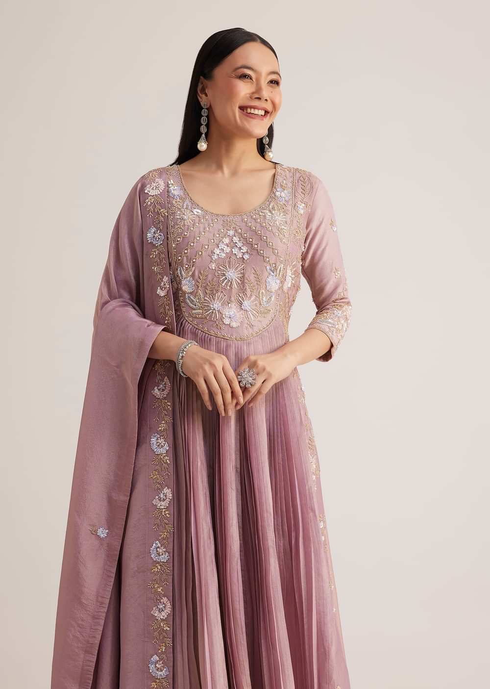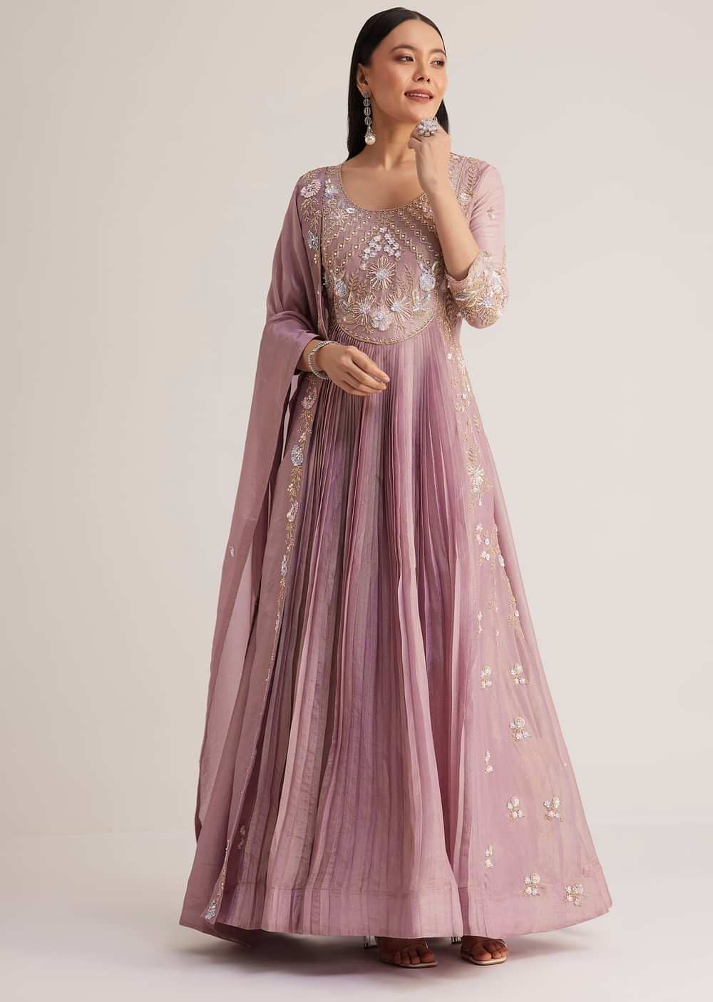 Embrace Timeless Elegance With This Lavender Anarkali Beautifully Adorned With Delicate Pastel Embroidery And Shimmering Sequin Work. Perfect For Engagement Ceremonies Or Festive Gatherings This Outfit Features Intricate Floral Patterns... More Product Details