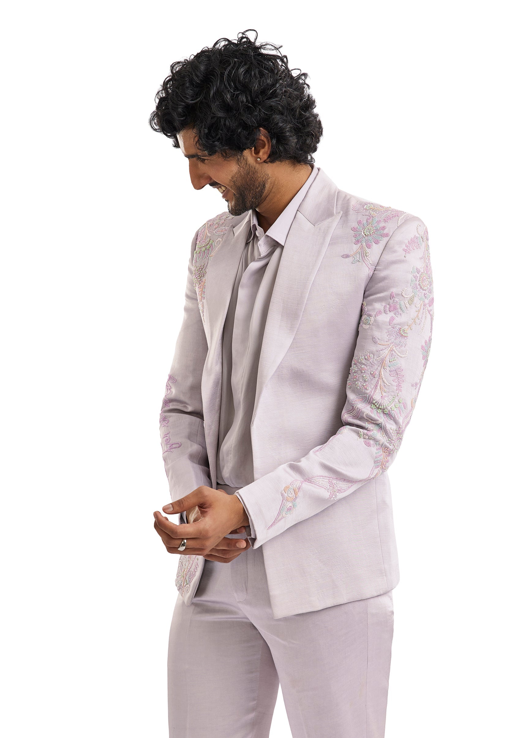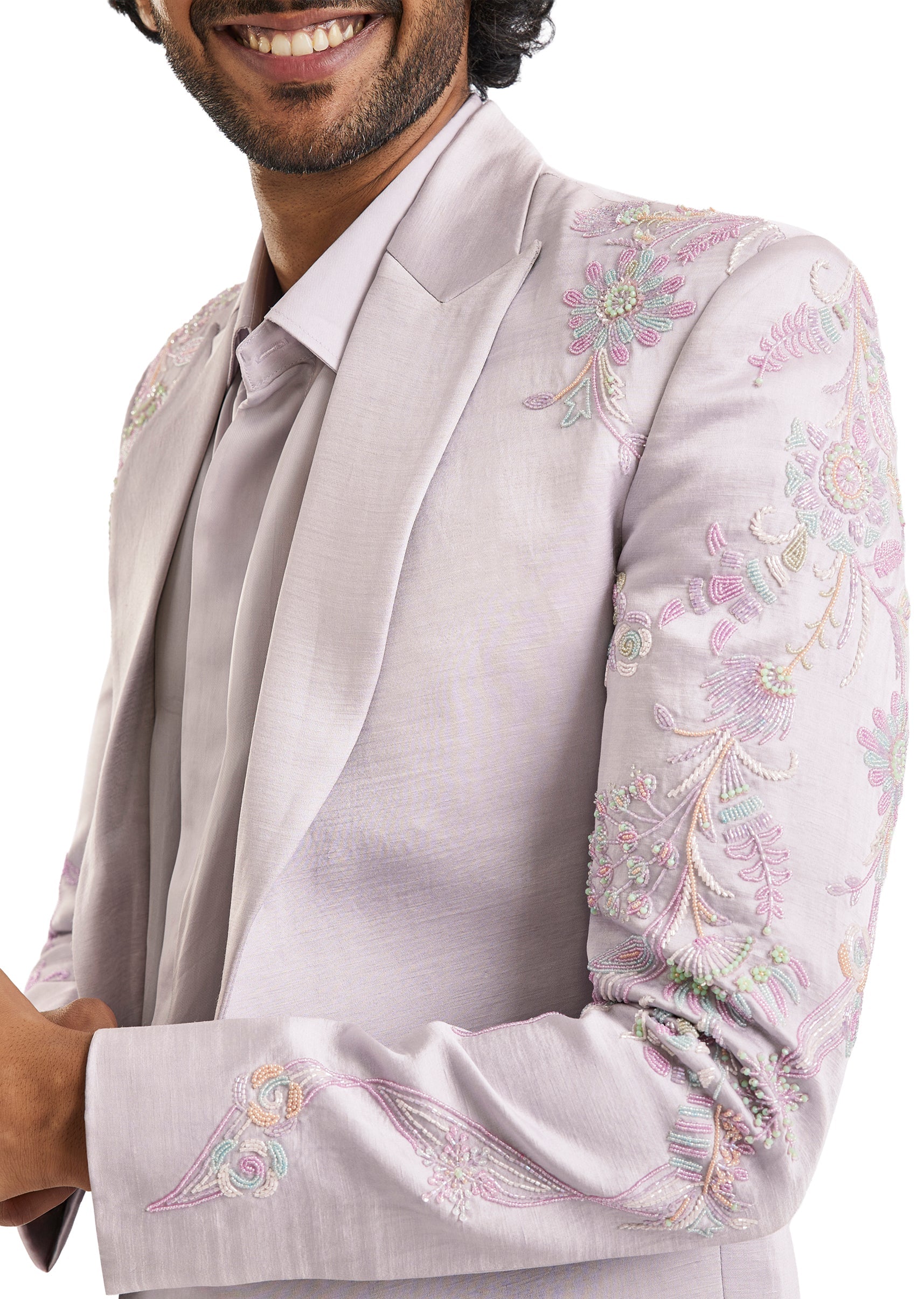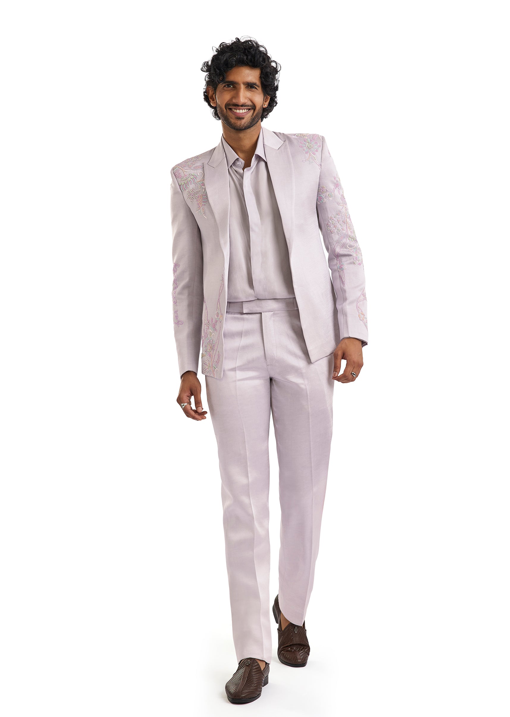 A contemporary lavender blazer set featuring subtle cut dana and bead embroidery. Paired with a shirt and tailored pants, it offers a fresh and polished take on occasion wear for cocktail and engagement celebrations.