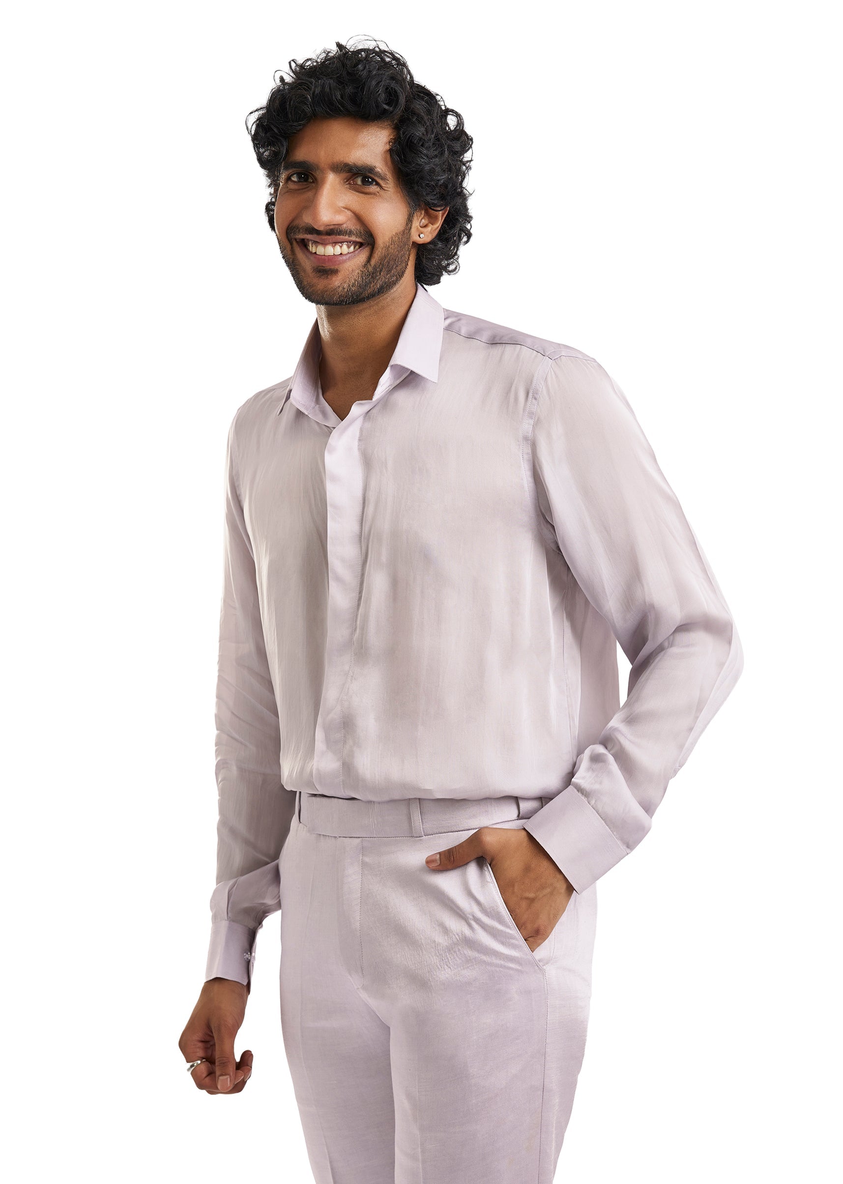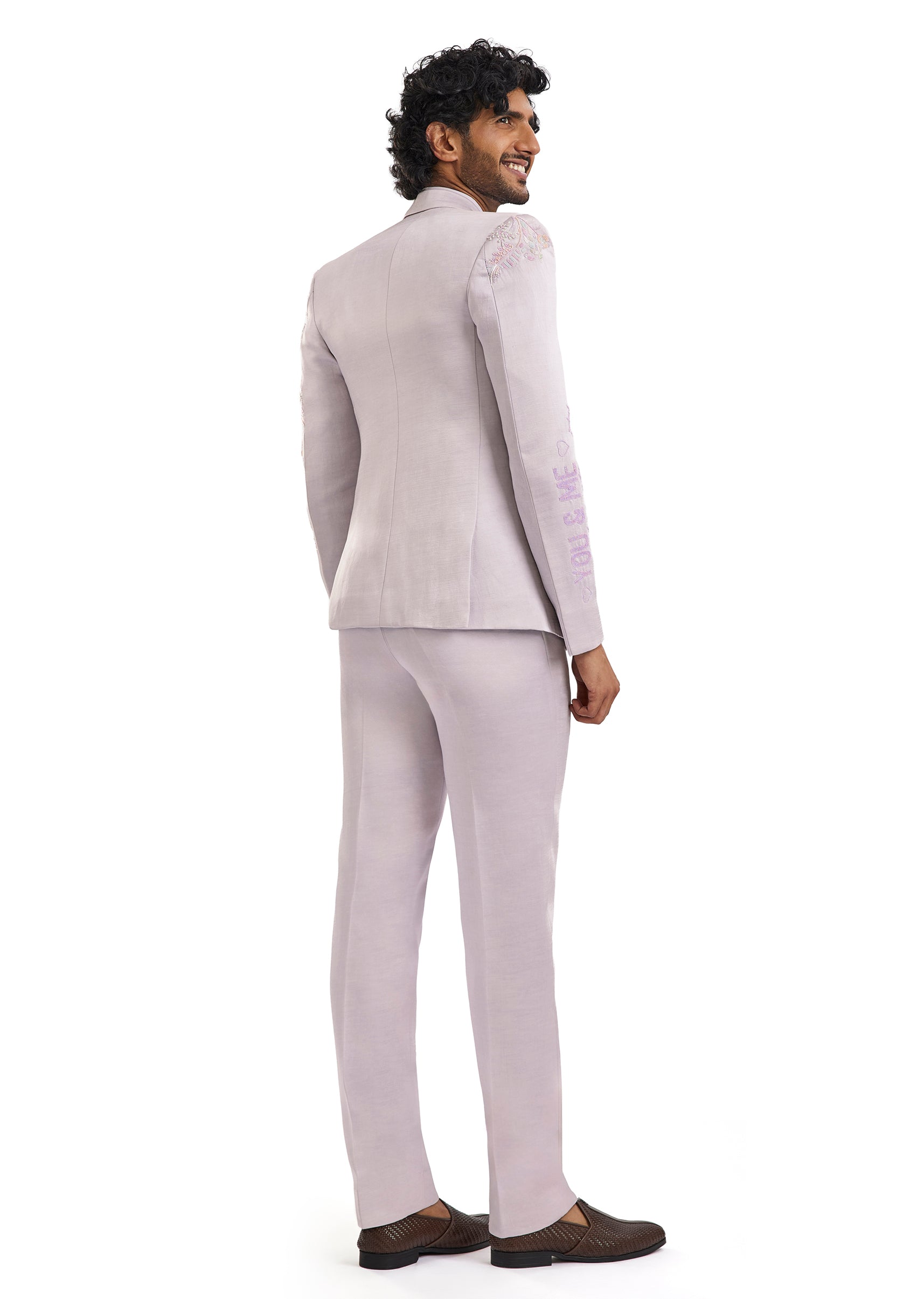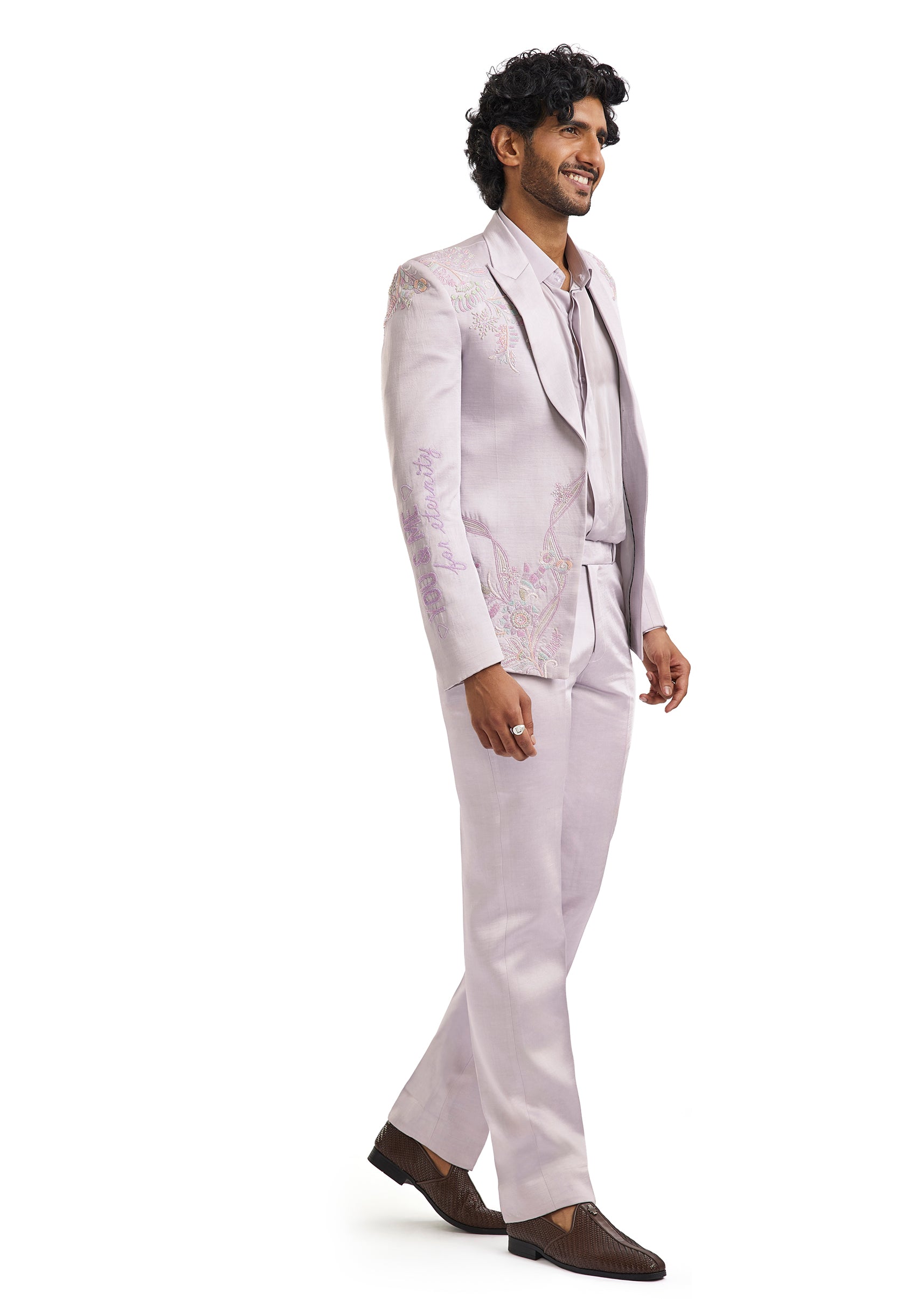 A contemporary lavender blazer set featuring subtle cut dana and bead embroidery. Paired with a shirt and tailored pants, it offers a fresh and polished take on occasion wear for cocktail and engagement celebrations.