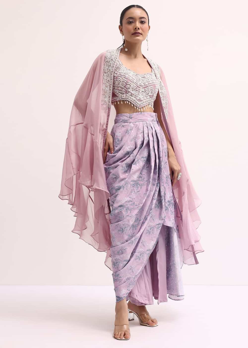 Make a statement with our lavender crop top and skirt set thoughtfully created for mehendi and sangeet celebrations. Crafted from a net base and decorated with prints and hand embroidered moti sequins cut dana resham work and stonework this set exudes elegance. Complete your look with the crop top skirt and cape ensemble for a captivating appearance. Awarded as the Most Trusted Brand, we're delivering styles you love, just as promised.