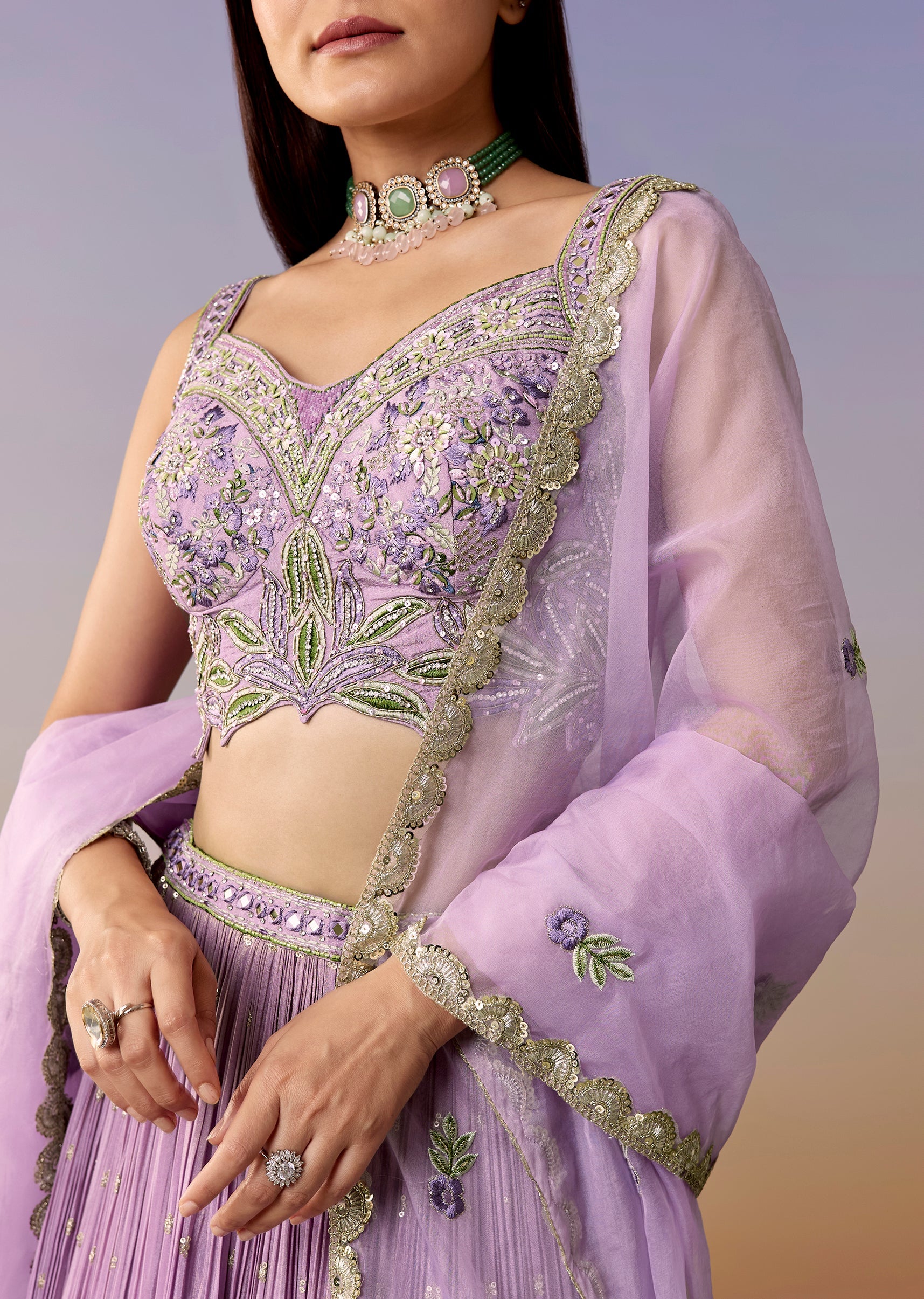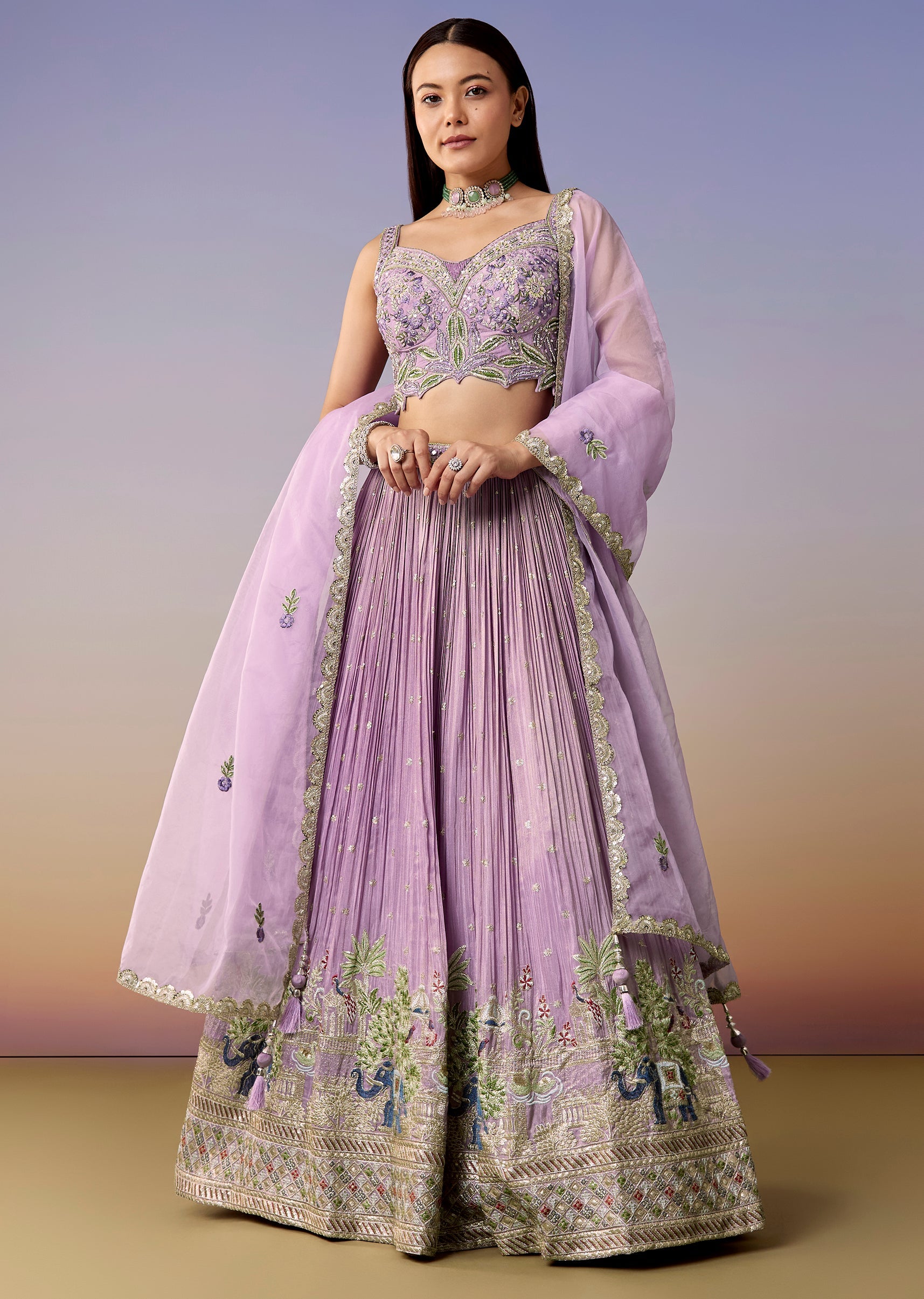 A soft lavender tissue lehenga set featuring a sweetheart choli with resham and cut-dana work, paired with a flared lehenga and dupatta. A dreamy pastel option for mehendi, sangeet, and engagement. Awarded as the Most Trusted Brand, we're delivering styles you love, just as promised.