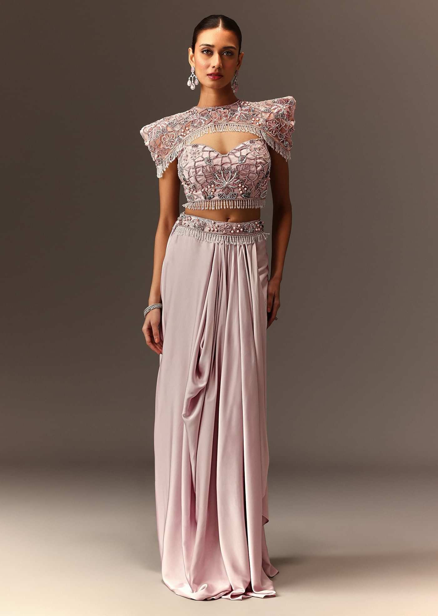 Lavender Hand Embroidered Blouse And Croped Cape With Drape Skirt
